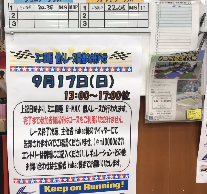 #ミニ四駆 9月17日(日) 個人レース(B-MAX)のお知らせです! エントリーはタイムアタックボードの右隣に受付シートがありますので、そちらへご記入下さい。 レギュレーション、その他お問い合わせは主催者様までお願い致…