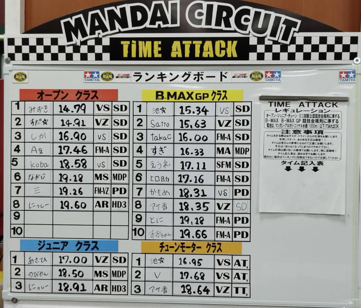 #ミニ四駆 フラットコース暫定ランキング発表っ! オープン みずき様 B-MAX 池☆様 チューン 池☆様 ジュニア あさひ様 でした! 立体コースに戻るまで約1週間! アナタはこの記録を破れるかっ!? pic.twit…