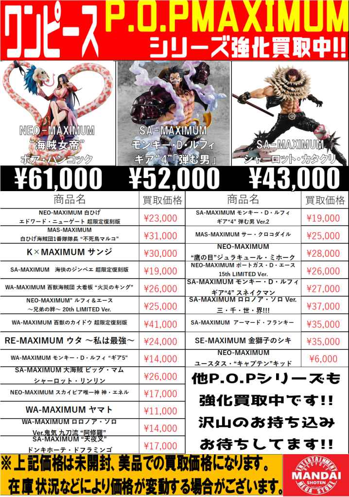 フィギュア買取告知更新しました‼️ ワンピースP.O.Pmaximum シリーズ告知とチェンソーマンスケールフィギュア告知を新たに追加しました! この機会に是非お持ち込みくださいᾑ…