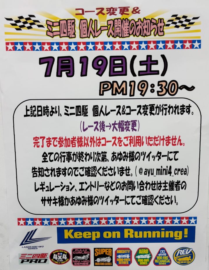 #ミニ四駆 さて、今月のレースのお知らせです✨ 7/19 ナイトレース →主催者様へ 7/27 ストック・オープンクラス 今月の月例大会はストッククラス開催! ストッククラスはレギュをご確認下さい…