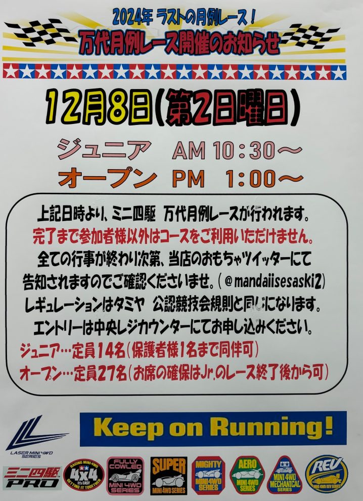 #ミニ四駆 来月の月例レースのお知らせです! 担当都合により、第二日曜日になります💦🙇♀️💦 今年最後の月齢となりますので皆様ぜ…