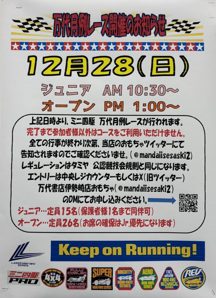 #ミニ四駆 今年最後の月例レース!ジュニア、オープンクラスともにまだお席あります😊お時間ある方はぜひご参加ください🙇♀️ エントリーは店頭・DM…