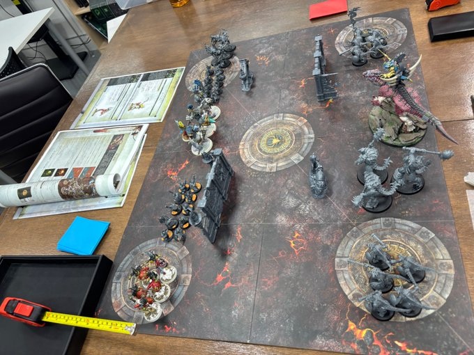 #warhammer 今日は担当が #スピアヘッド を覚えるべく初プレイ😄ルール確認しながらゆっくりやってます☺️ アンダーワールド会ですが、欠員が2名出たのでテーブルに空きが…