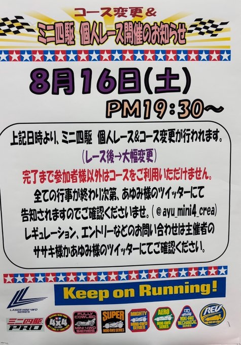 #ミニ四駆 今月のレースのお知らせです!お問い合わせ、エントリーは ☆ナイトレース→主催者様へ☆ステーションチャレンジ→DM・店頭にて 今月のステーションチャレンジ、ダッシュクラスは両軸モーター限定となりますのでご注意く…