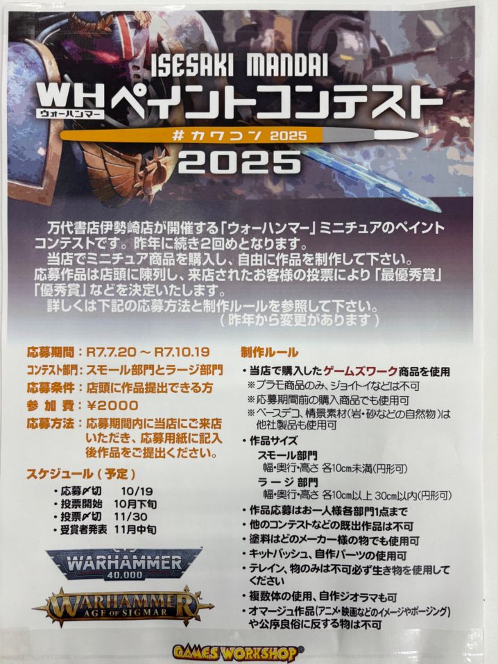#warhammer さぁ!今年もやります! 伊勢崎万代WHペイントコンテスト通称 #カワコン2025皆様の力作、お待ちしてます♡ それに伴い、現在入り口のショーケースに飾らせて頂いております作品のお迎えをお願い致します…
