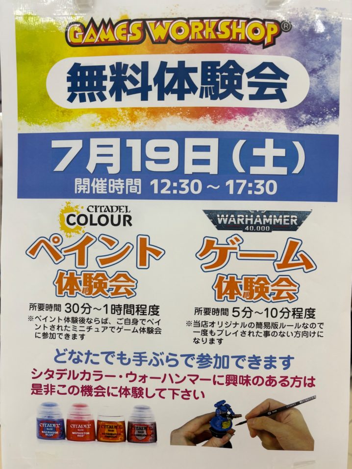 #warhammer テーブルの空き状況のお知らせです☺️7/19(土)体験会のため⑤ ペイント席4席 空き 7/20(日)ペイント会のため18:30くらいまで空きなし 8/2(土)個人ゲーム…