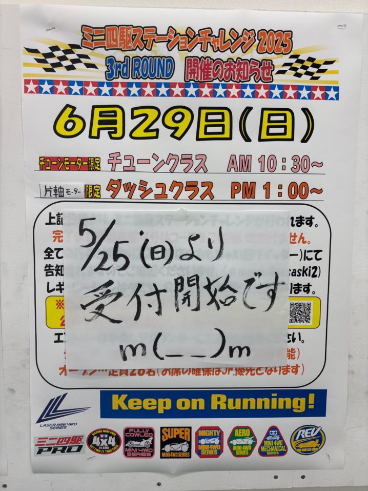 #ミニ四駆 6/29開催予定のステーションチャレンジですが、片軸モーター限定となります。 先日の告知では両軸限定となっておりました。 大変申し訳ございません🙇♀️…