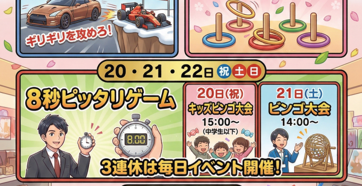 万代書店 岩槻店 3月イベント情報📣 ✼••┈┈┈┈┈┈┈┈┈┈┈┈┈┈┈┈┈┈••✼ ⭐プルバックチキンレース ⭐わなげ ⭐8秒ピッタリゲーム ⭐…