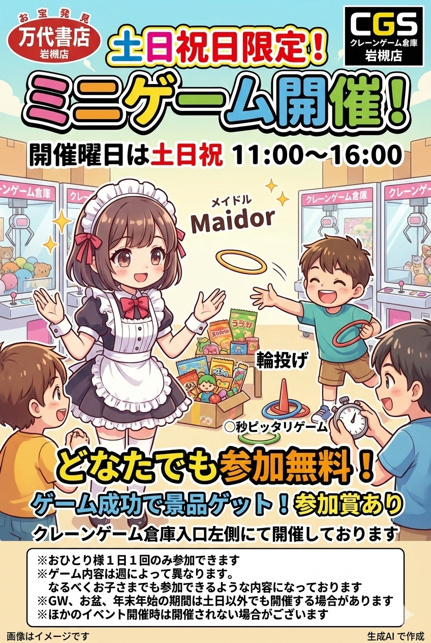 2026.03.01 イベント情報! takalab_1 ★3月イベント★ 万代書店 岩槻店 3月イベント情報📣 ✼••┈┈┈┈┈┈┈┈┈┈┈┈┈┈┈┈┈┈••✼ ⭐プルバックチキンレース ⭐わなげ ⭐8秒ピッタリゲーム ⭐ビンゴ大会 ⭐キッズビンゴ大会 ⭐危機一発ゲーム ✼••┈┈┈┈┈┈┈┈┈┈┈┈┈┈┈┈┈┈••✼ ご来店お待ちしております😄🎵 各イベント詳細は画像をご確認ください⇩ **************** こちら↓もぜひチェックしてみてくださいね♪(*´▽`*) ・最新の買取情報はこちら! ・最新のイベント情報はこちら! コメントを残す コメントをキャンセルメールアドレスが公開されることはありません。 ※ が付いている欄は必須項目ですコメント ※ 名前 ※ メール ※ サイト 新しいコメントをメールで通知 新しい投稿をメールで受け取る Δ このサイトはスパムを低減するために Akismet を使っています。コメントデータの処理方法の詳細はこちらをご覧ください。