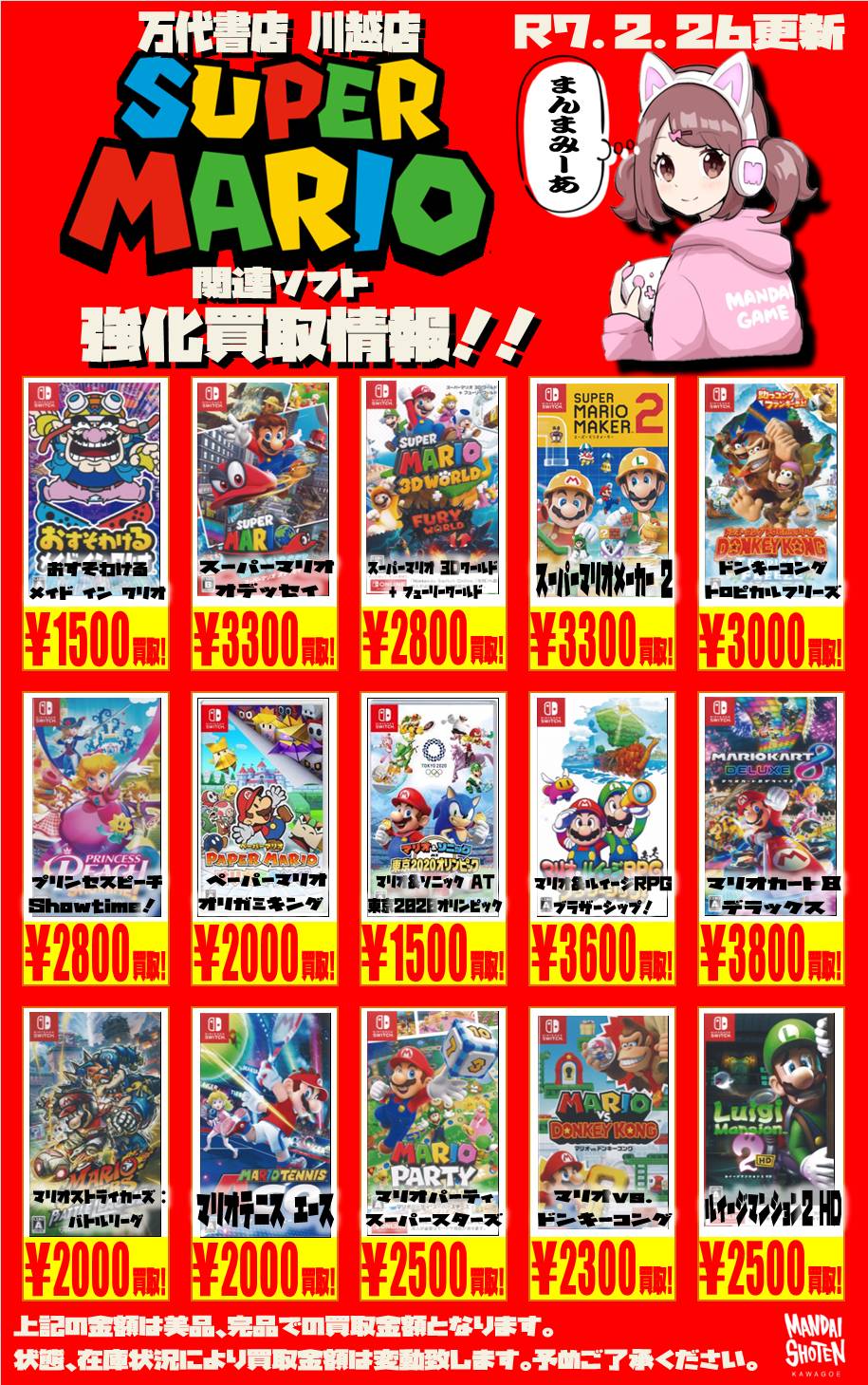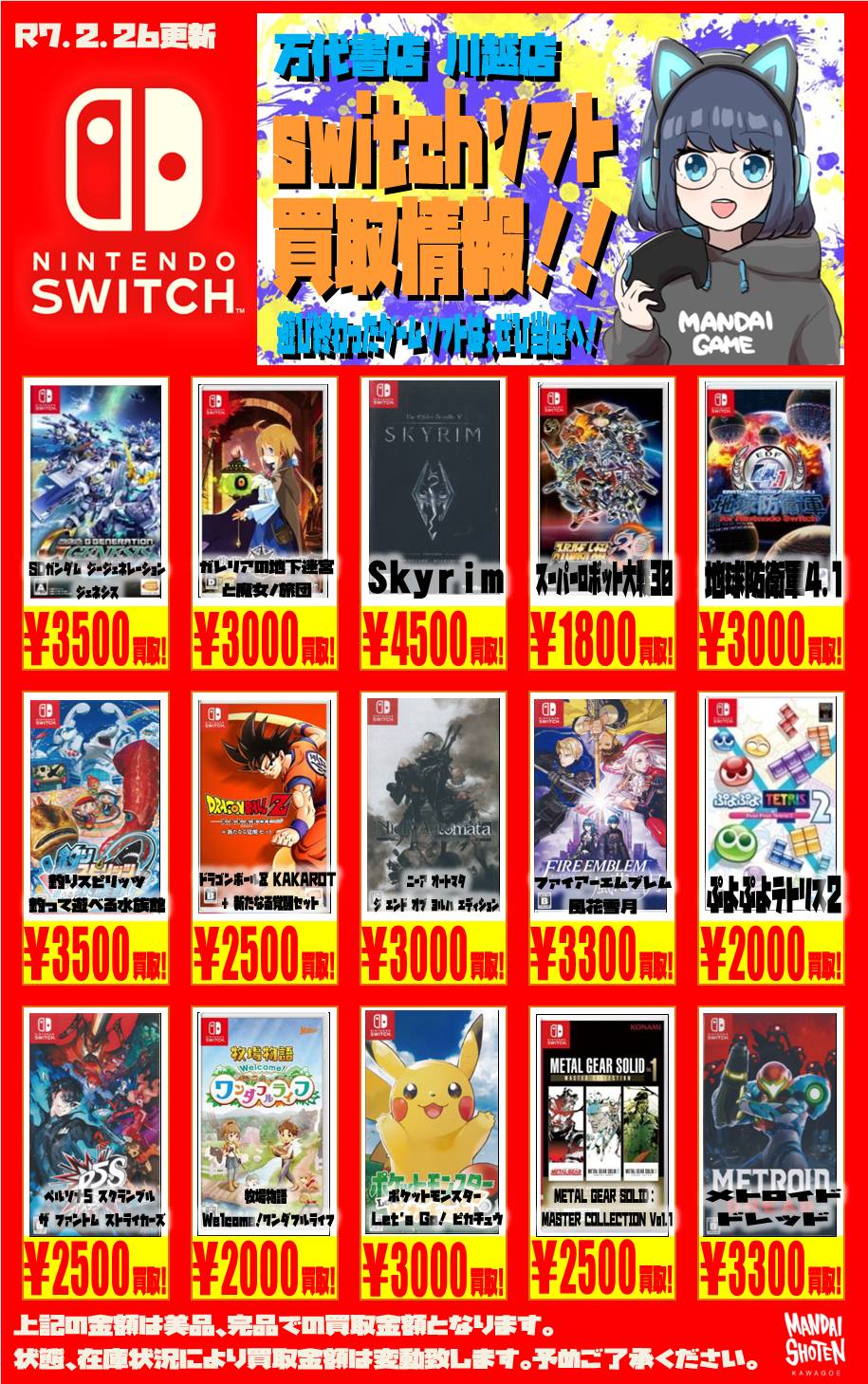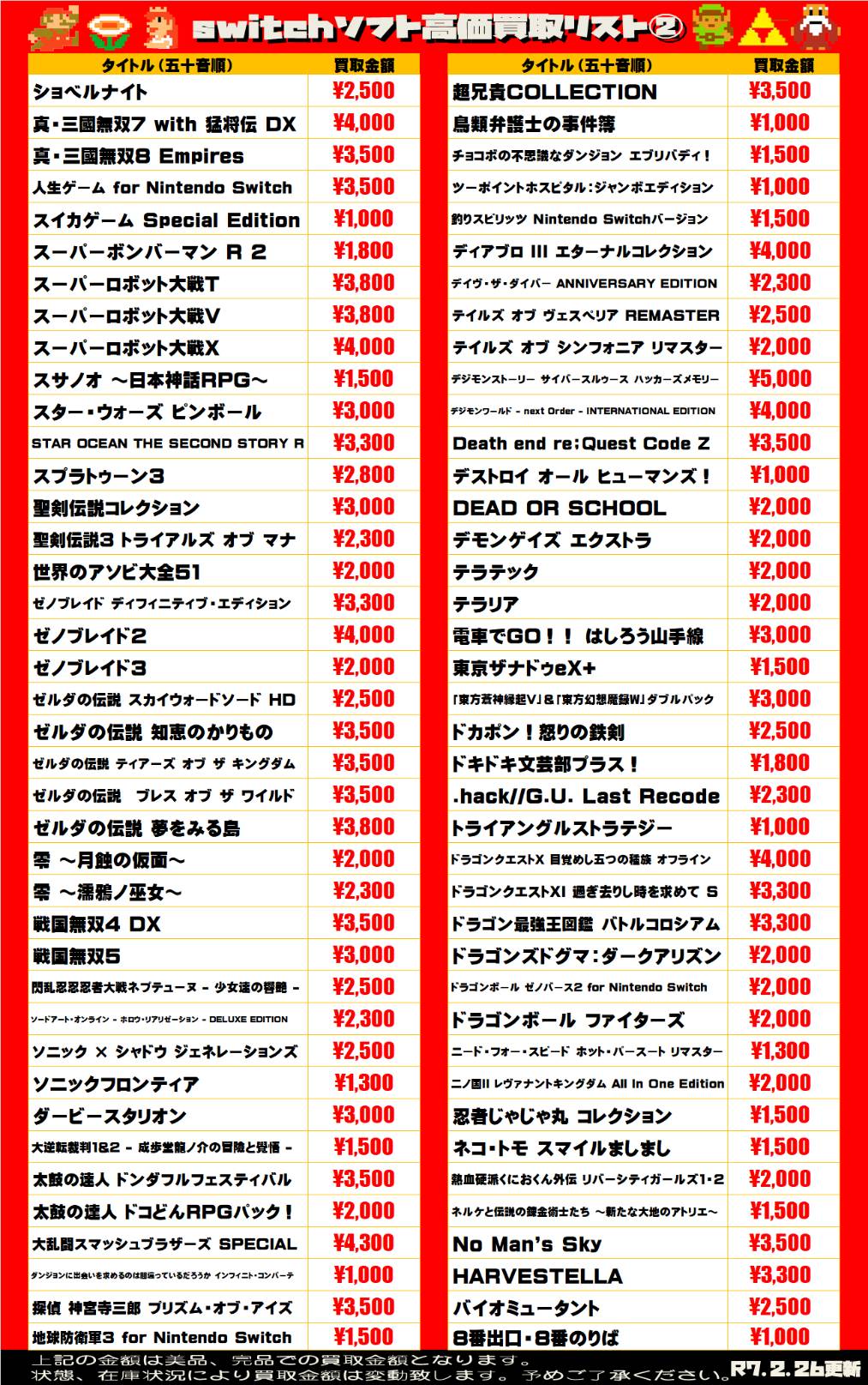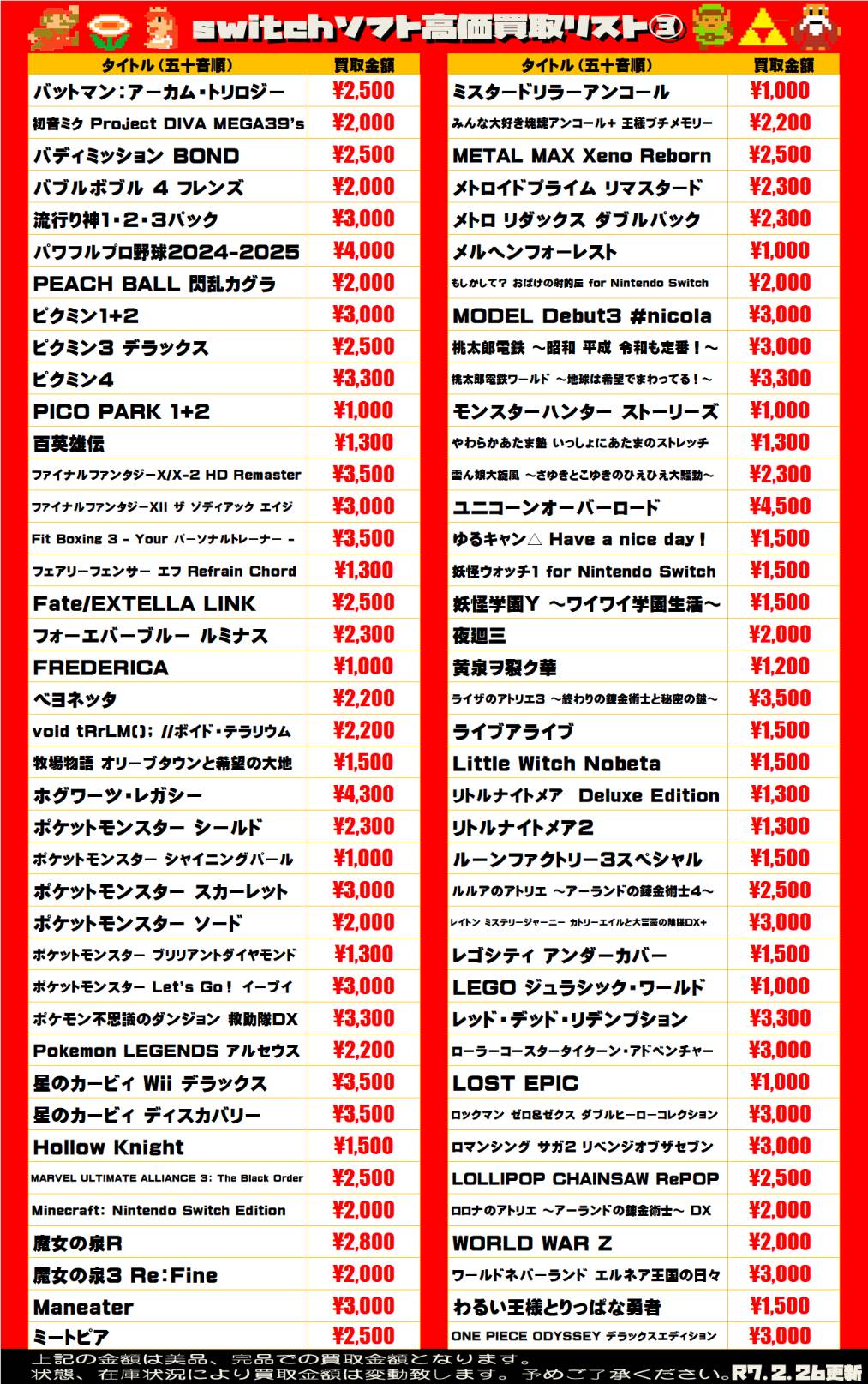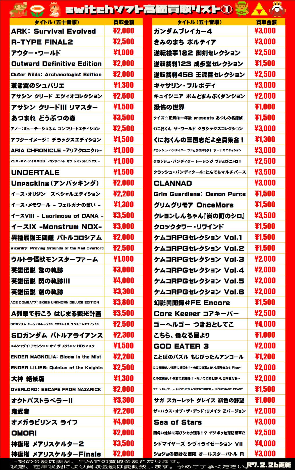 2025.02.27 買取情報 takalab_5 【Switchソフト】WEBチラシ更新しました!【WEBチラシ】 【Switchソフト】WEBチラシ更新しました!【WEBチラシ】 この機会にぜひ遊び終わったゲームソフトをお持ちください! ↓↓↓各ソフトWEBチラシはコチラ↓↓↓ sony系ゲームソフト WEBチラシはコチラ 任天堂系ゲームソフト WEBチラシはコチラ **************** こちら↓もぜひチェックしてみてくださいね♪(*´▽`*) ・最新のイベント情報はこちら ・最新の買取情報はこちら コメントを残す コメントをキャンセルメールアドレスが公開されることはありません。 ※ が付いている欄は必須項目ですコメント ※ 名前 ※ メール ※ サイト 新しいコメントをメールで通知 新しい投稿をメールで受け取る Δ