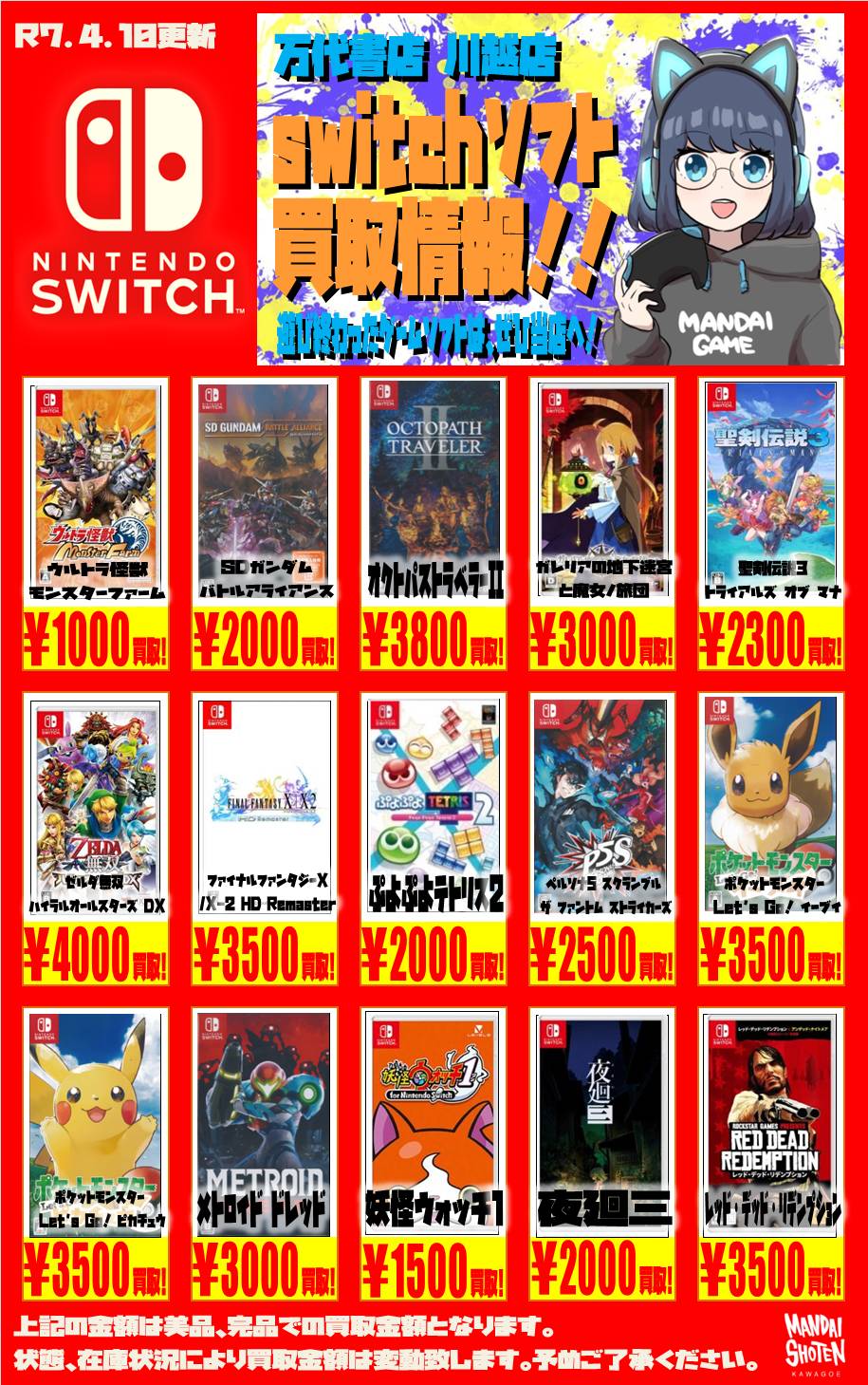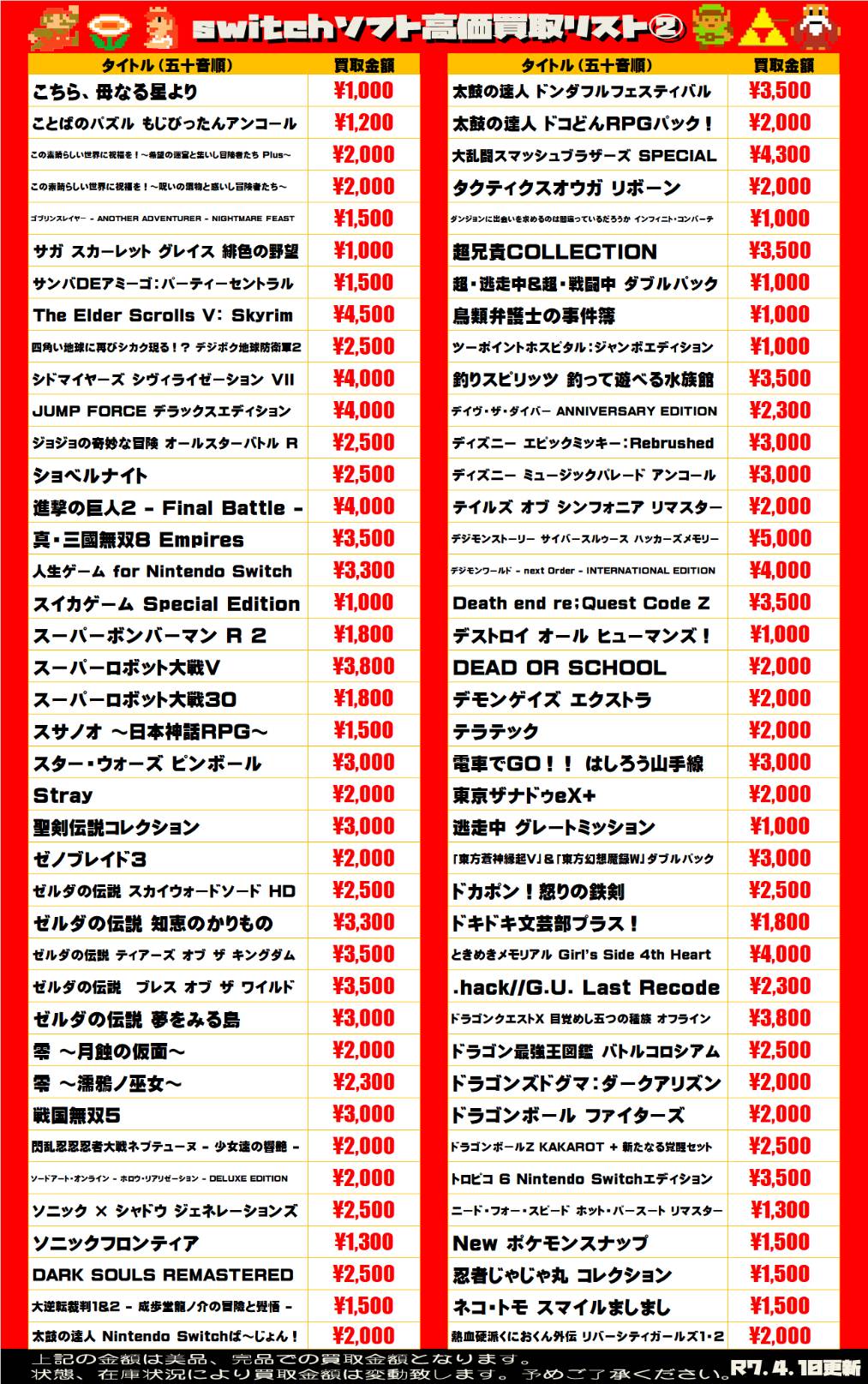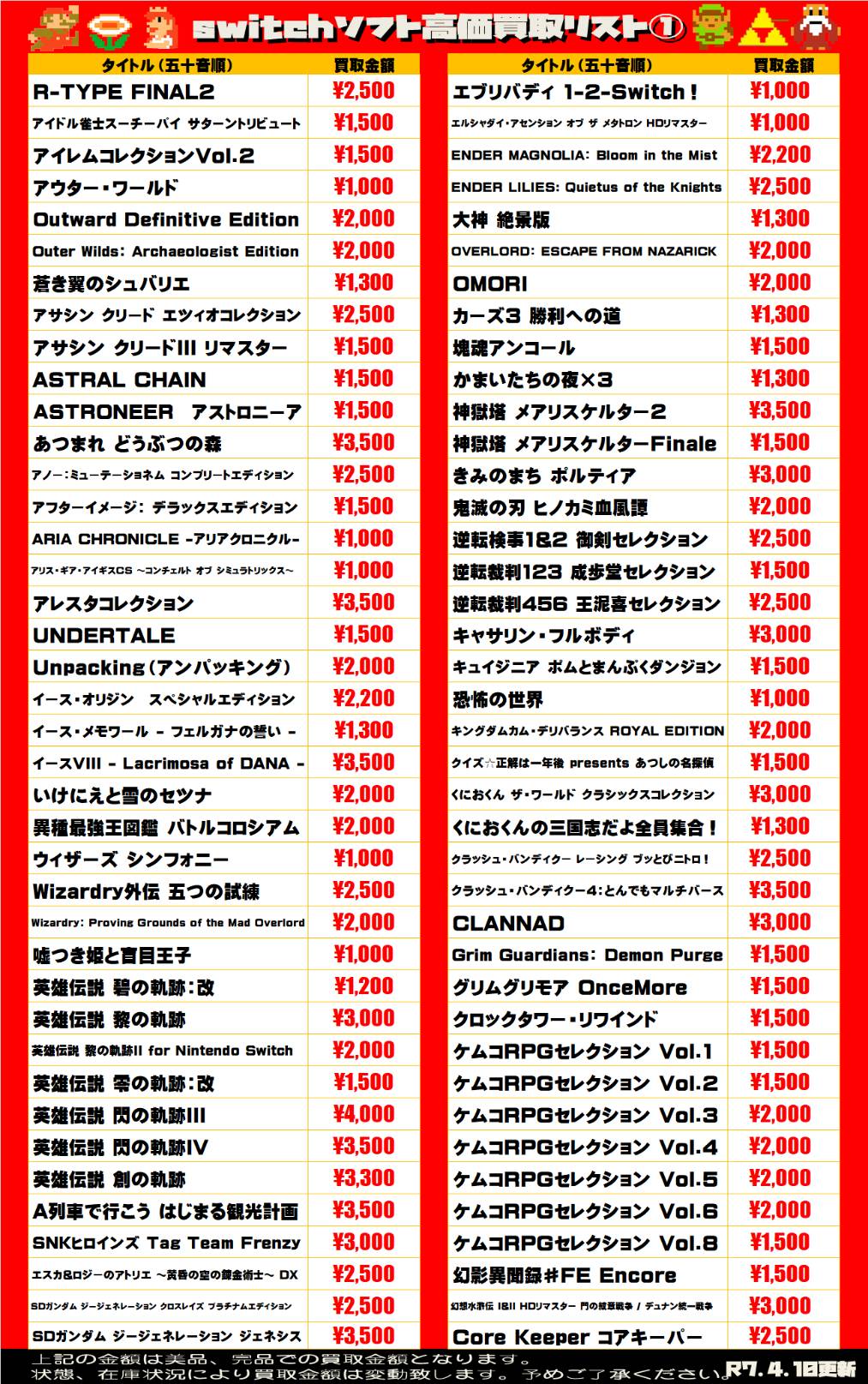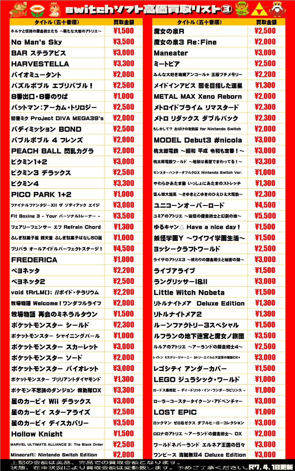 2025.04.10 買取情報 takalab_4 【Switchソフト】WEBチラシ更新しました!【WEBチラシ】 【Switchソフト】WEBチラシ更新しました!【WEBチラシ】 ※2025/4/10現在の価格となります。 在庫状況・状態によってお値段が変動いたします。予めご了承ください。 **************** こちら↓もぜひチェックしてみてくださいね♪(*´▽`*) ・最新のイベント情報はこちら ・最新の買取情報はこちら コメントを残す コメントをキャンセルメールアドレスが公開されることはありません。 ※ が付いている欄は必須項目ですコメント ※ 名前 ※ メール ※ サイト 新しいコメントをメールで通知 新しい投稿をメールで受け取る Δ