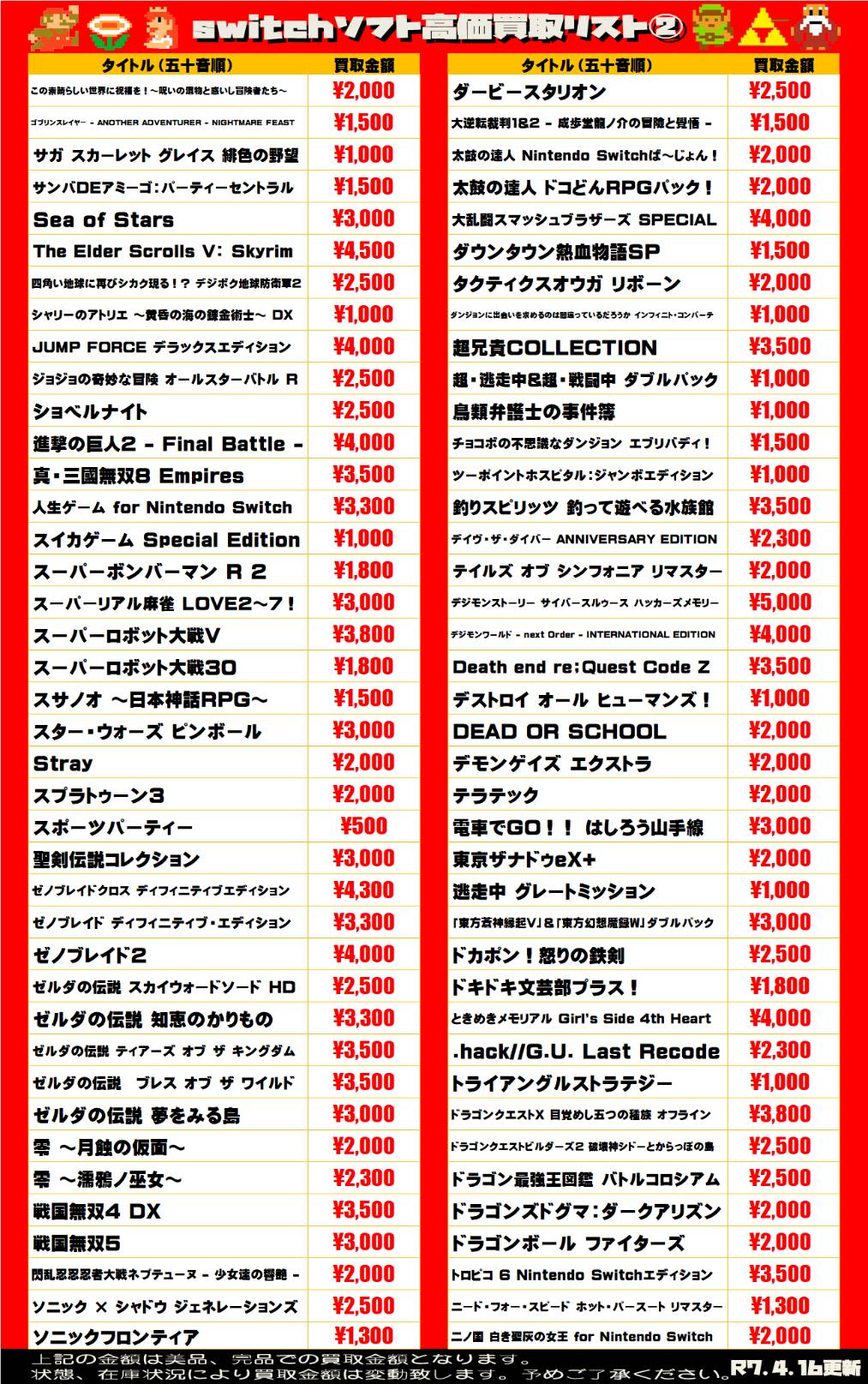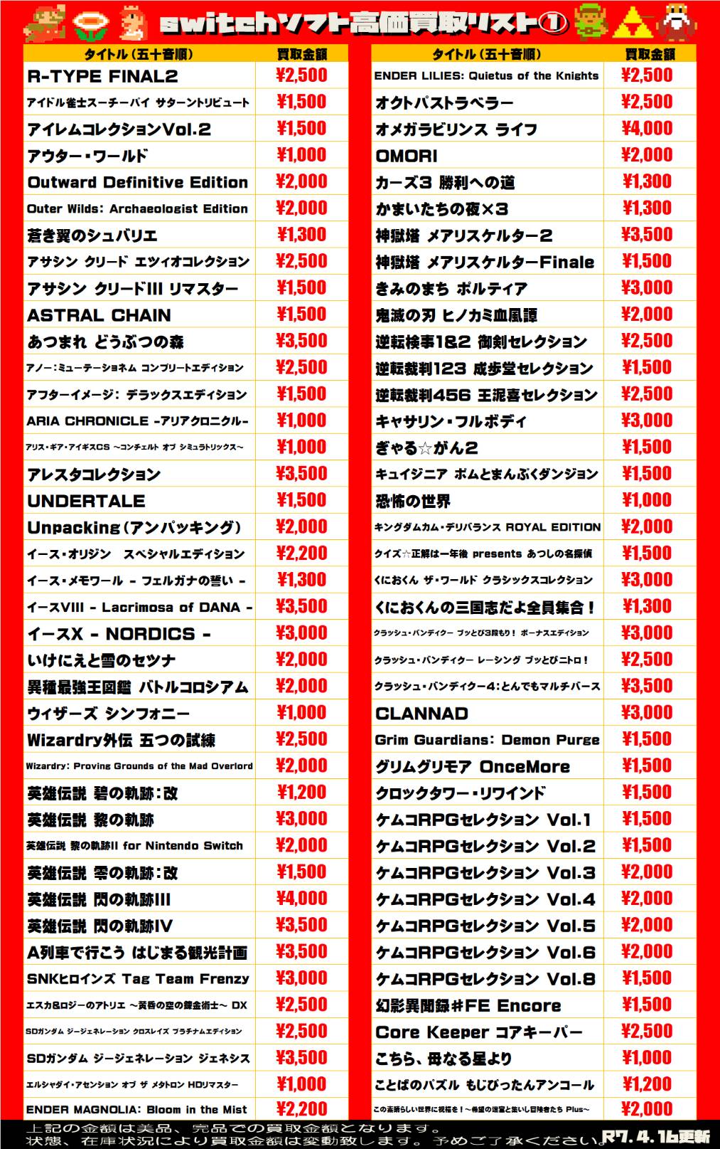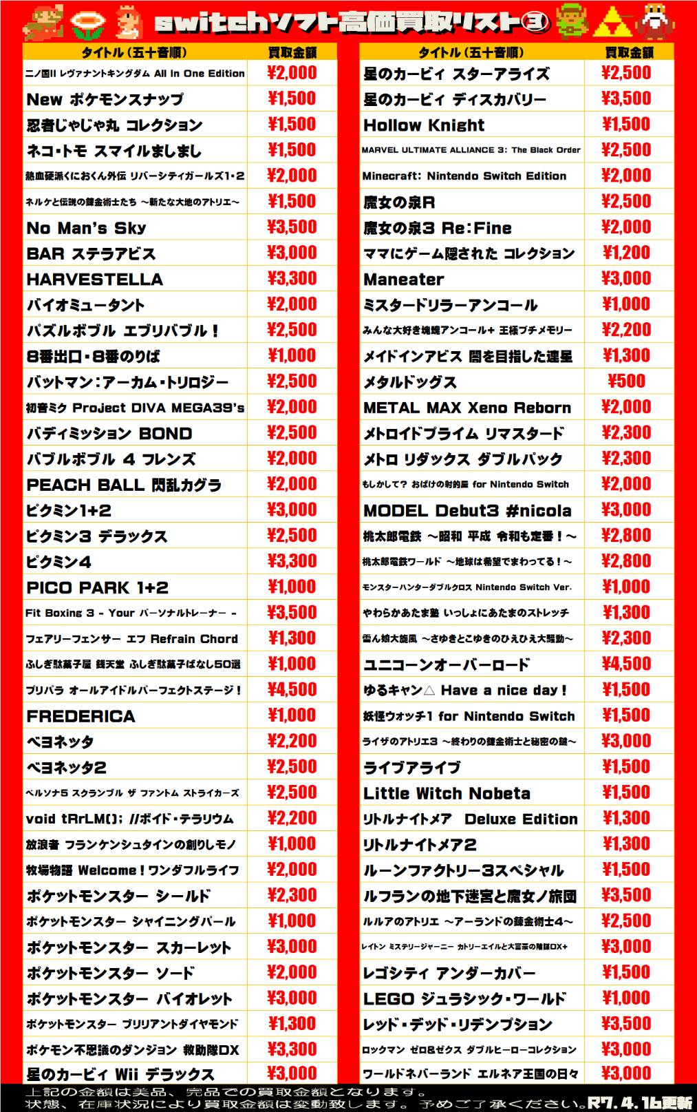 2025.04.17 買取情報 takalab_1 【Switchソフト】WEBチラシ更新しました!【WEBチラシ】 【Switchソフト】WEBチラシ更新しました!【WEBチラシ】 ※2025/4/17現在の価格となります。 在庫状況・状態によってお値段が変動いたします。予めご了承ください。 **************** こちら↓もぜひチェックしてみてくださいね♪(*´▽`*) ・最新のイベント情報はこちら ・最新の買取情報はこちら コメントを残す コメントをキャンセルメールアドレスが公開されることはありません。 ※ が付いている欄は必須項目ですコメント ※ 名前 ※ メール ※ サイト 新しいコメントをメールで通知 新しい投稿をメールで受け取る Δ