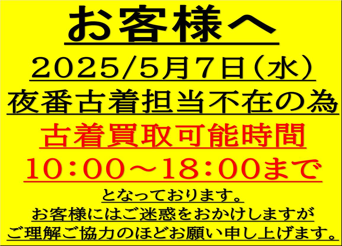2025.05.06 お知らせ・ご案内 takalab_1 古着部門買取時間変更のお知らせ 2025年5/7水曜日、夜番古着担当不在の為買取可能時間に変更があります。 古着部門買取時間変更のお知らせ 2025年5/7水曜日、夜番古着担当不在の為買取可能時間に変更があります。 お客様には大変ご迷惑おかけしますがよろしくお願いいたします。 コメントを残す コメントをキャンセルメールアドレスが公開されることはありません。 ※ が付いている欄は必須項目ですコメント ※ 名前 ※ メール ※ サイト 新しいコメントをメールで通知 新しい投稿をメールで受け取る Δ