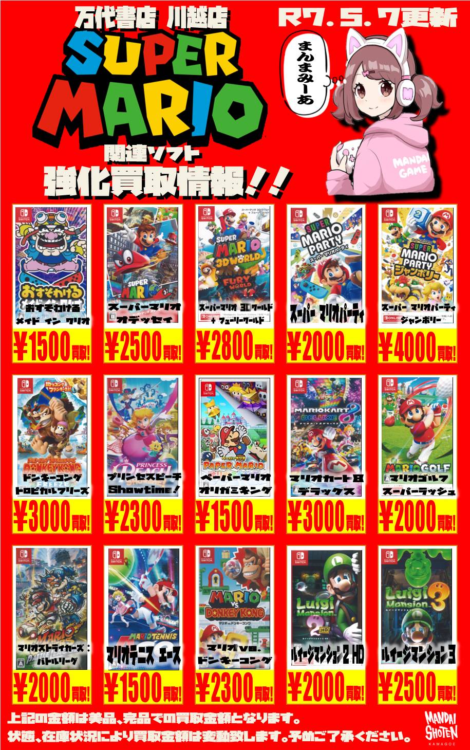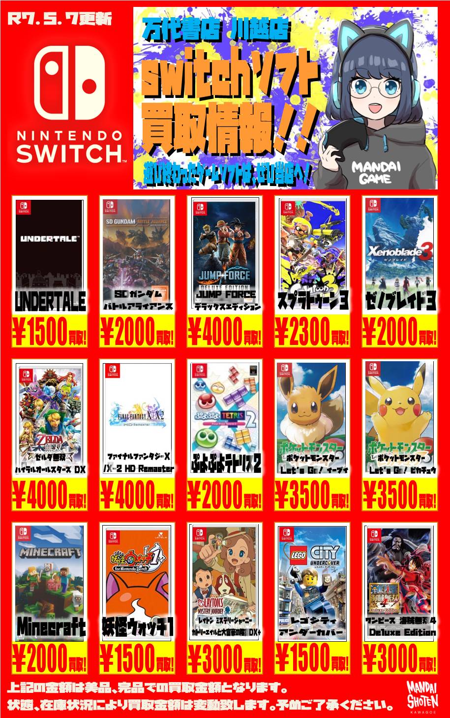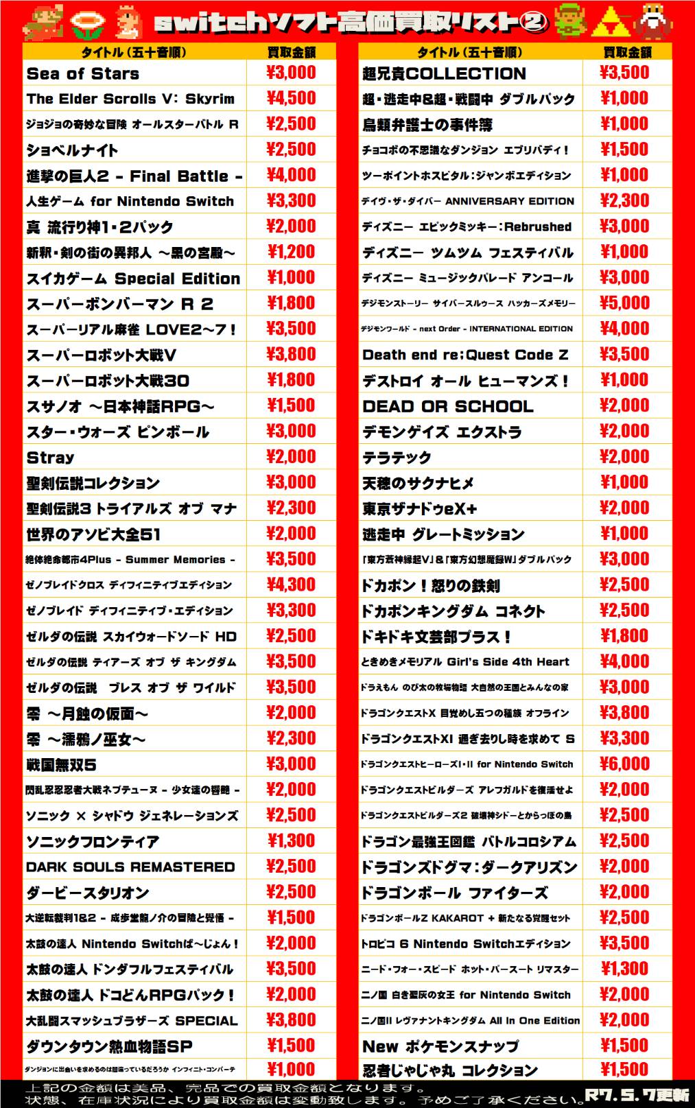 2025.05.08 買取情報 takalab_1 【Switchソフト】WEBチラシ更新しました!【WEBチラシ】 【Switchソフト】WEBチラシ更新しました!【WEBチラシ】 ※2025/5/8現在の価格となります。 在庫状況・状態によってお値段が変動いたします。予めご了承ください。 **************** こちら↓もぜひチェックしてみてくださいね♪(*´▽`*) ・最新のイベント情報はこちら ・最新の買取情報はこちら コメントを残す コメントをキャンセルメールアドレスが公開されることはありません。 ※ が付いている欄は必須項目ですコメント ※ 名前 ※ メール ※ サイト 新しいコメントをメールで通知 新しい投稿をメールで受け取る Δ