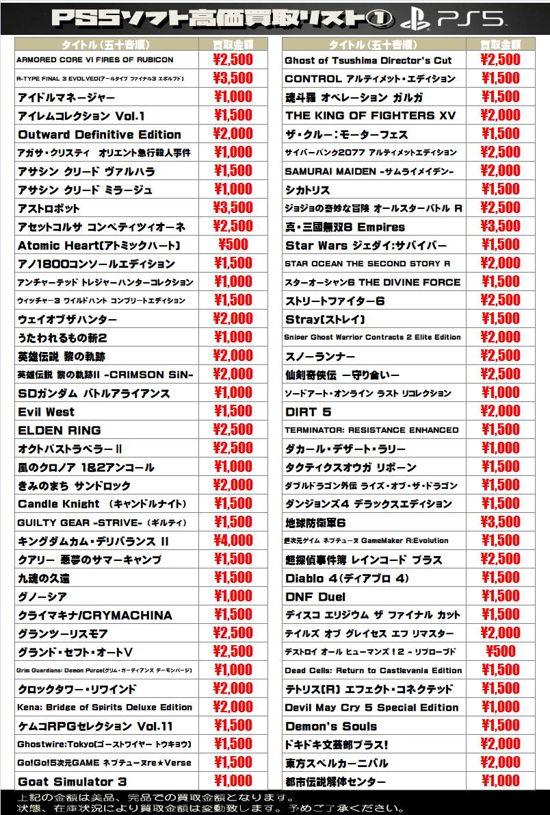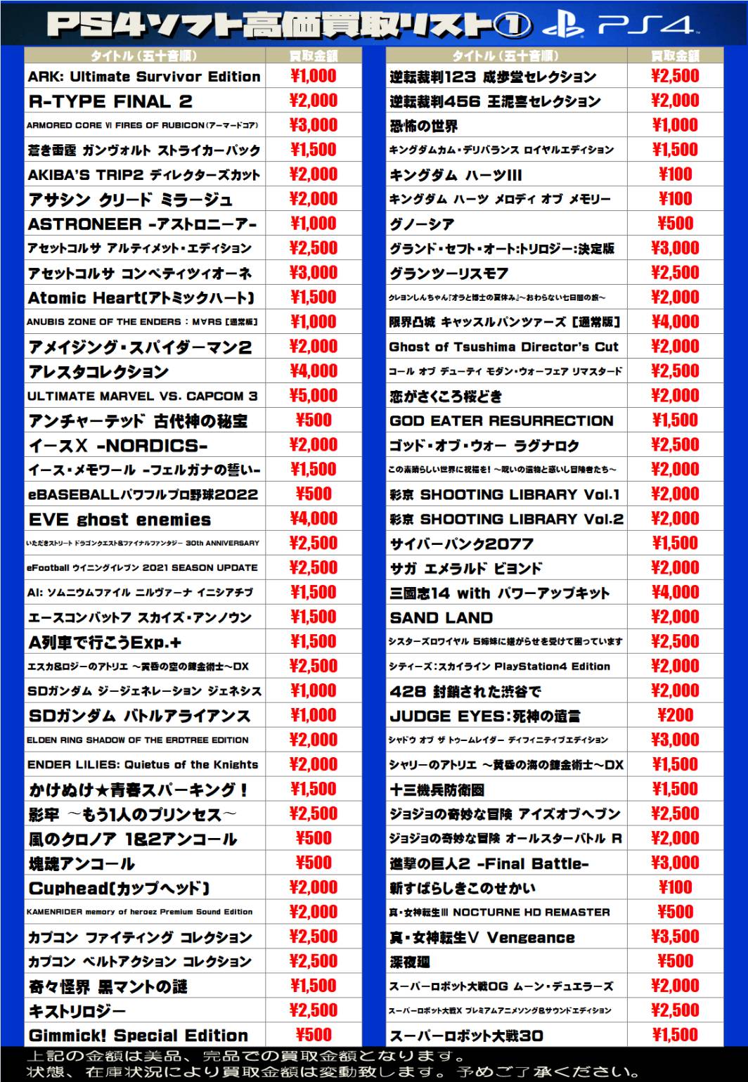 2025.05.08 買取情報 takalab_1 【SONY系ソフト】WEBチラシ更新しました!【WEBチラシ】 【SONY系ソフト】WEBチラシ更新しました!【WEBチラシ】 ※2025/5/8現在の価格となります。 在庫状況・状態によってお値段が変動いたします。予めご了承ください。 **************** こちら↓もぜひチェックしてみてくださいね♪(*´▽`*) ・最新のイベント情報はこちら ・最新の買取情報はこちら コメントを残す コメントをキャンセルメールアドレスが公開されることはありません。 ※ が付いている欄は必須項目ですコメント ※ 名前 ※ メール ※ サイト 新しいコメントをメールで通知 新しい投稿をメールで受け取る Δ