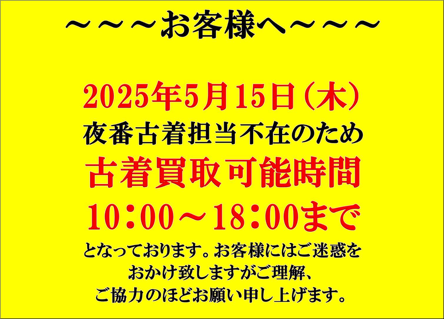 2025.05.15 お知らせ・ご案内 takalab_5 ■《5月15日》古着買取時間変更のお知らせ■ ■古着部門買取時間変更のお知らせ■ 2025/5/15木曜日、夜番古着担当不在の為買取可能時間に変更があります。 お客様には大変ご迷惑おかけしますがよろしくお願いいたします。 コメントを残す コメントをキャンセルメールアドレスが公開されることはありません。 ※ が付いている欄は必須項目ですコメント ※ 名前 ※ メール ※ サイト 新しいコメントをメールで通知 新しい投稿をメールで受け取る Δ