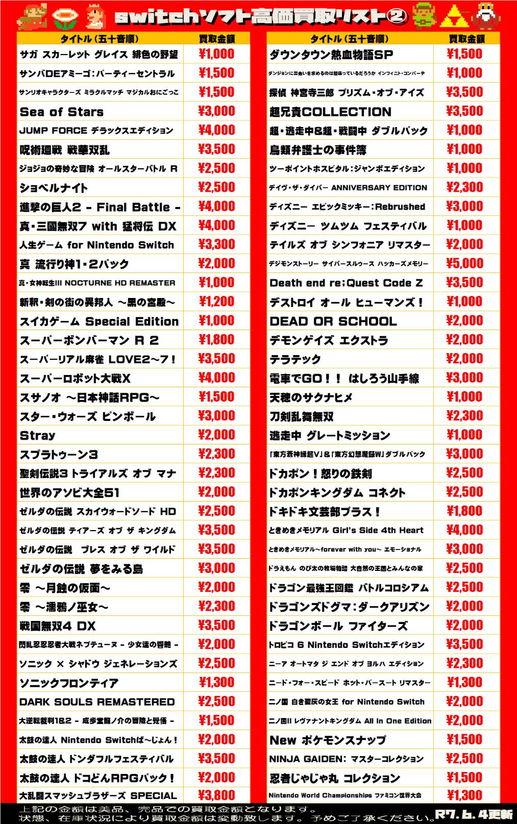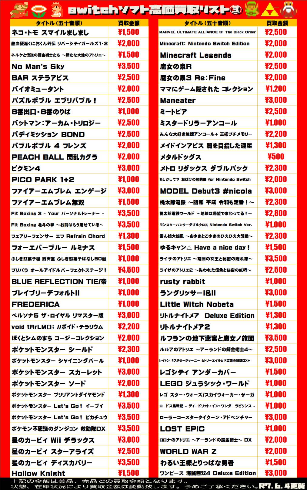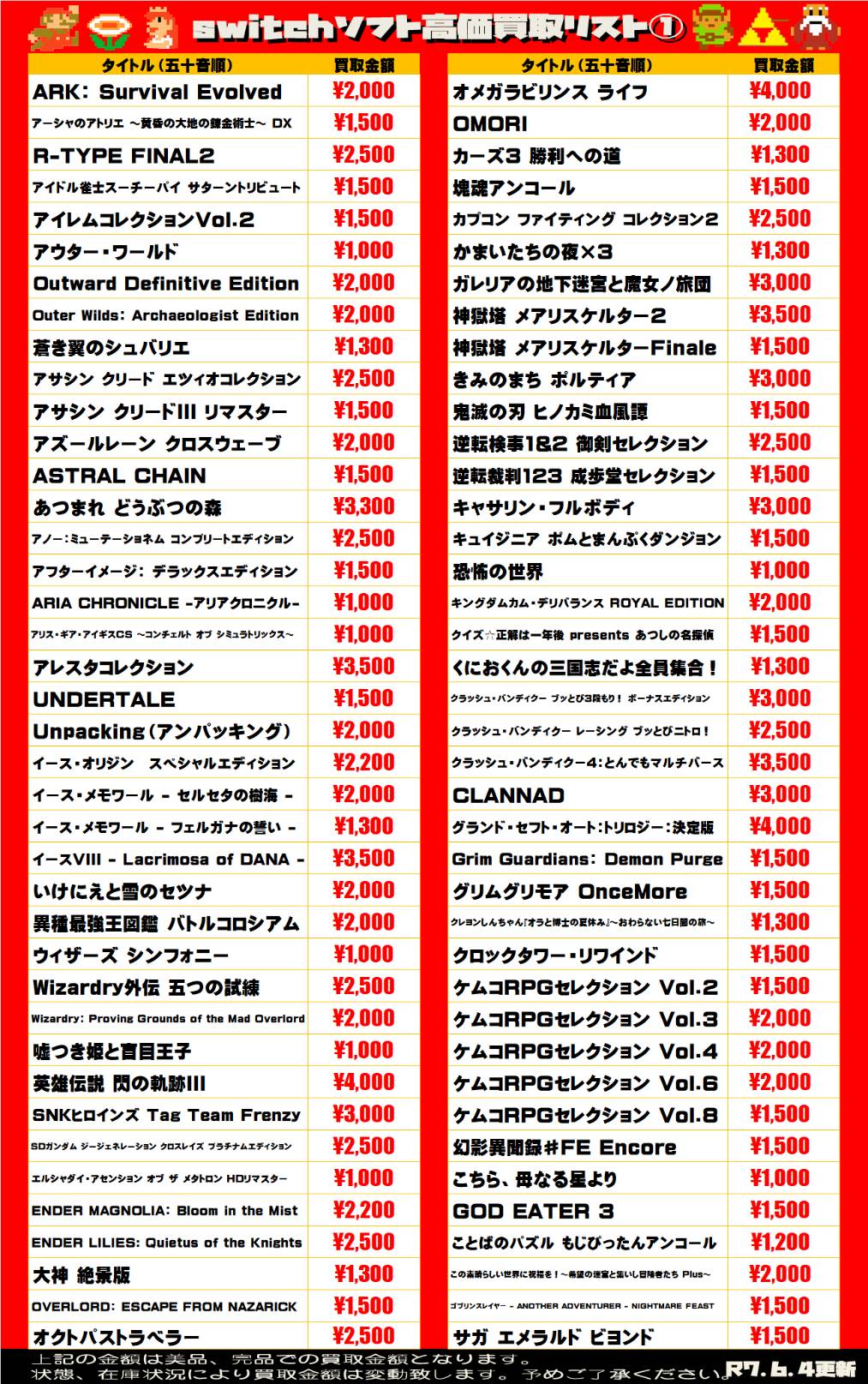 2025.06.04 買取情報 takalab_5 【Switchソフト】WEBチラシ更新しました!【WEBチラシ】 【Switchソフト】WEBチラシ更新しました!【WEBチラシ】 ※2025/6/4現在の価格となります。 在庫状況・状態によってお値段が変動いたします。予めご了承ください。 **************** こちら↓もぜひチェックしてみてくださいね♪(*´▽`*) ・最新のイベント情報はこちら ・最新の買取情報はこちら コメントを残す コメントをキャンセルメールアドレスが公開されることはありません。 ※ が付いている欄は必須項目ですコメント ※ 名前 ※ メール ※ サイト 新しいコメントをメールで通知 新しい投稿をメールで受け取る Δ