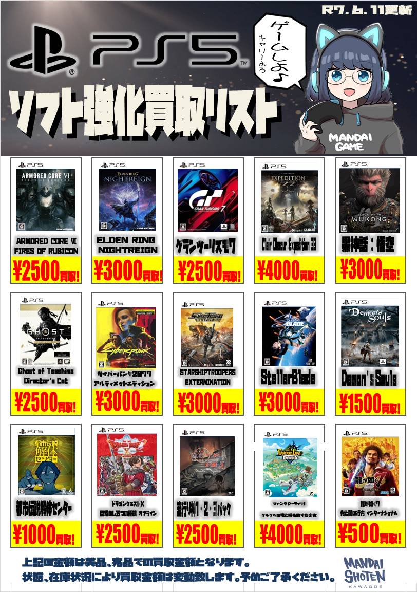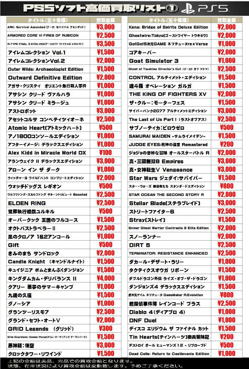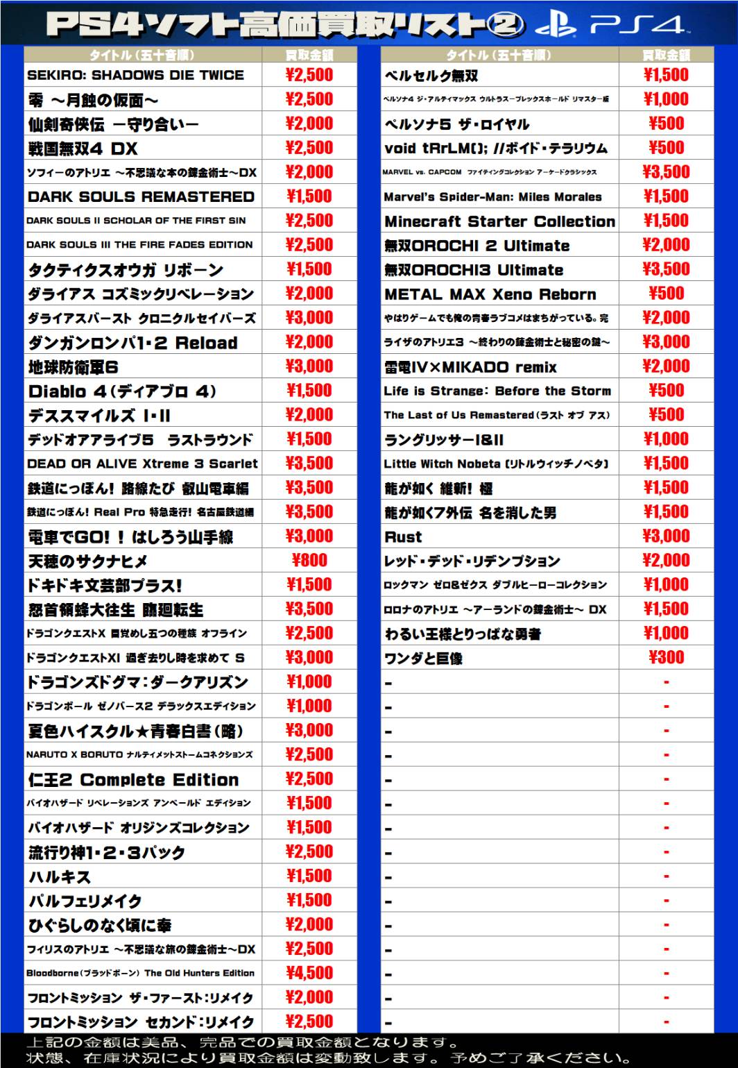 2025.06.12 買取情報 takalab_1 【SONY系ソフト】WEBチラシ更新しました!【WEBチラシ】 【SONY系ソフト】WEBチラシ更新しました!【WEBチラシ】 ※2025/6/12現在の価格となります。 在庫状況・状態によってお値段が変動いたします。予めご了承ください。 **************** こちら↓もぜひチェックしてみてくださいね♪(*´▽`*) ・最新のイベント情報はこちら ・最新の買取情報はこちら コメントを残す コメントをキャンセルメールアドレスが公開されることはありません。 ※ が付いている欄は必須項目ですコメント ※ 名前 ※ メール ※ サイト 新しいコメントをメールで通知 新しい投稿をメールで受け取る Δ