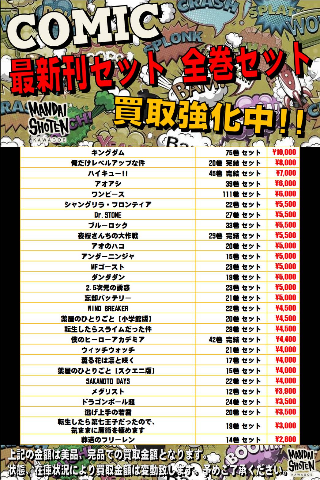 2025.06.12 買取情報 takalab_1 【コミック】WEBチラシ更新しました!【WEBチラシ】 【コミック】WEBチラシ更新しました!【WEBチラシ】 ※2025/6/12現在の価格となります。 在庫状況・状態によってお値段が変動いたします。予めご了承ください。 **************** こちら↓もぜひチェックしてみてくださいね♪(*´▽`*) ・最新のイベント情報はこちら ・最新の買取情報はこちら コメントを残す コメントをキャンセルメールアドレスが公開されることはありません。 ※ が付いている欄は必須項目ですコメント ※ 名前 ※ メール ※ サイト 新しいコメントをメールで通知 新しい投稿をメールで受け取る Δ