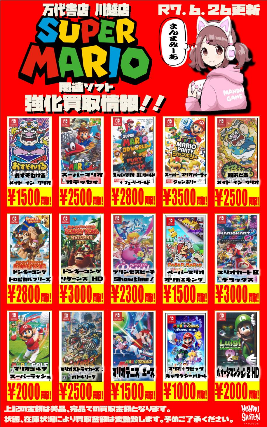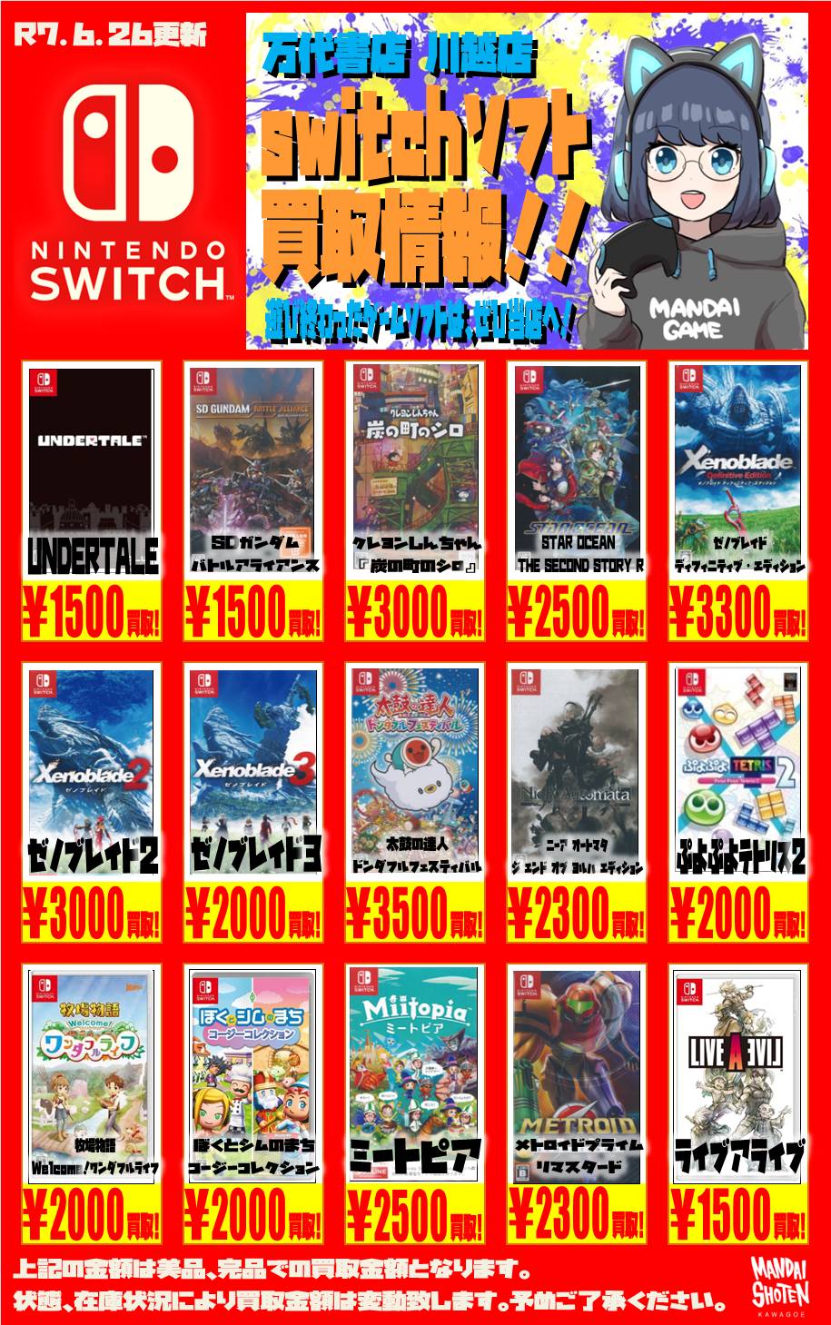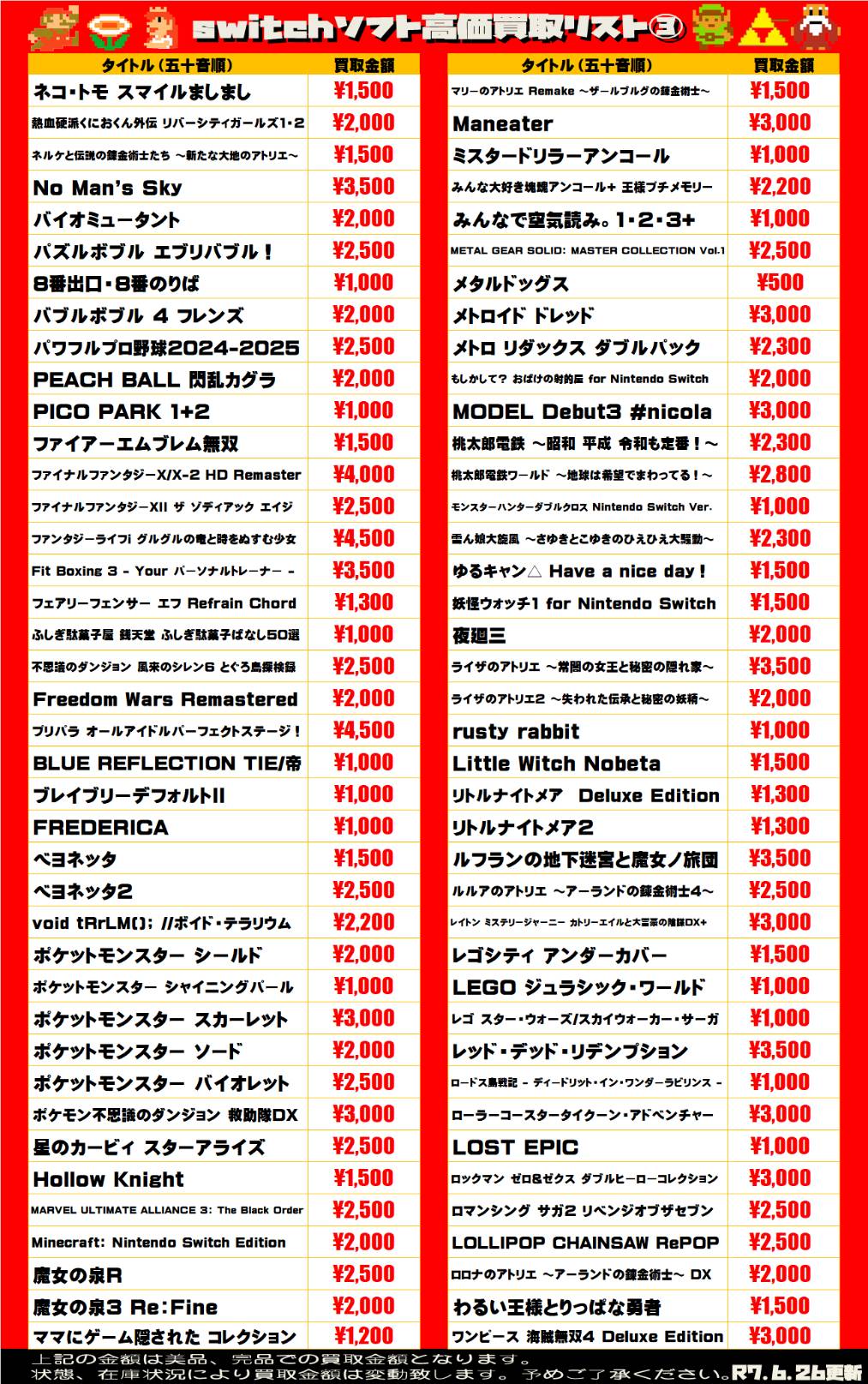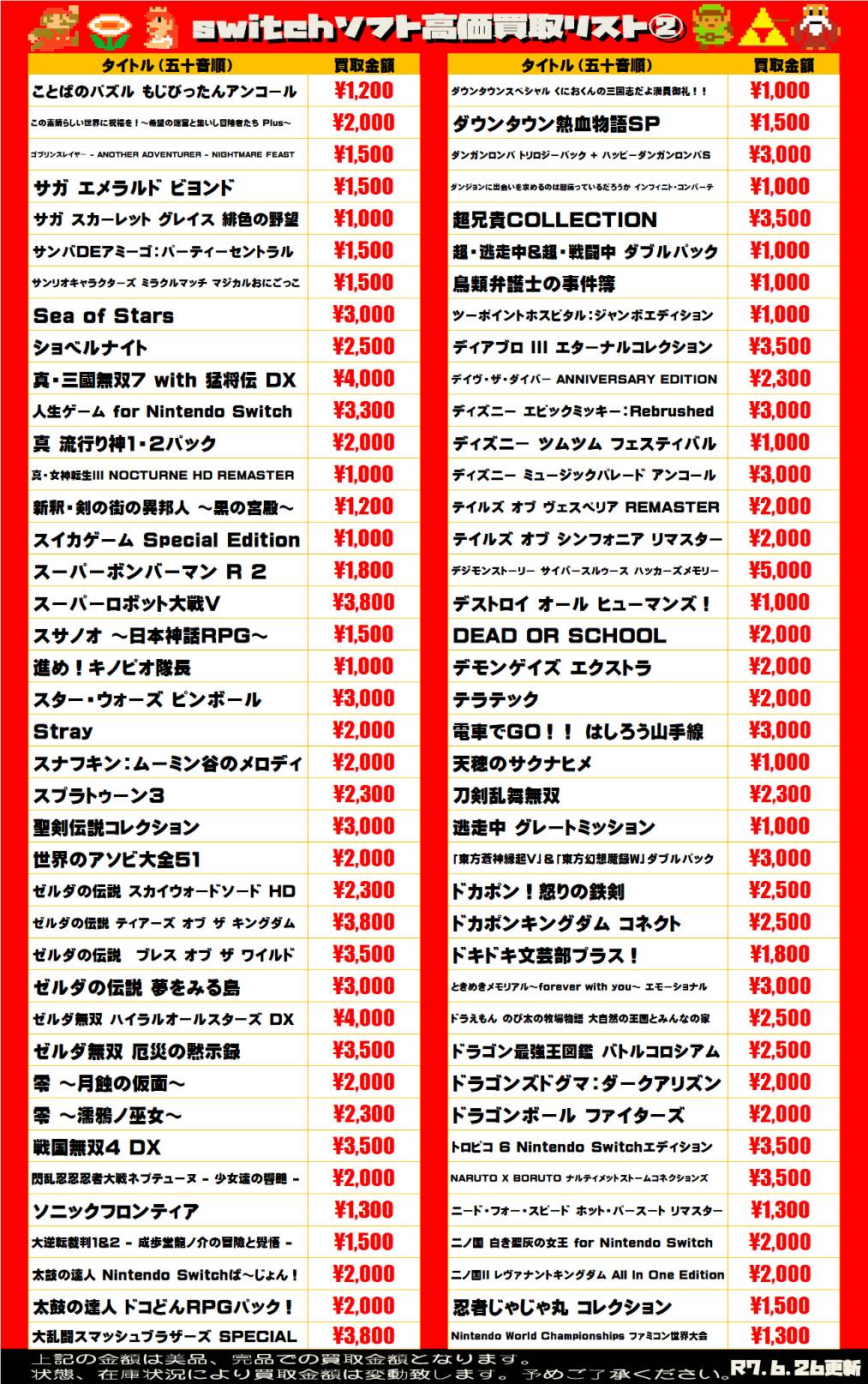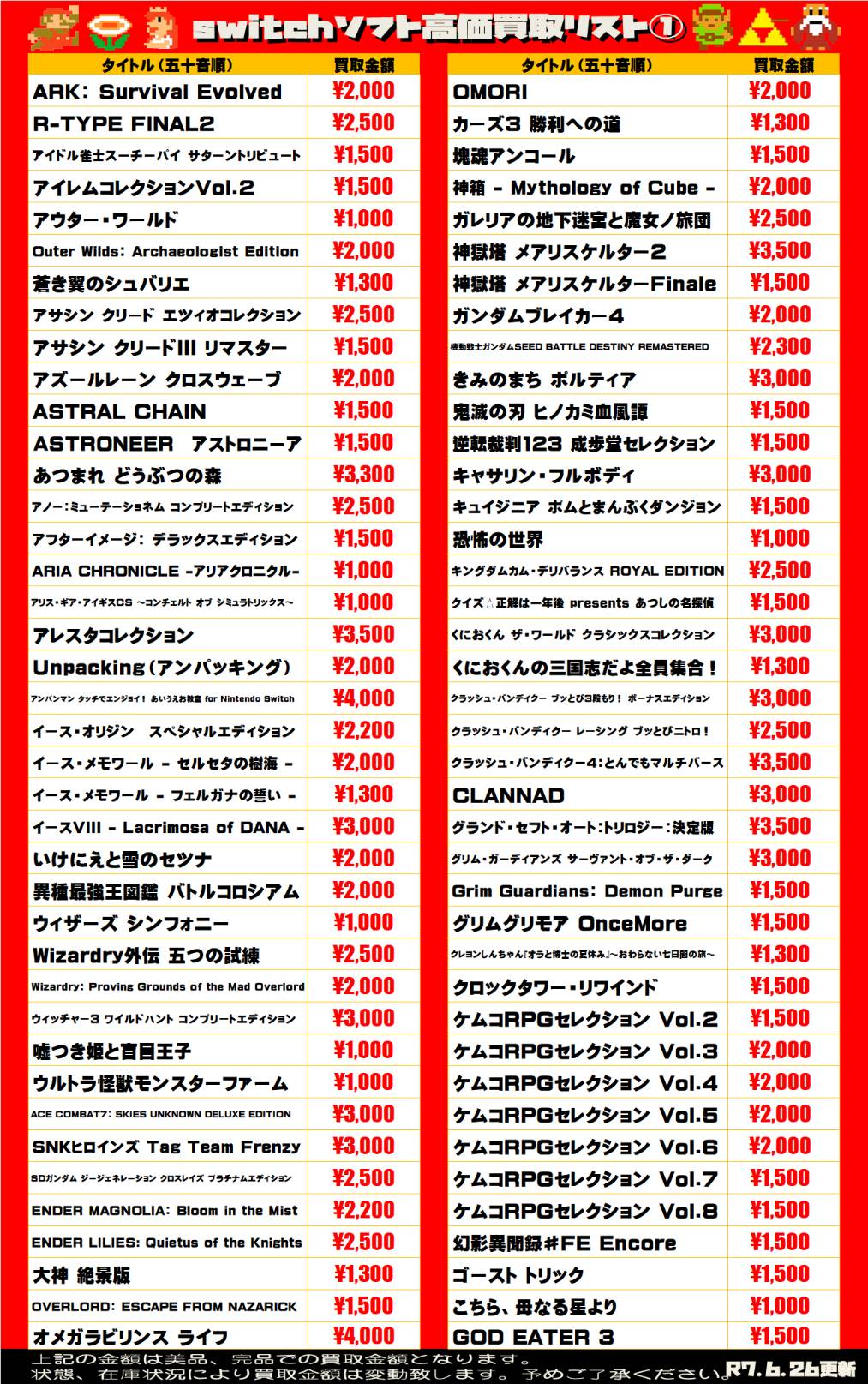 2025.06.26 買取情報 takalab_1 【Switch系ソフト】WEBチラシ更新しました!【WEBチラシ】 【Switch系ソフト】WEBチラシ更新しました!【WEBチラシ】 ※2025/6/27現在の価格となります。 在庫状況・状態によってお値段が変動いたします。予めご了承ください。 **************** こちら↓もぜひチェックしてみてくださいね♪(*´▽`*) ・最新のイベント情報はこちら ・最新の買取情報はこちら コメントを残す コメントをキャンセルメールアドレスが公開されることはありません。 ※ が付いている欄は必須項目ですコメント ※ 名前 ※ メール ※ サイト 新しいコメントをメールで通知 新しい投稿をメールで受け取る Δ