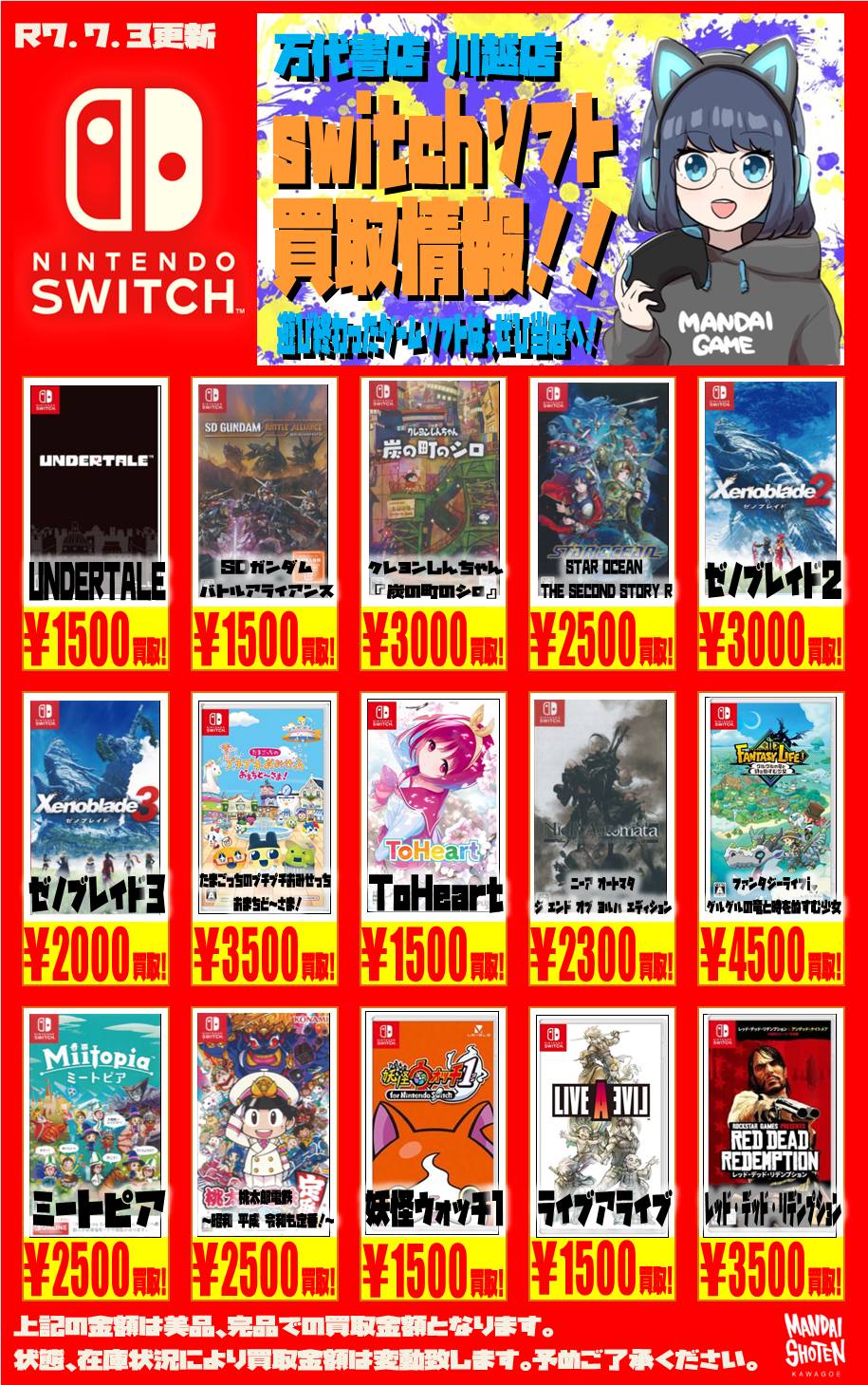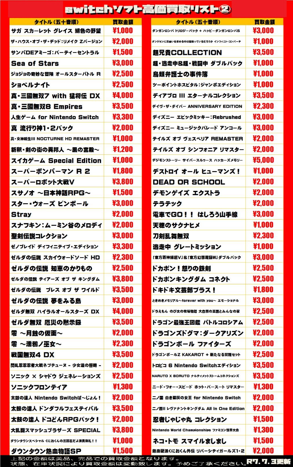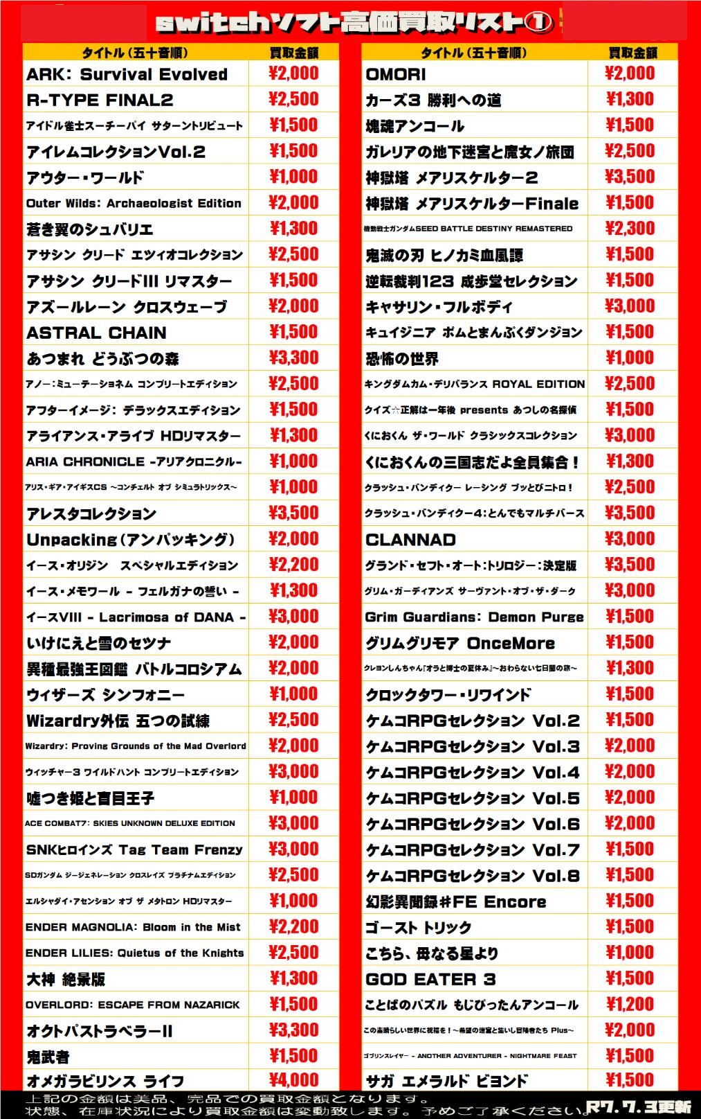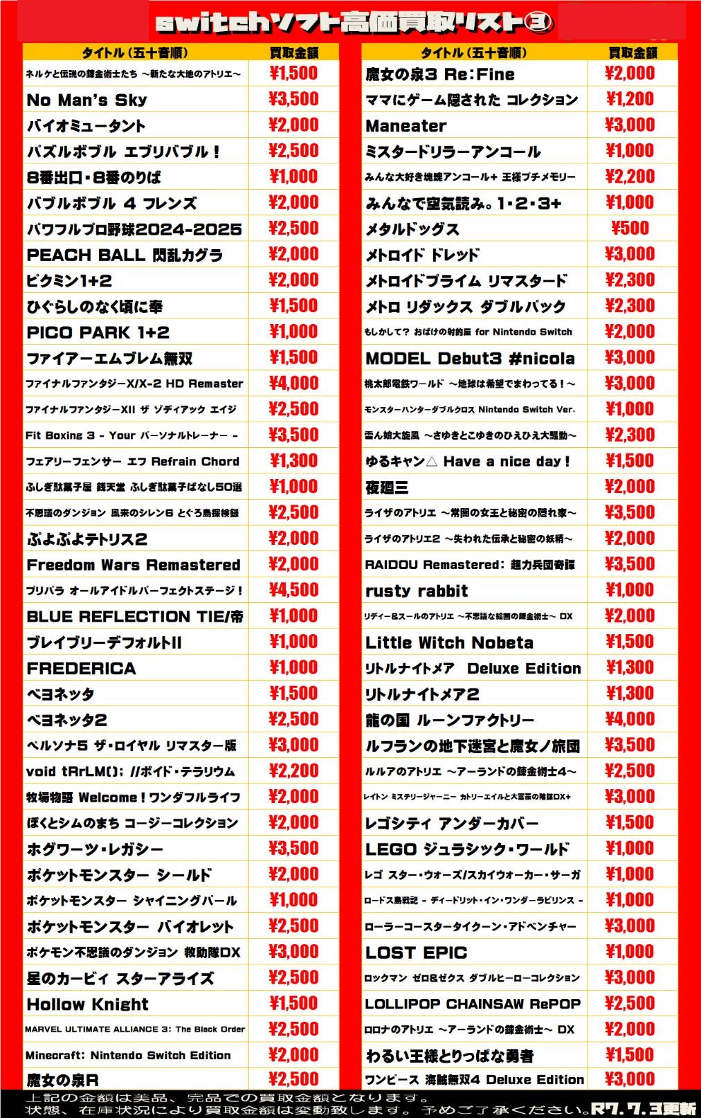2025.07.03 買取情報 takalab_4 【Switch系ソフト】WEBチラシ更新しました!【WEBチラシ】 【Switch系ソフト】WEBチラシ更新しました!【WEBチラシ】 ※2025/7/3現在の価格となります。 在庫状況・状態によってお値段が変動いたします。予めご了承ください。 **************** こちら↓もぜひチェックしてみてくださいね♪(*´▽`*) ・最新のイベント情報はこちら ・最新の買取情報はこちら コメントを残す コメントをキャンセルメールアドレスが公開されることはありません。 ※ が付いている欄は必須項目ですコメント ※ 名前 ※ メール ※ サイト 新しいコメントをメールで通知 新しい投稿をメールで受け取る Δ
