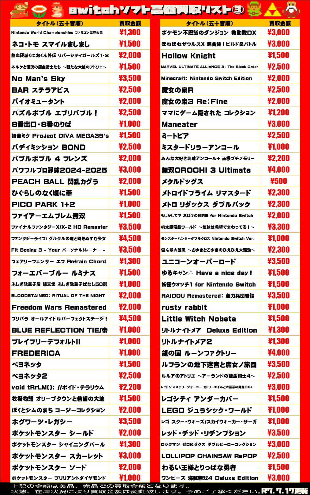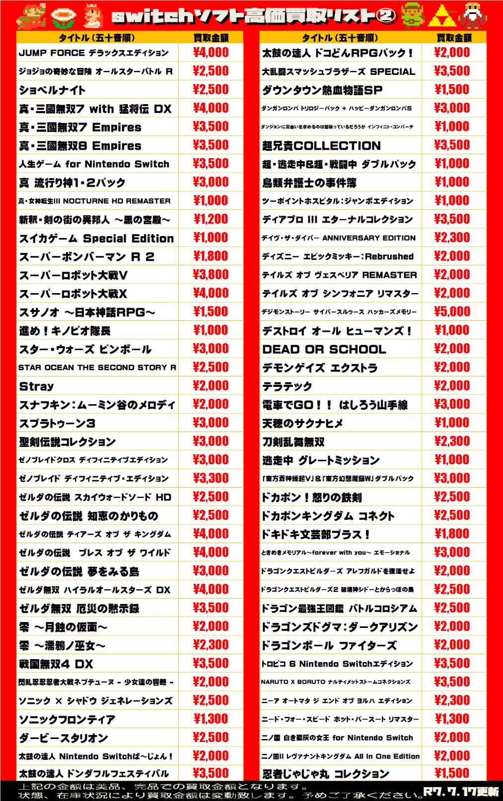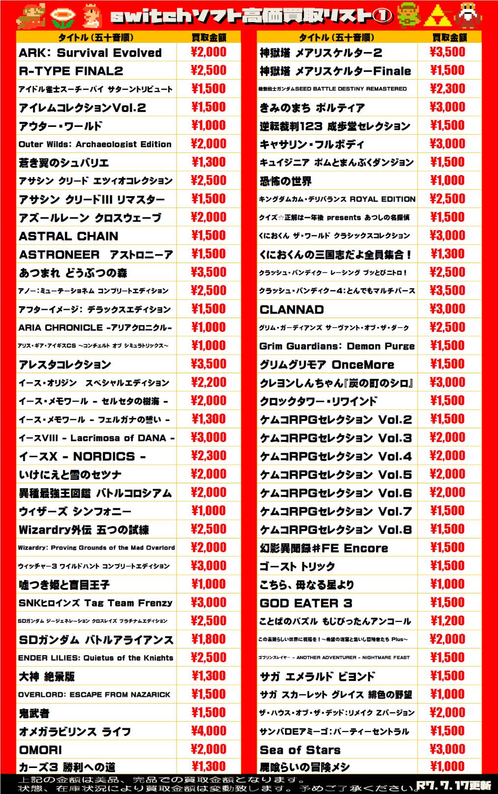 2025.07.17 買取情報 takalab_2 ■ゲームソフト買取告知■ 【SONY系ソフト】WEBチラシ更新しました!【WEBチラシ】 【Switch系ソフト】WEBチラシ更新しました!【WEBチラシ】 ※2025/7/17現在の価格となります。 在庫状況・状態によってお値段が変動いたします。予めご了承ください。 **************** こちら↓もぜひチェックしてみてくださいね♪(*´▽`*) ・最新のイベント情報はこちら ・最新の買取情報はこちら コメントを残す コメントをキャンセルメールアドレスが公開されることはありません。 ※ が付いている欄は必須項目ですコメント ※ 名前 ※ メール ※ サイト 新しいコメントをメールで通知 新しい投稿をメールで受け取る Δ