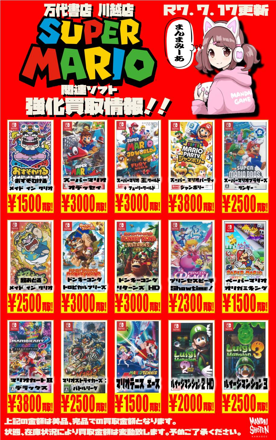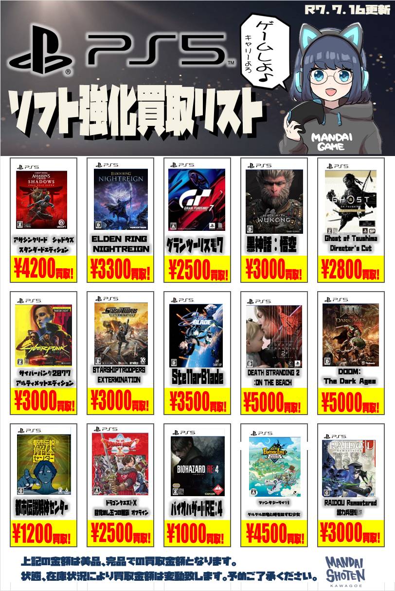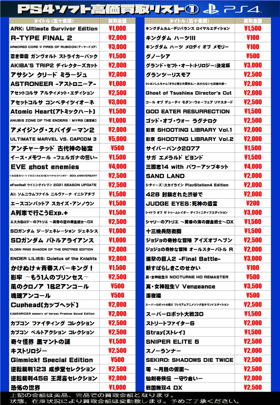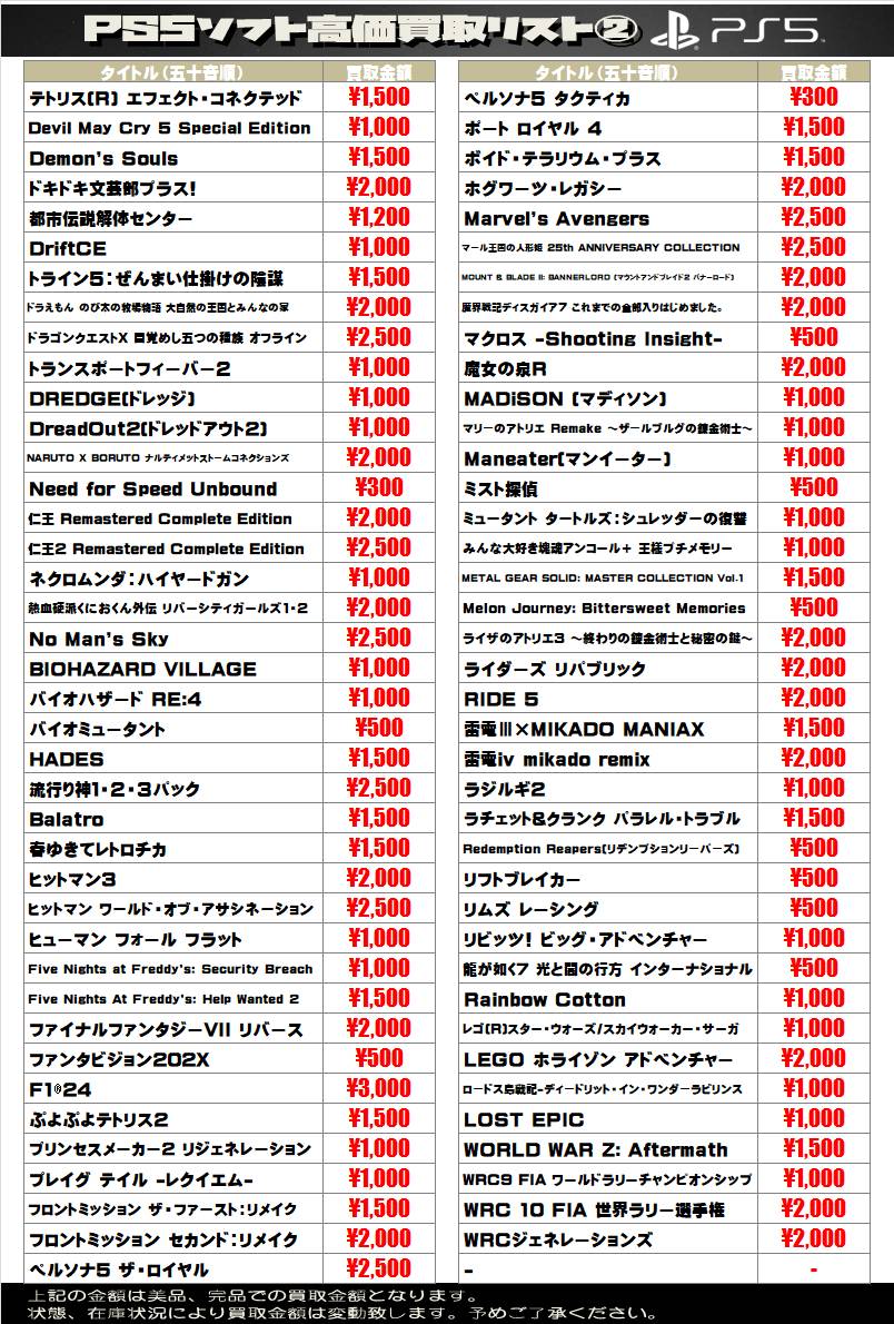 2025.07.17 買取情報 takalab_2 ■ゲームソフト買取告知■ 【SONY系ソフト】WEBチラシ更新しました!【WEBチラシ】 【Switch系ソフト】WEBチラシ更新しました!【WEBチラシ】 ※2025/7/17現在の価格となります。 在庫状況・状態によってお値段が変動いたします。予めご了承ください。 **************** こちら↓もぜひチェックしてみてくださいね♪(*´▽`*) ・最新のイベント情報はこちら ・最新の買取情報はこちら コメントを残す コメントをキャンセルメールアドレスが公開されることはありません。 ※ が付いている欄は必須項目ですコメント ※ 名前 ※ メール ※ サイト 新しいコメントをメールで通知 新しい投稿をメールで受け取る Δ