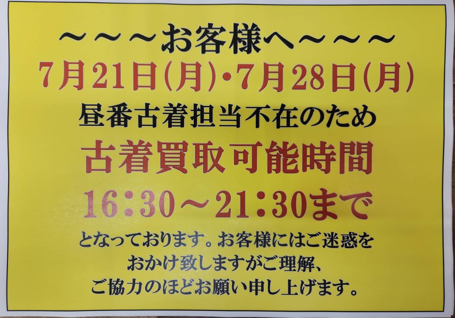 2025.07.19 お知らせ・ご案内 takalab_1 古着部門から7月21日、7月28日の買取受付時間のお知らせ。 古着部門からお知らせです。 コメントを残す コメントをキャンセルメールアドレスが公開されることはありません。 ※ が付いている欄は必須項目ですコメント ※ 名前 ※ メール ※ サイト 新しいコメントをメールで通知 新しい投稿をメールで受け取る Δ