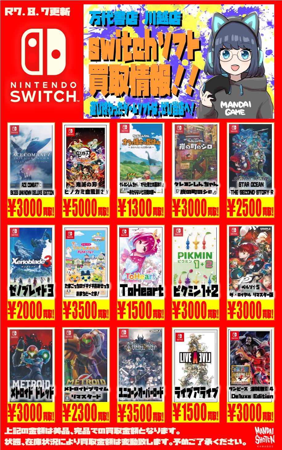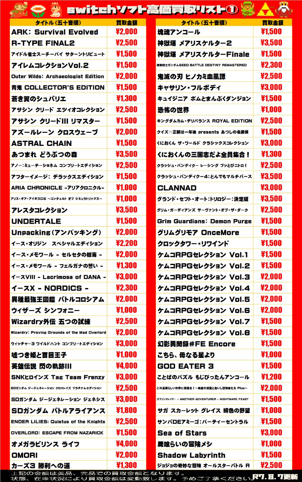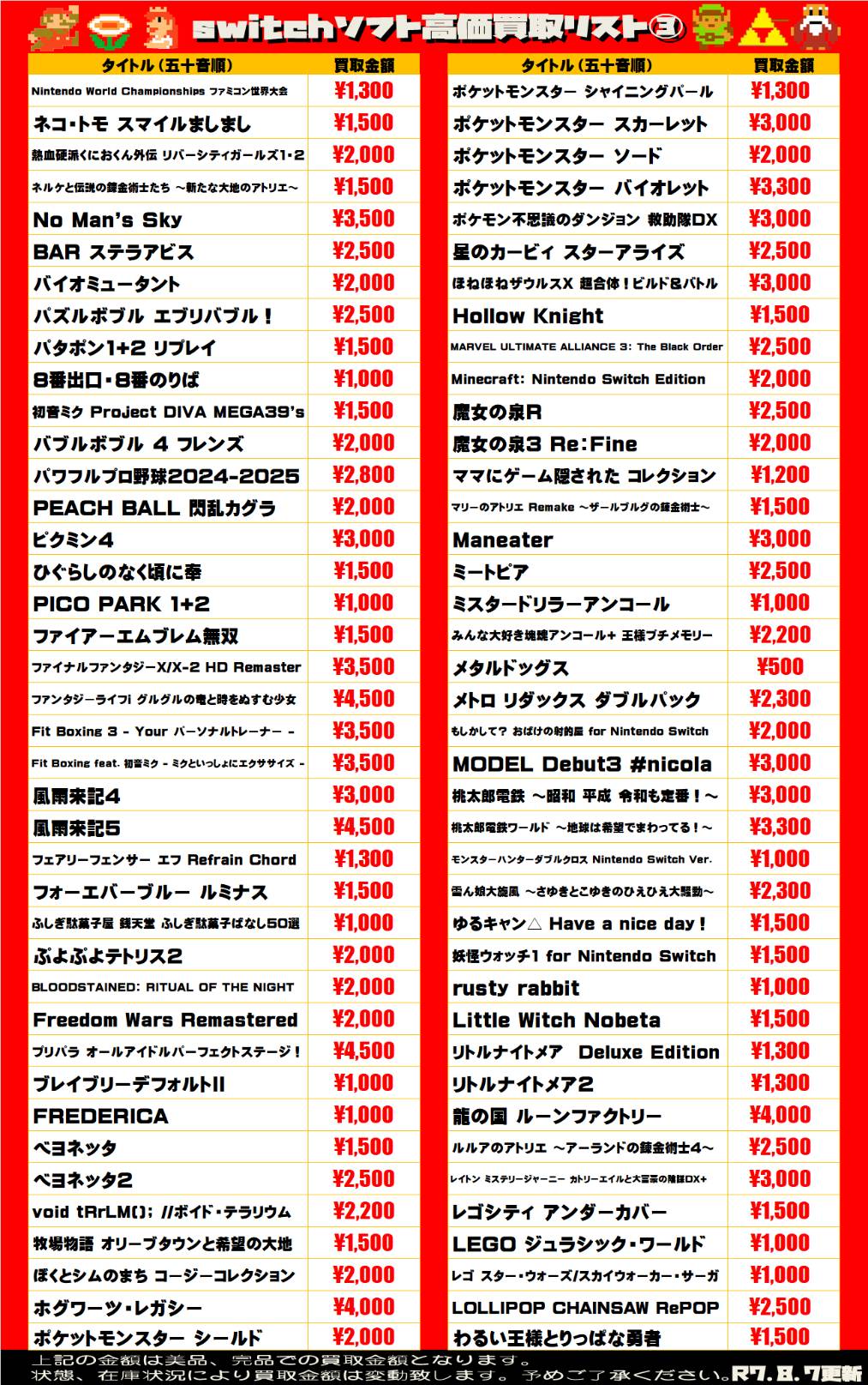 2025.08.07 買取情報 takalab_1 【Switch系ソフト】WEBチラシ更新しました!【WEBチラシ】 【Switch系ソフト】WEBチラシ更新しました!【WEBチラシ】 ※2025/8/7現在の価格となります。 在庫状況・状態によってお値段が変動いたします。予めご了承ください。 **************** こちら↓もぜひチェックしてみてくださいね♪(*´▽`*) ・最新のイベント情報はこちら ・最新の買取情報はこちら コメントを残す コメントをキャンセルメールアドレスが公開されることはありません。 ※ が付いている欄は必須項目ですコメント ※ 名前 ※ メール ※ サイト 新しいコメントをメールで通知 新しい投稿をメールで受け取る Δ