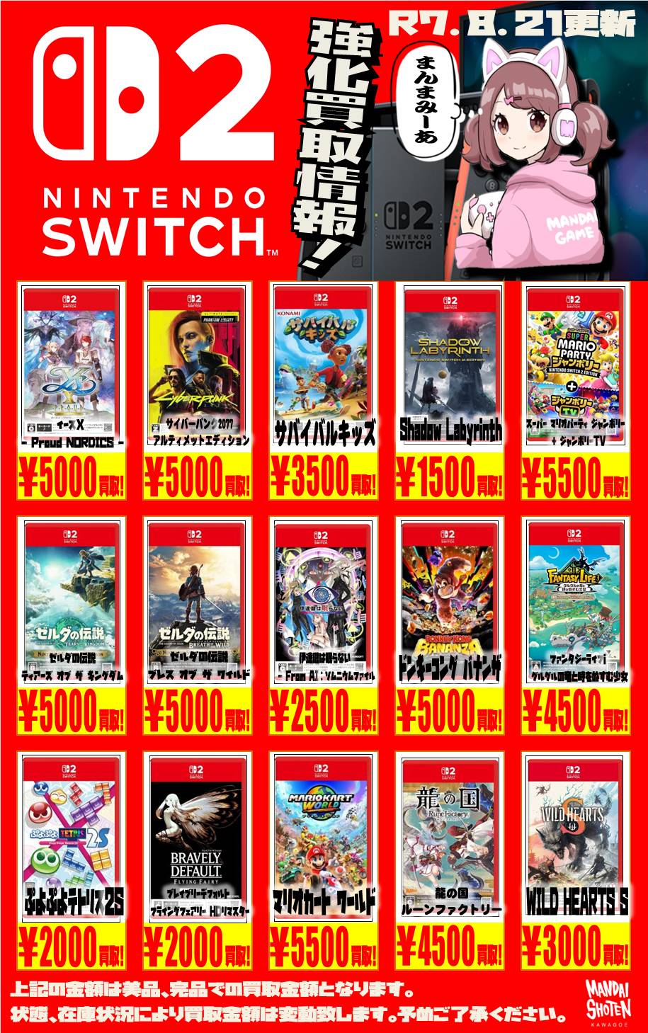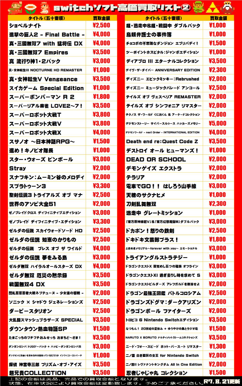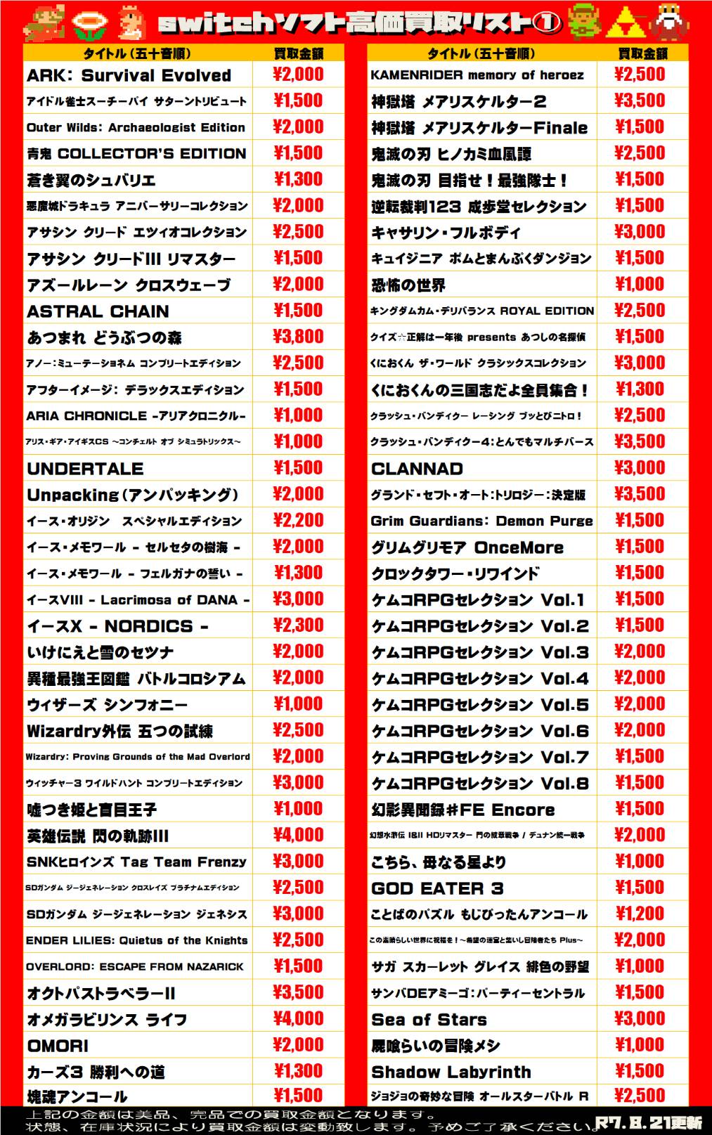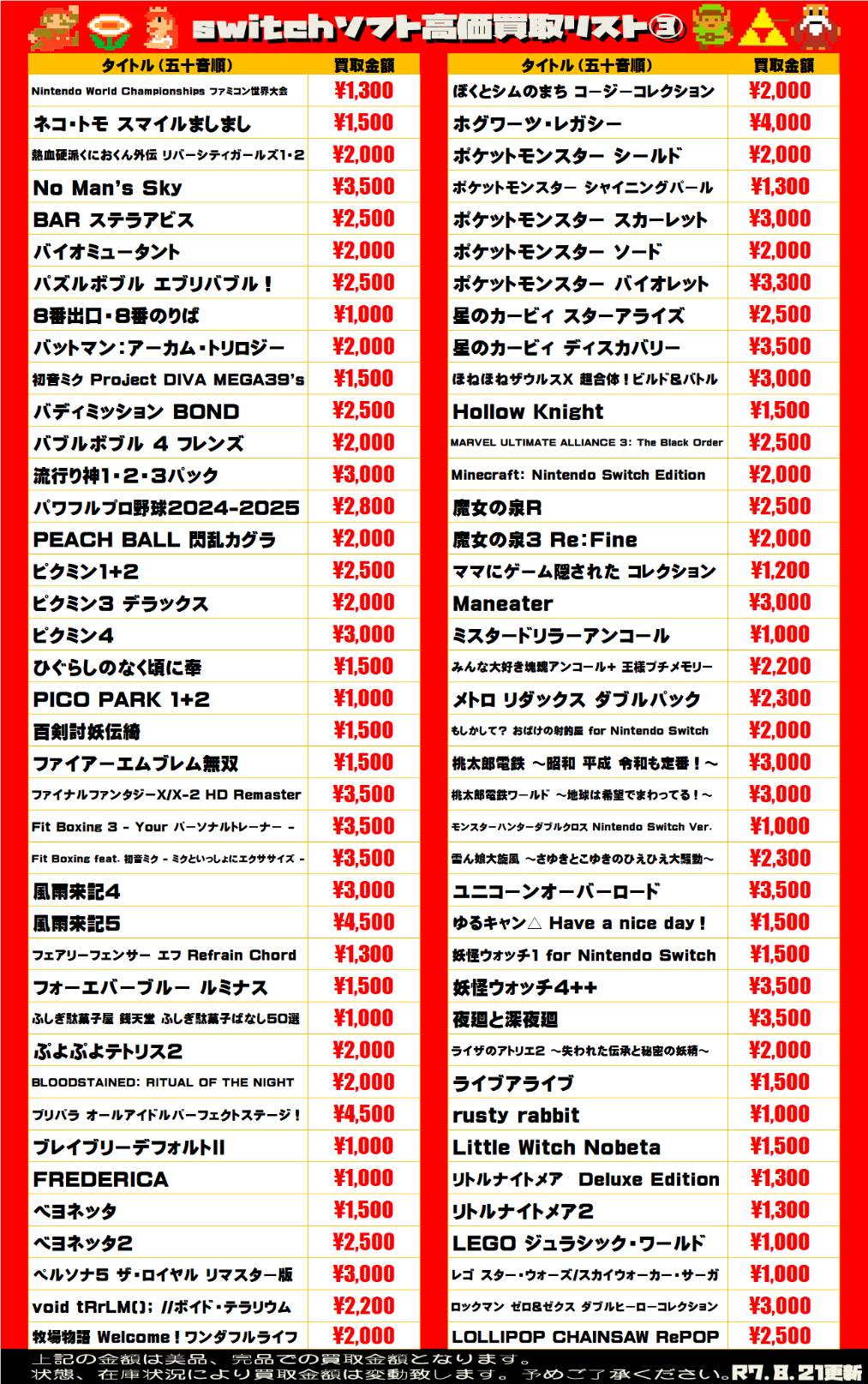 2025.08.21 買取情報 takalab_1 【Switch系ソフト】WEBチラシ更新しました!【WEBチラシ】 【Switch系ソフト】WEBチラシ更新しました!【WEBチラシ】 ※2025/8/21現在の価格となります。 在庫状況・状態によってお値段が変動いたします。予めご了承ください。 **************** こちら↓もぜひチェックしてみてくださいね♪(*´▽`*) ・最新のイベント情報はこちら ・最新の買取情報はこちら コメントを残す コメントをキャンセルメールアドレスが公開されることはありません。 ※ が付いている欄は必須項目ですコメント ※ 名前 ※ メール ※ サイト 新しいコメントをメールで通知 新しい投稿をメールで受け取る Δ