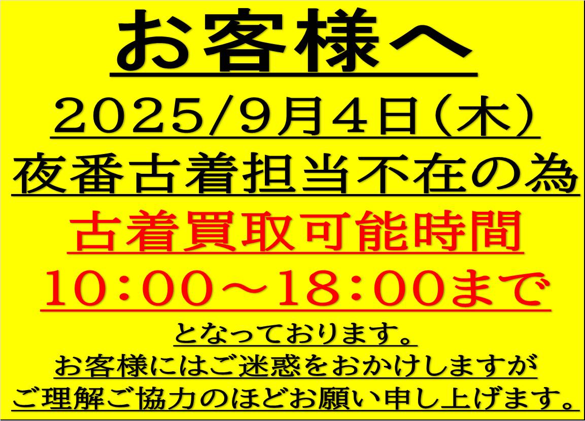 2025.09.02 買取情報 takalab_2 ★《9月4日》古着部門担当不在のお知らせ★ ★古着部門担当不在のお知らせ★ コメントを残す コメントをキャンセルメールアドレスが公開されることはありません。 ※ が付いている欄は必須項目ですコメント ※ 名前 ※ メール ※ サイト 新しいコメントをメールで通知 新しい投稿をメールで受け取る Δ