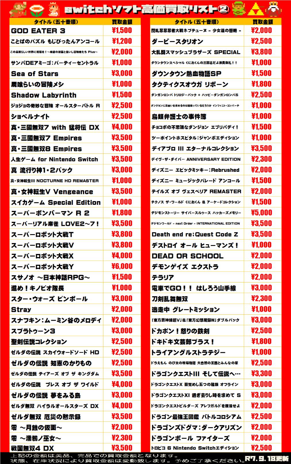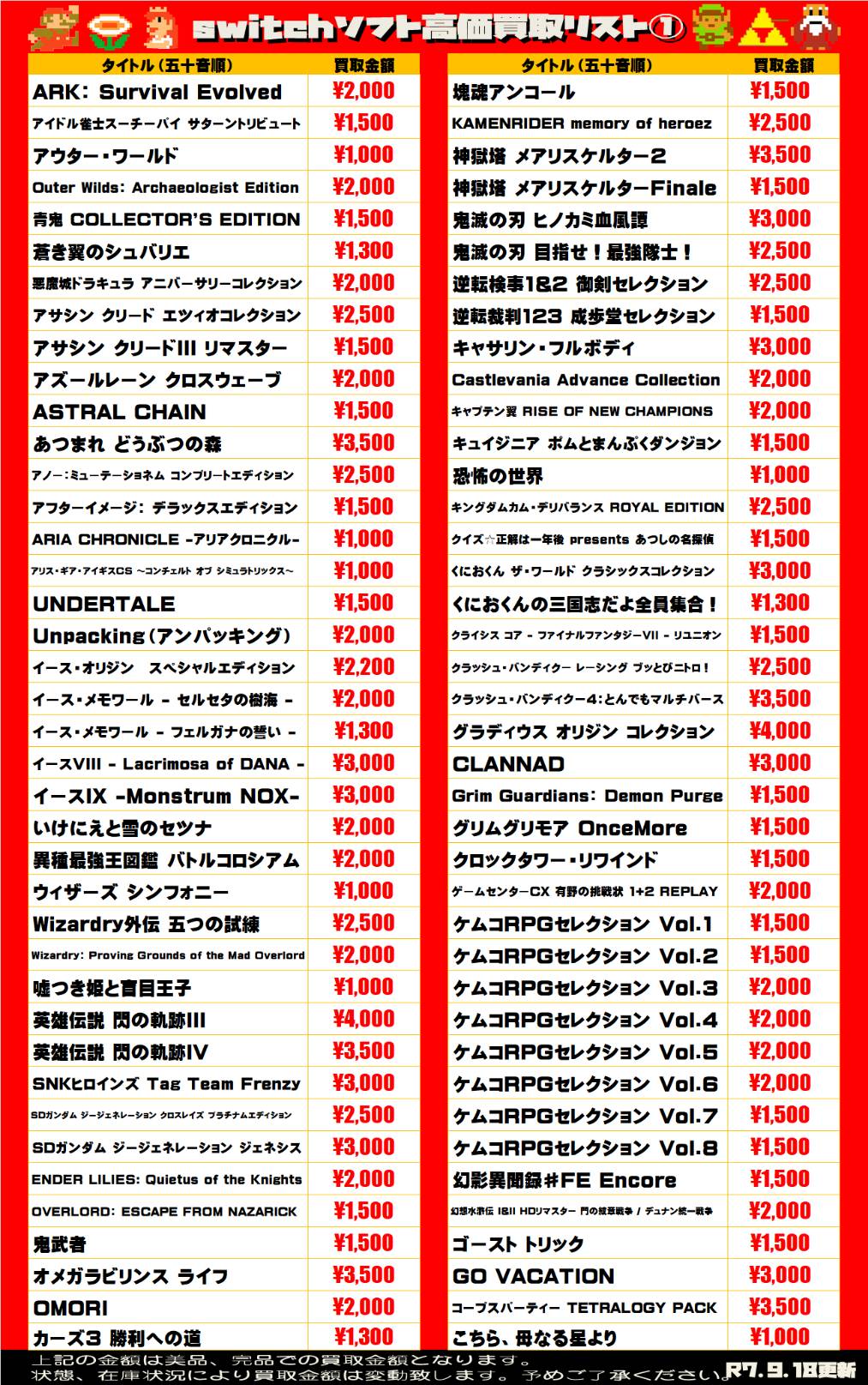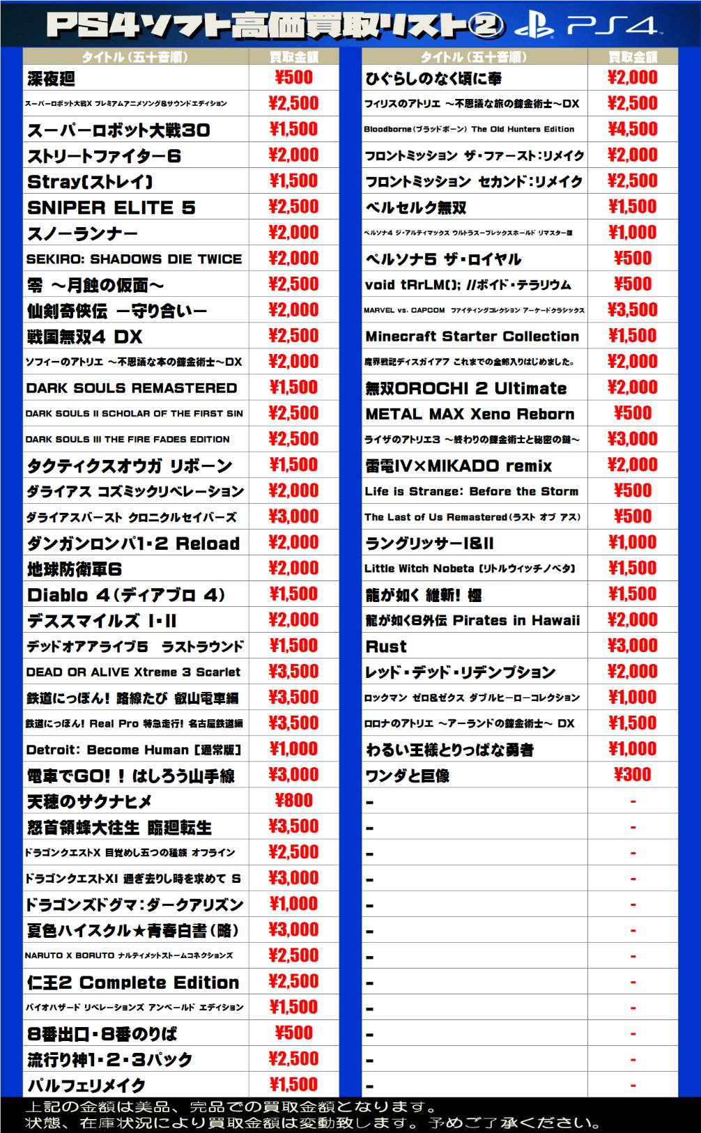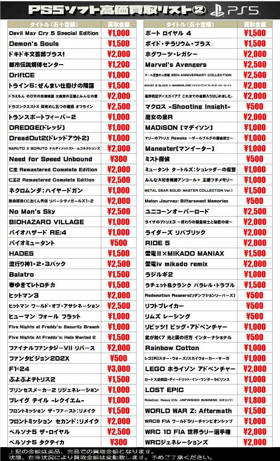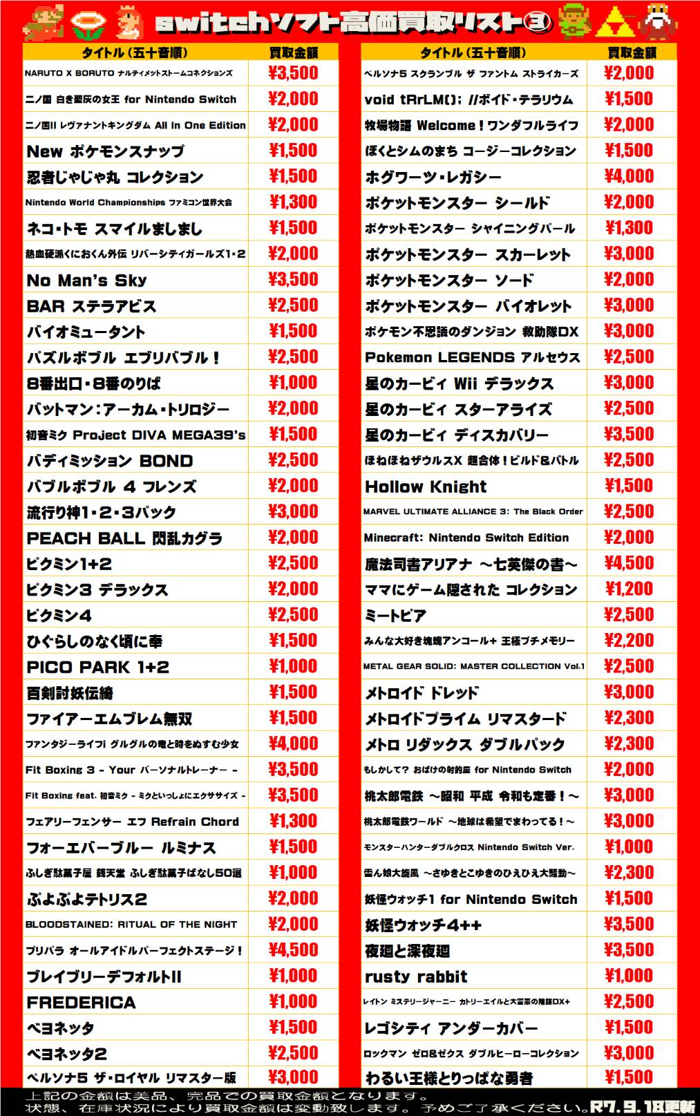 2025.09.20 買取情報 takalab_3 【Switch系ソフト】WEBチラシ更新しました!【WEBチラシ】【SONY系ソフト】WEBチラシ更新しました!【WEBチラシ】 【Switch系ソフト】WEBチラシ更新しました!【WEBチラシ】 【SONY系ソフト】WEBチラシ更新しました!【WEBチラシ】 ※2025/9/20現在の価格となります。 在庫状況・状態によってお値段が変動いたします。予めご了承ください。 **************** こちら↓もぜひチェックしてみてくださいね♪(*´▽`*) ・最新のイベント情報はこちら ・最新の買取情報はこちら コメントを残す コメントをキャンセルメールアドレスが公開されることはありません。 ※ が付いている欄は必須項目ですコメント ※ 名前 ※ メール ※ サイト 新しいコメントをメールで通知 新しい投稿をメールで受け取る Δ
