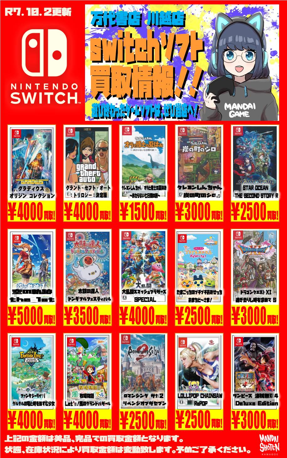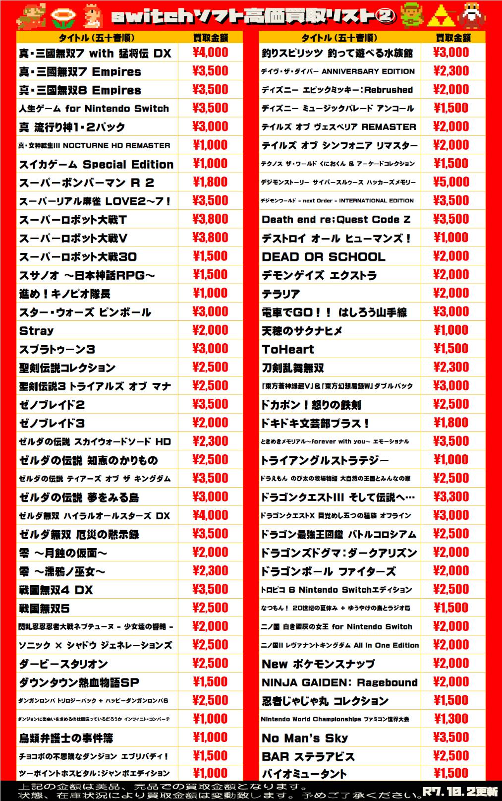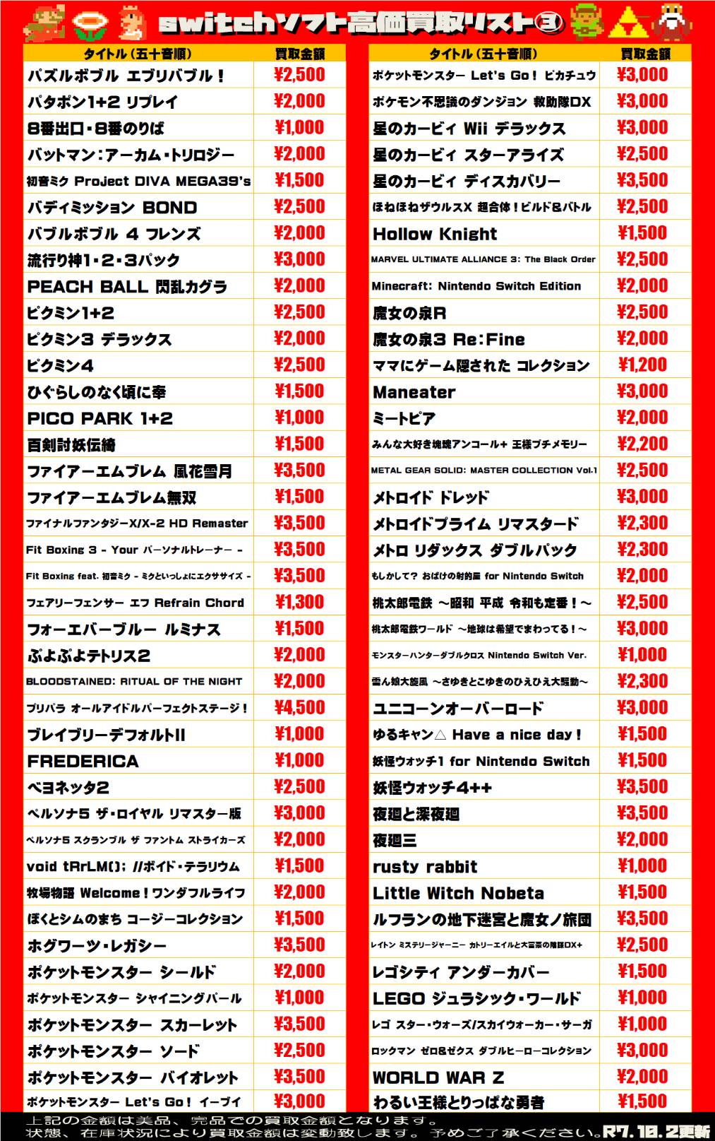 2025.10.03 買取情報 takalab_4 【Switch系ソフト】WEBチラシ更新しました!【WEBチラシ】 【Switch系ソフト】WEBチラシ更新しました!【WEBチラシ】 ※2025/〇/〇現在の価格となります。 在庫状況・状態によってお値段が変動いたします。予めご了承ください。 **************** こちら↓もぜひチェックしてみてくださいね♪(*´▽`*) ・最新のイベント情報はこちら ・最新の買取情報はこちら コメントを残す コメントをキャンセルメールアドレスが公開されることはありません。 ※ が付いている欄は必須項目ですコメント ※ 名前 ※ メール ※ サイト 新しいコメントをメールで通知 新しい投稿をメールで受け取る Δ