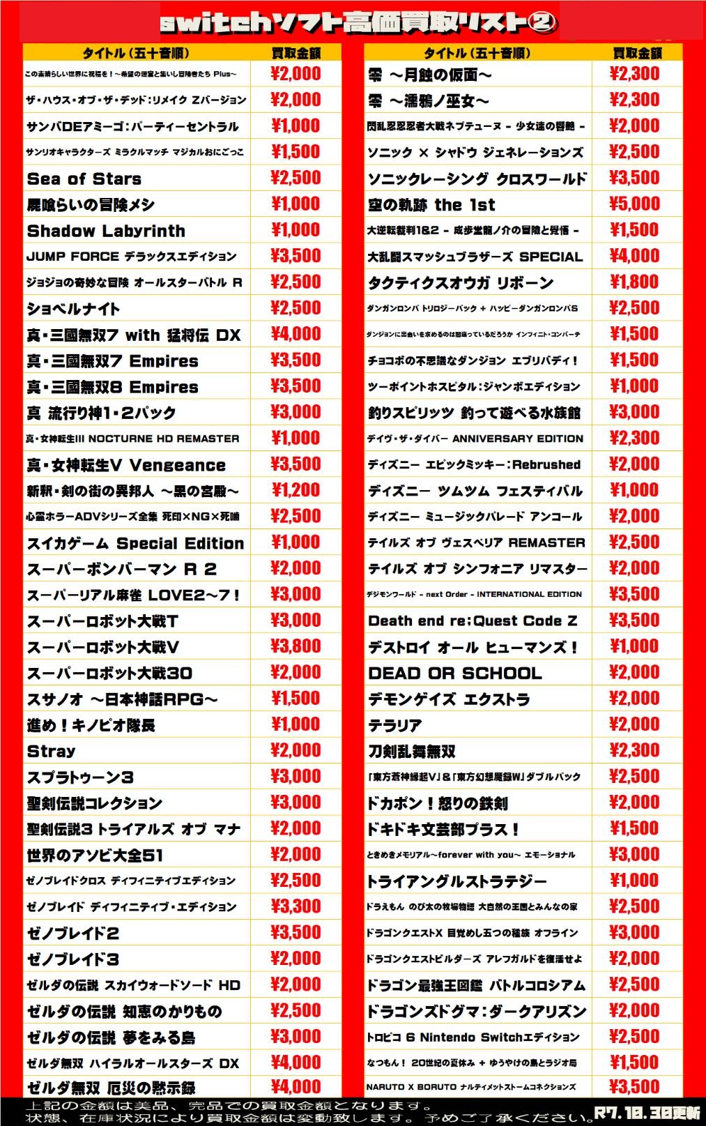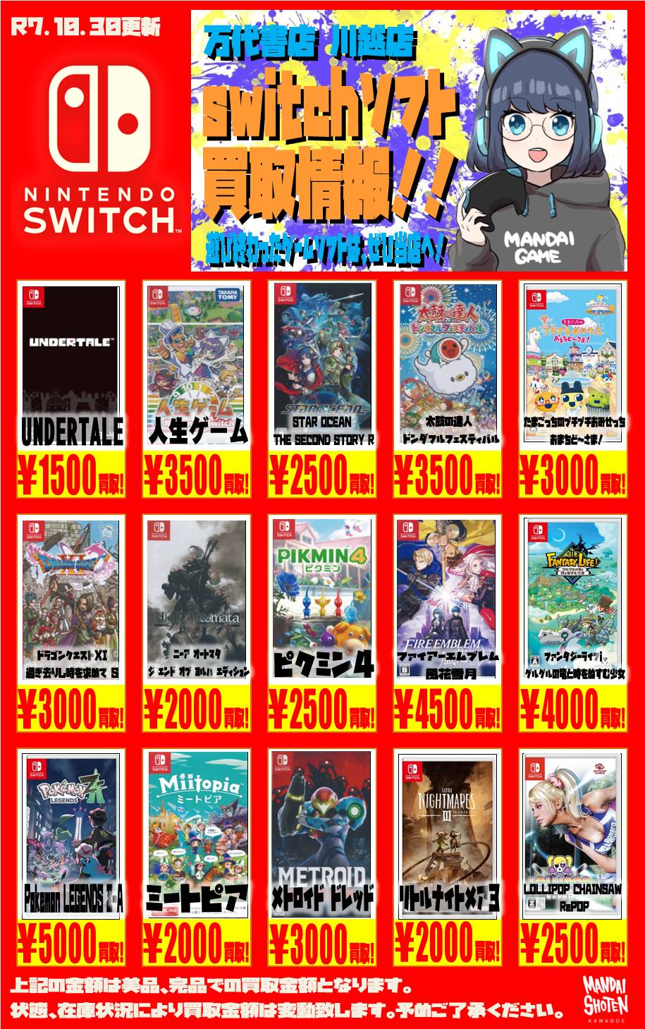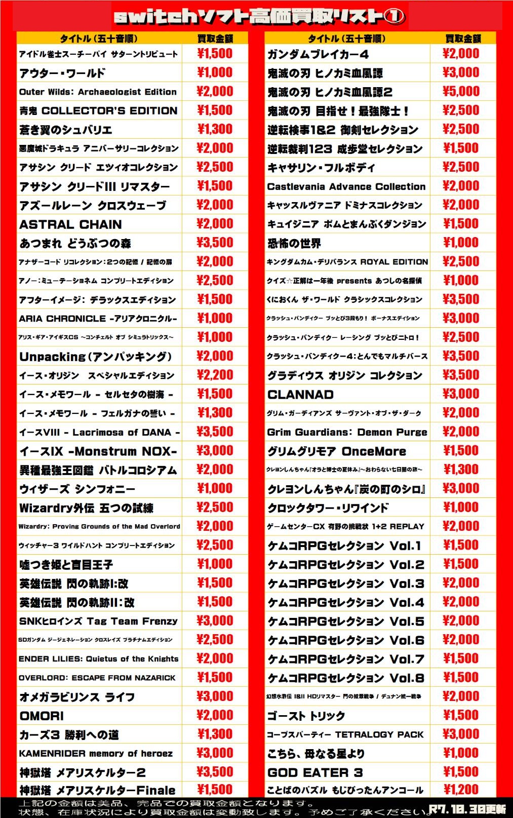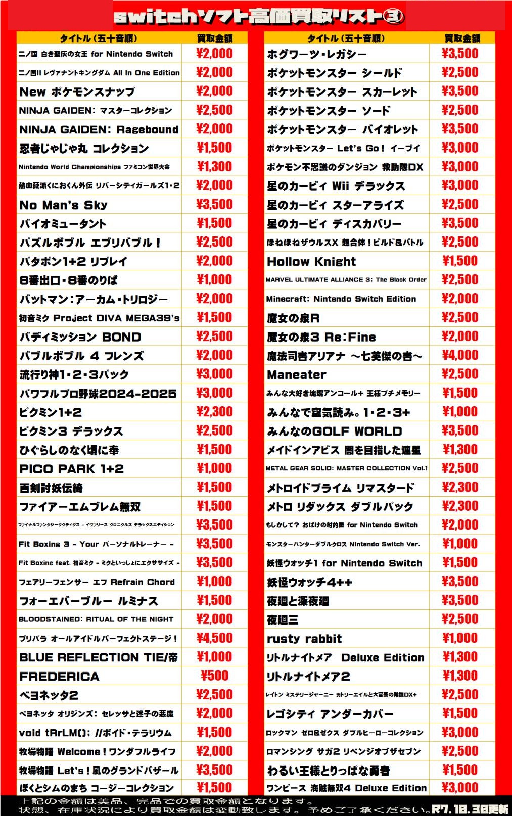 2025.10.30 買取情報 takalab_5 【Switch系ソフト】WEBチラシ更新しました!【WEBチラシ】 【Switch系ソフト】WEBチラシ更新しました!【WEBチラシ】 ※2025/10/30現在の価格となります。 在庫状況・状態によってお値段が変動いたします。予めご了承ください。 **************** こちら↓もぜひチェックしてみてくださいね♪(*´▽`*) ・最新のイベント情報はこちら ・最新の買取情報はこちら コメントを残す コメントをキャンセルメールアドレスが公開されることはありません。 ※ が付いている欄は必須項目ですコメント ※ 名前 ※ メール ※ サイト 新しいコメントをメールで通知 新しい投稿をメールで受け取る Δ