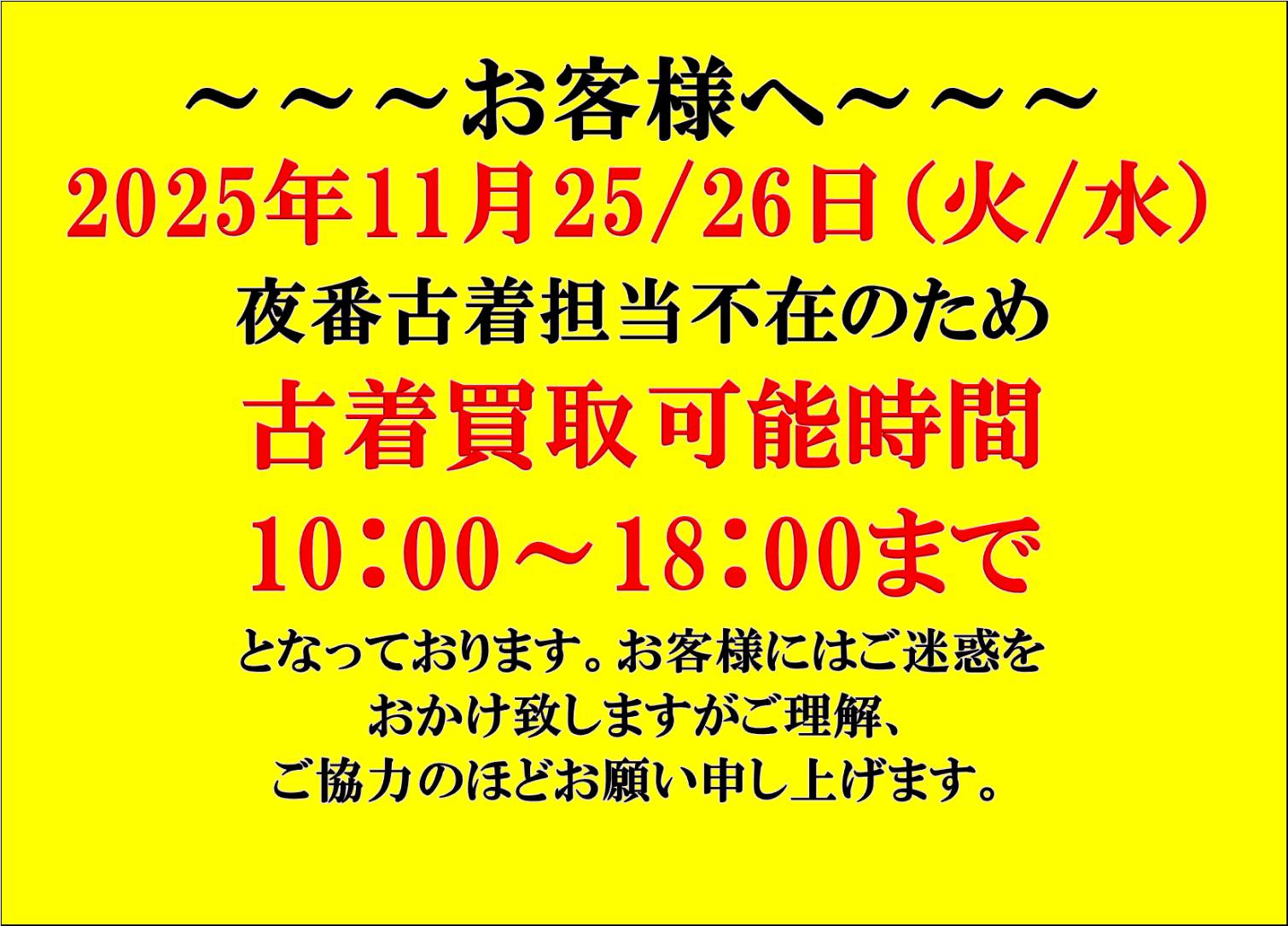 2025.11.20 買取情報 takalab_2 ★《11月25日・26日》古着部門担当不在の為買取時間変更のお知らせです★ ★古着部門担当不在の為買取時間変更のお知らせです★ コメントを残す コメントをキャンセルメールアドレスが公開されることはありません。 ※ が付いている欄は必須項目ですコメント ※ 名前 ※ メール ※ サイト 新しいコメントをメールで通知 新しい投稿をメールで受け取る Δ
