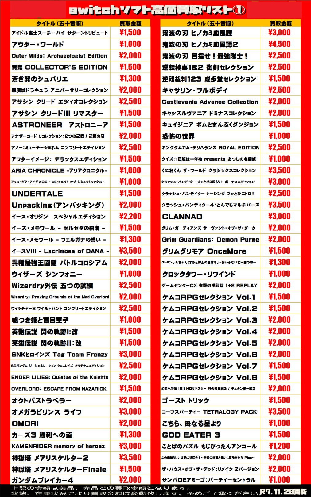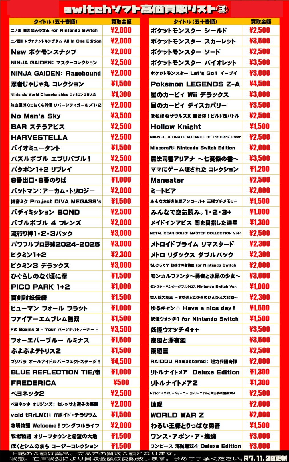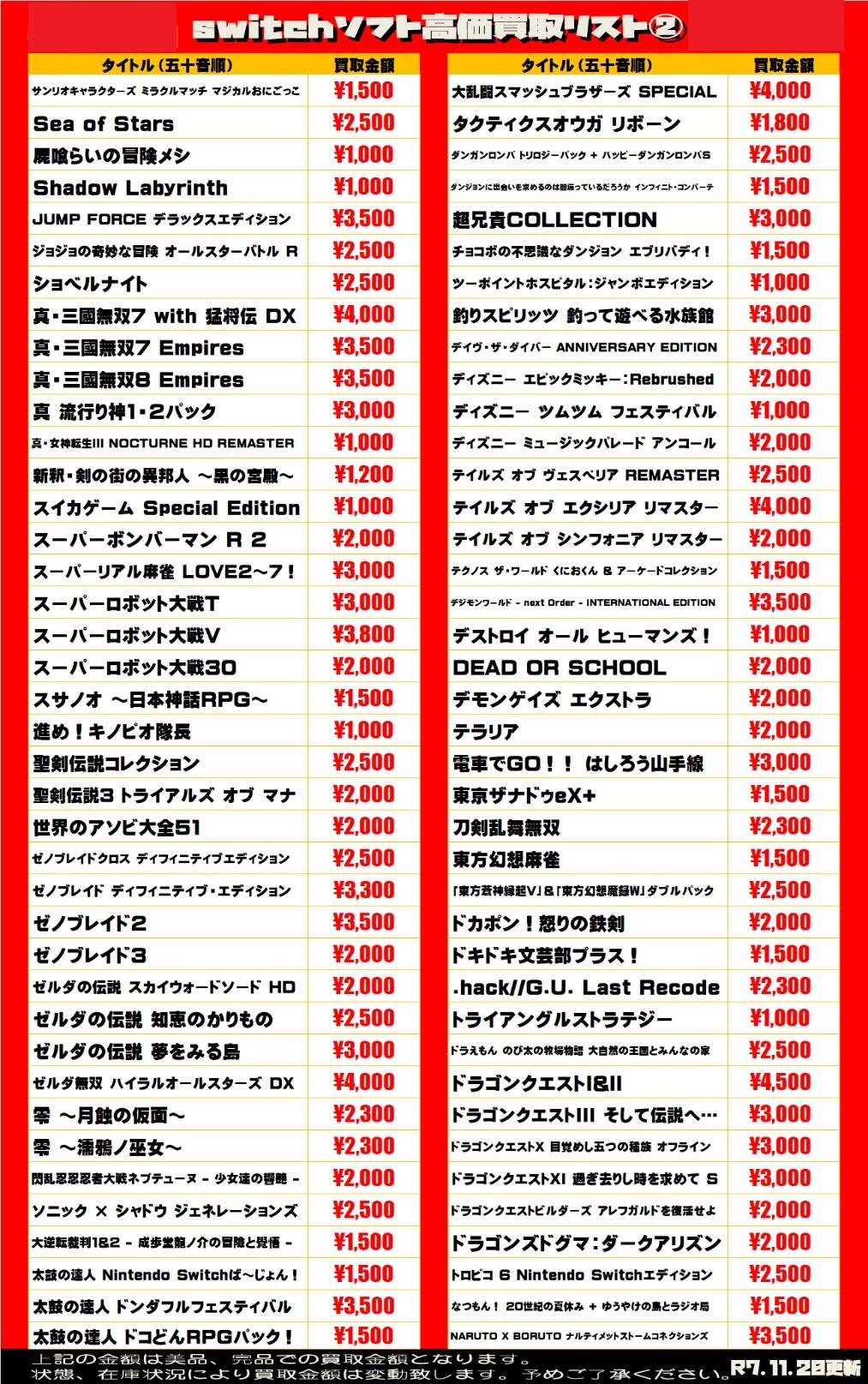 2025.11.20 買取情報 takalab_4 【Switch系ソフト】WEBチラシ更新しました!【WEBチラシ】 【Switch系ソフト】WEBチラシ更新しました!【WEBチラシ】 ※2025/11/20現在の価格となります。 在庫状況・状態によってお値段が変動いたします。予めご了承ください。 **************** こちら↓もぜひチェックしてみてくださいね♪(*´▽`*) ・最新のイベント情報はこちら ・最新の買取情報はこちら コメントを残す コメントをキャンセルメールアドレスが公開されることはありません。 ※ が付いている欄は必須項目ですコメント ※ 名前 ※ メール ※ サイト 新しいコメントをメールで通知 新しい投稿をメールで受け取る Δ