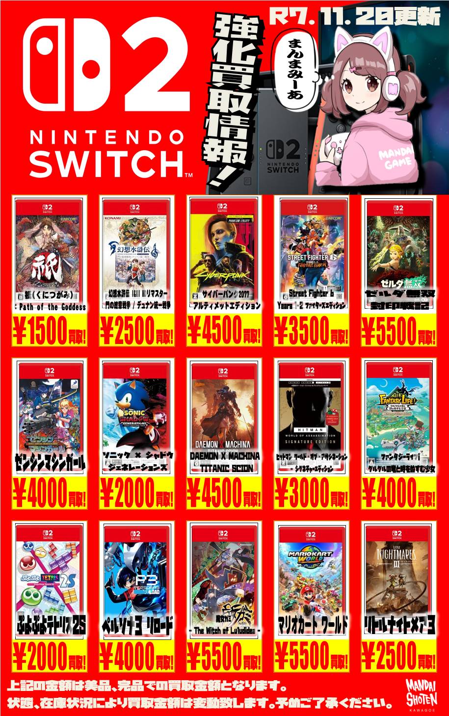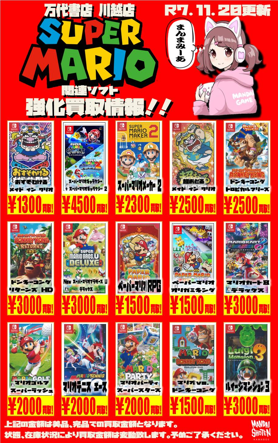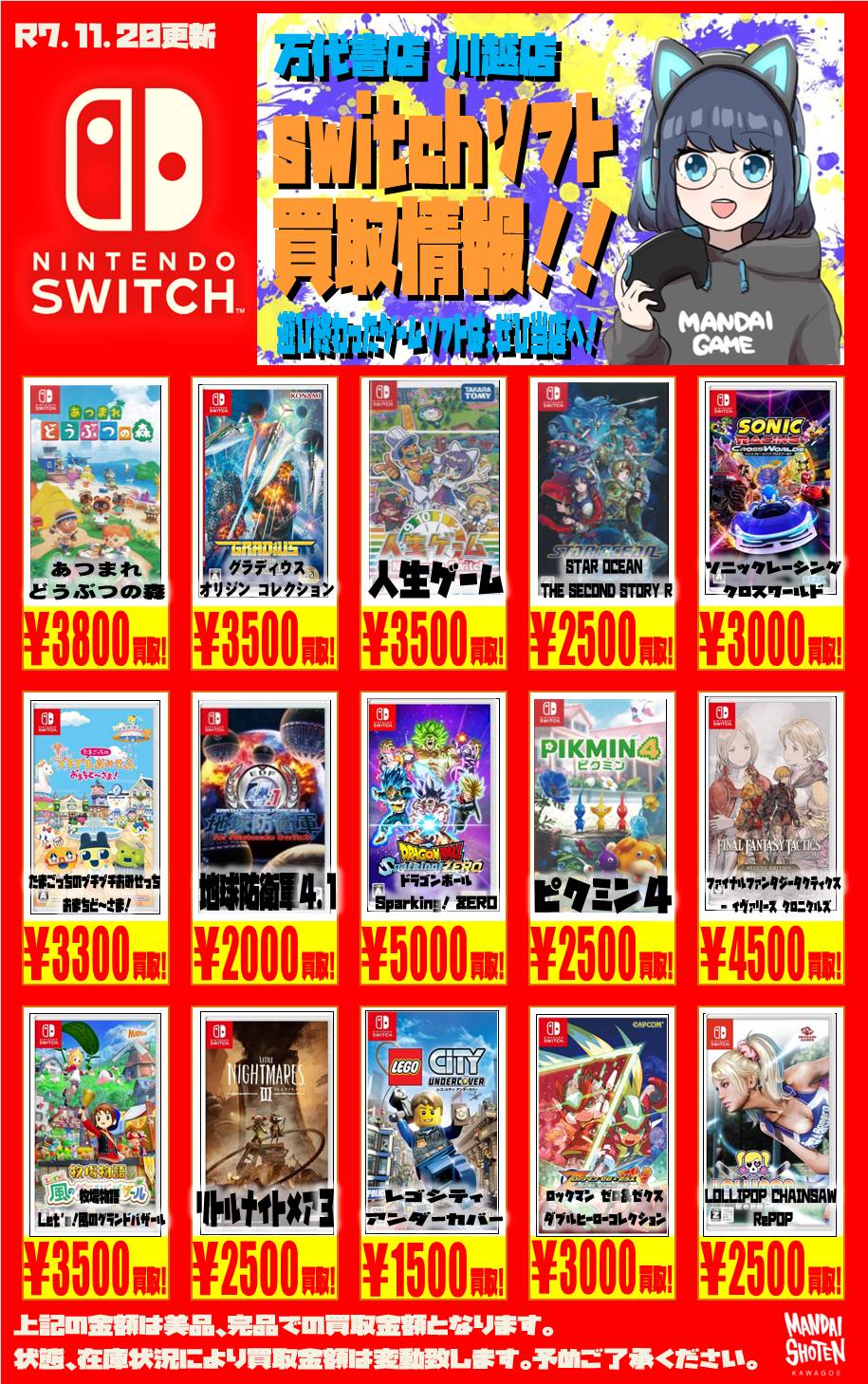 2025.11.20 買取情報 takalab_4 【Switch系ソフト】WEBチラシ更新しました!【WEBチラシ】 【Switch系ソフト】WEBチラシ更新しました!【WEBチラシ】 ※2025/11/20現在の価格となります。 在庫状況・状態によってお値段が変動いたします。予めご了承ください。 **************** こちら↓もぜひチェックしてみてくださいね♪(*´▽`*) ・最新のイベント情報はこちら ・最新の買取情報はこちら コメントを残す コメントをキャンセルメールアドレスが公開されることはありません。 ※ が付いている欄は必須項目ですコメント ※ 名前 ※ メール ※ サイト 新しいコメントをメールで通知 新しい投稿をメールで受け取る Δ
