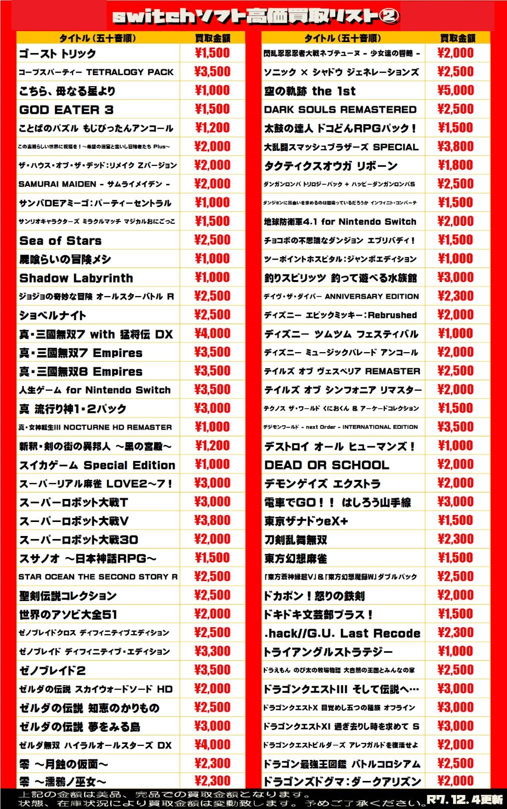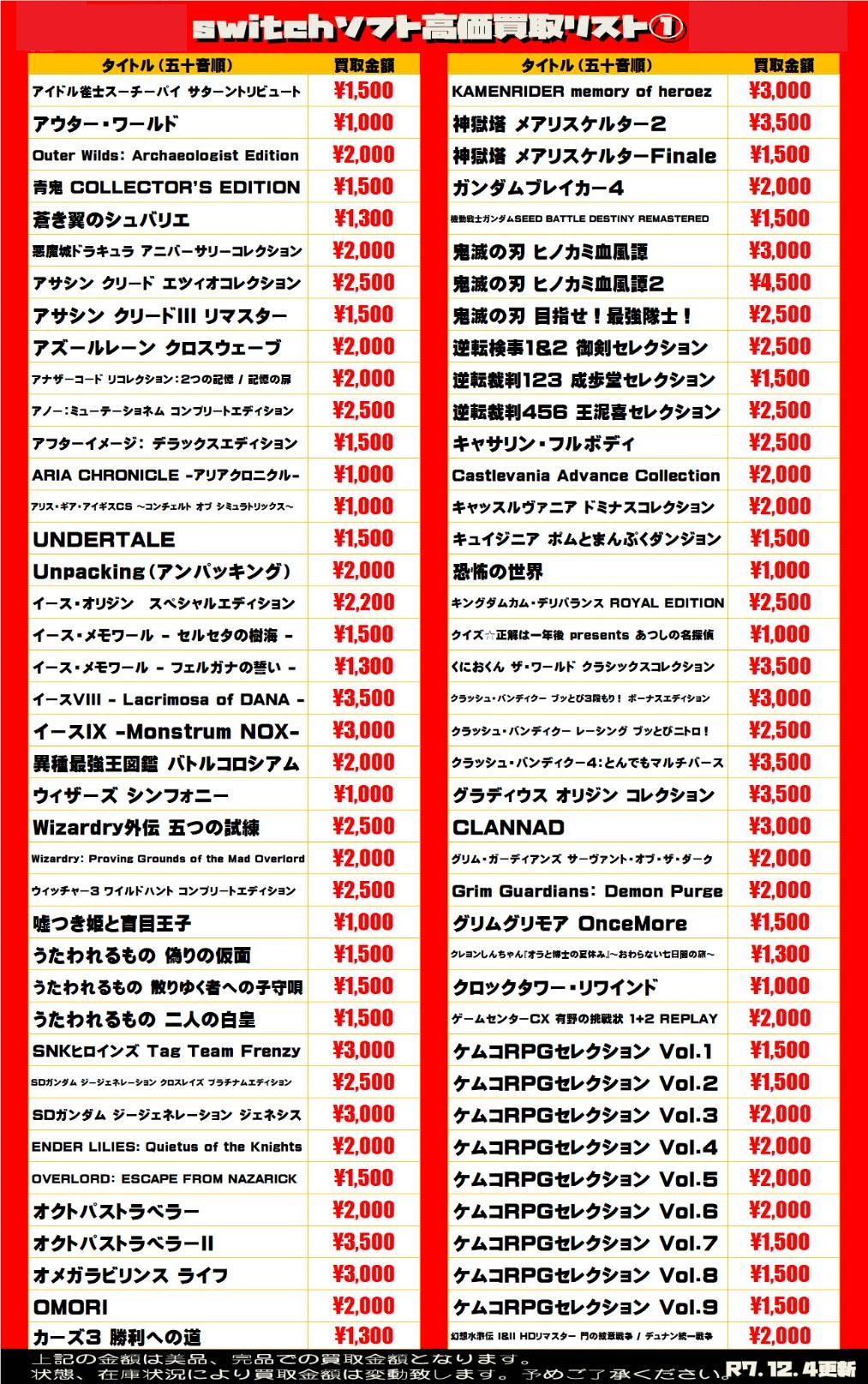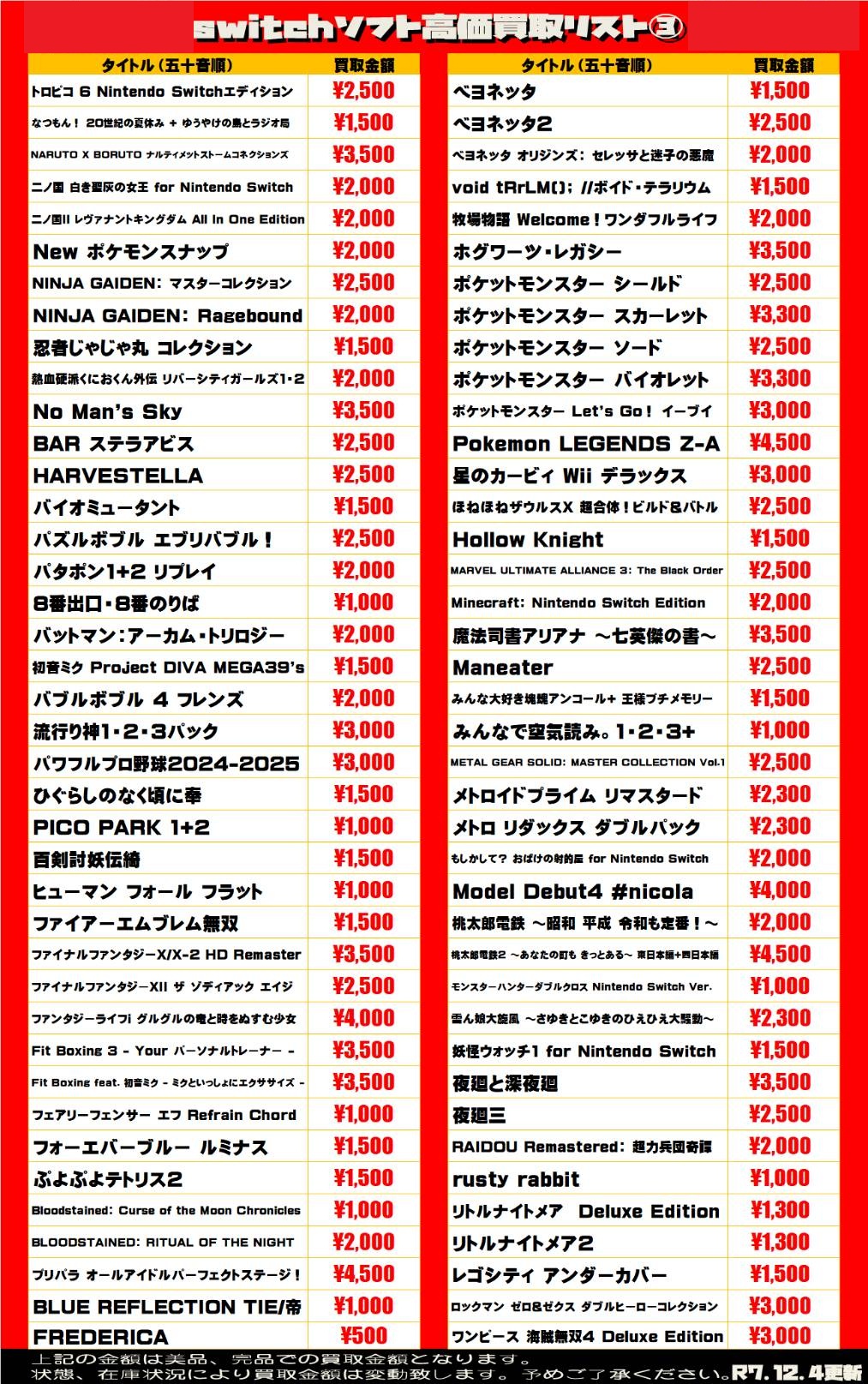2025.12.06 買取情報 takalab_5 【Switch系ソフト】WEBチラシ更新しました!【WEBチラシ】 【Switch系ソフト】WEBチラシ更新しました!【WEBチラシ】 ※2025/12/6現在の価格となります。 在庫状況・状態によってお値段が変動いたします。予めご了承ください。 **************** こちら↓もぜひチェックしてみてくださいね♪(*´▽`*) ・最新のイベント情報はこちら ・最新の買取情報はこちら コメントを残す コメントをキャンセルメールアドレスが公開されることはありません。 ※ が付いている欄は必須項目ですコメント ※ 名前 ※ メール ※ サイト 新しいコメントをメールで通知 新しい投稿をメールで受け取る Δ