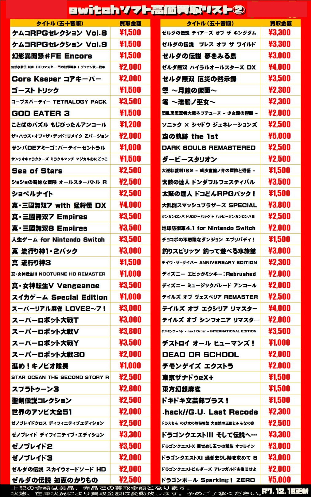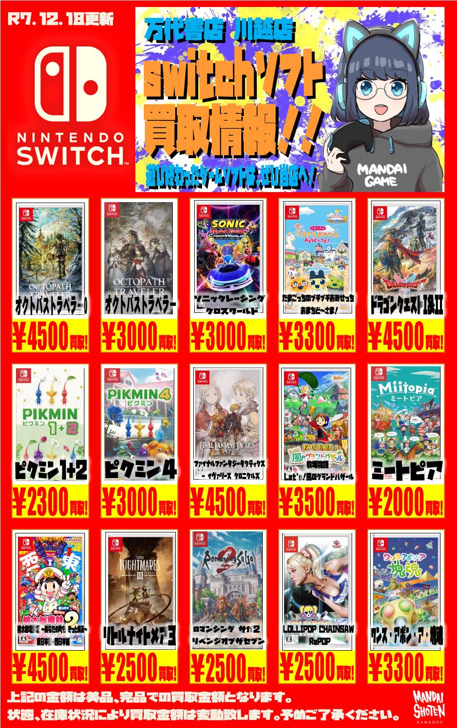 2025.12.18 買取情報 takalab_5 【Switch系ソフト】WEBチラシ更新しました!【WEBチラシ】 【Switch系ソフト】WEBチラシ更新しました!【WEBチラシ】 ※2025/12/18現在の価格となります。 在庫状況・状態によってお値段が変動いたします。予めご了承ください。 **************** こちら↓もぜひチェックしてみてくださいね♪(*´▽`*) ・最新のイベント情報はこちら ・最新の買取情報はこちら コメントを残す コメントをキャンセルメールアドレスが公開されることはありません。 ※ が付いている欄は必須項目ですコメント ※ 名前 ※ メール ※ サイト 新しいコメントをメールで通知 新しい投稿をメールで受け取る Δ