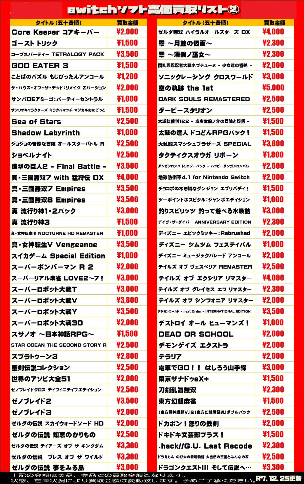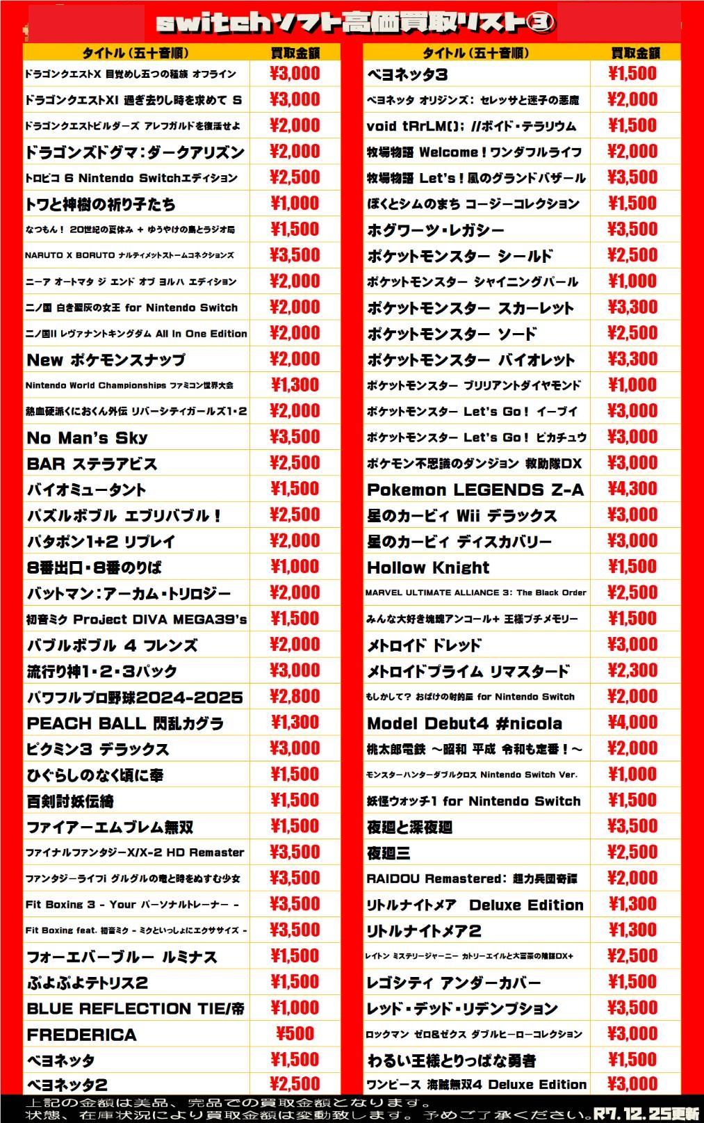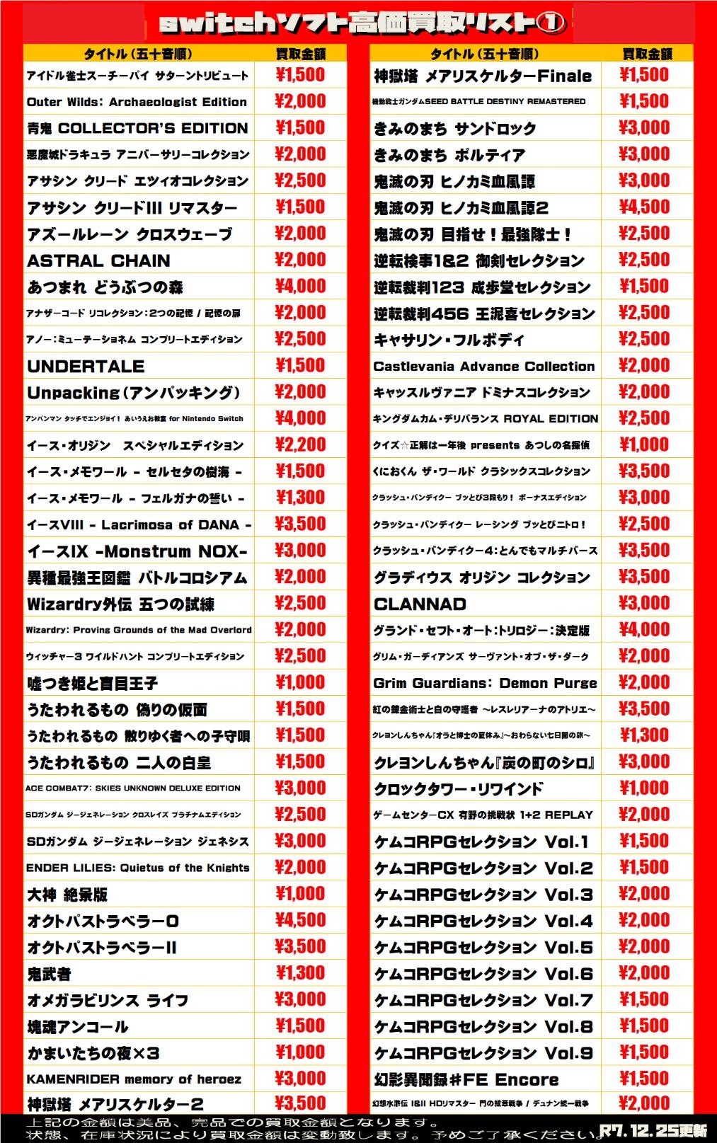 2025.12.25 買取情報 takalab_4 【Switch系ソフト】WEBチラシ更新しました!【WEBチラシ】 【Switch系ソフト】WEBチラシ更新しました!【WEBチラシ】 ※2025/12/25現在の価格となります。 在庫状況・状態によってお値段が変動いたします。予めご了承ください。 **************** こちら↓もぜひチェックしてみてくださいね♪(*´▽`*) ・最新のイベント情報はこちら ・最新の買取情報はこちら コメントを残す コメントをキャンセルメールアドレスが公開されることはありません。 ※ が付いている欄は必須項目ですコメント ※ 名前 ※ メール ※ サイト 新しいコメントをメールで通知 新しい投稿をメールで受け取る Δ