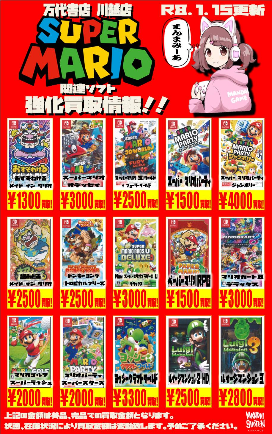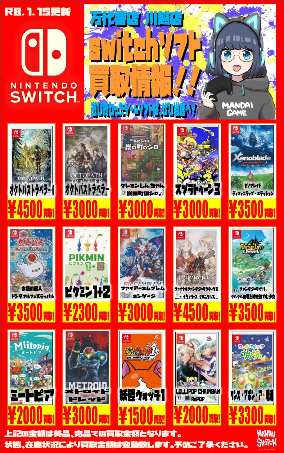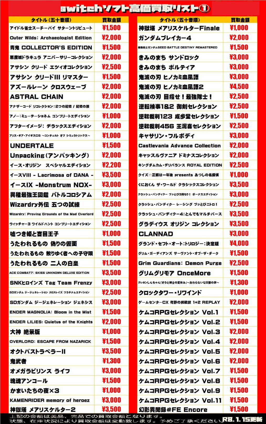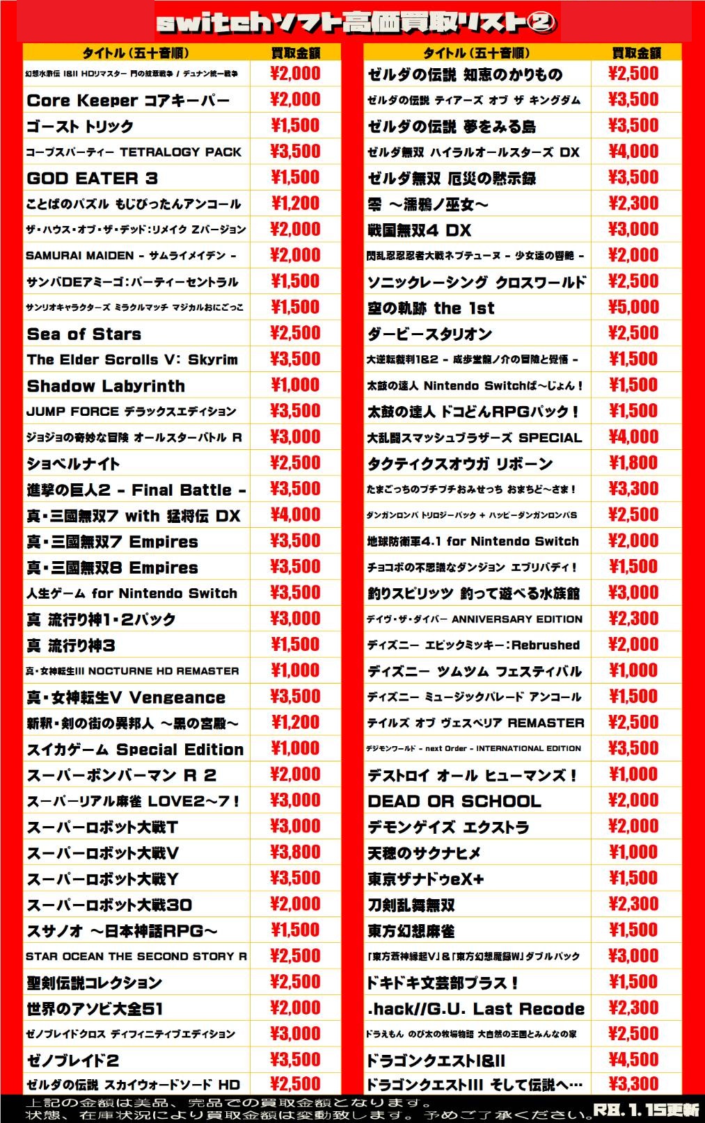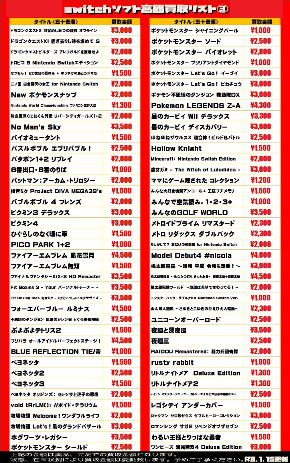 2026.01.15 買取情報 takalab_5 【Switch系ソフト】WEBチラシ更新しました!【WEBチラシ】 【Switch系ソフト】WEBチラシ更新しました!【WEBチラシ】 ※2026/1/15現在の価格となります。 在庫状況・状態によってお値段が変動いたします。予めご了承ください。 **************** こちら↓もぜひチェックしてみてくださいね♪(*´▽`*) ・最新のイベント情報はこちら ・最新の買取情報はこちら コメントを残す コメントをキャンセルメールアドレスが公開されることはありません。 ※ が付いている欄は必須項目ですコメント ※ 名前 ※ メール ※ サイト 新しいコメントをメールで通知 新しい投稿をメールで受け取る Δ