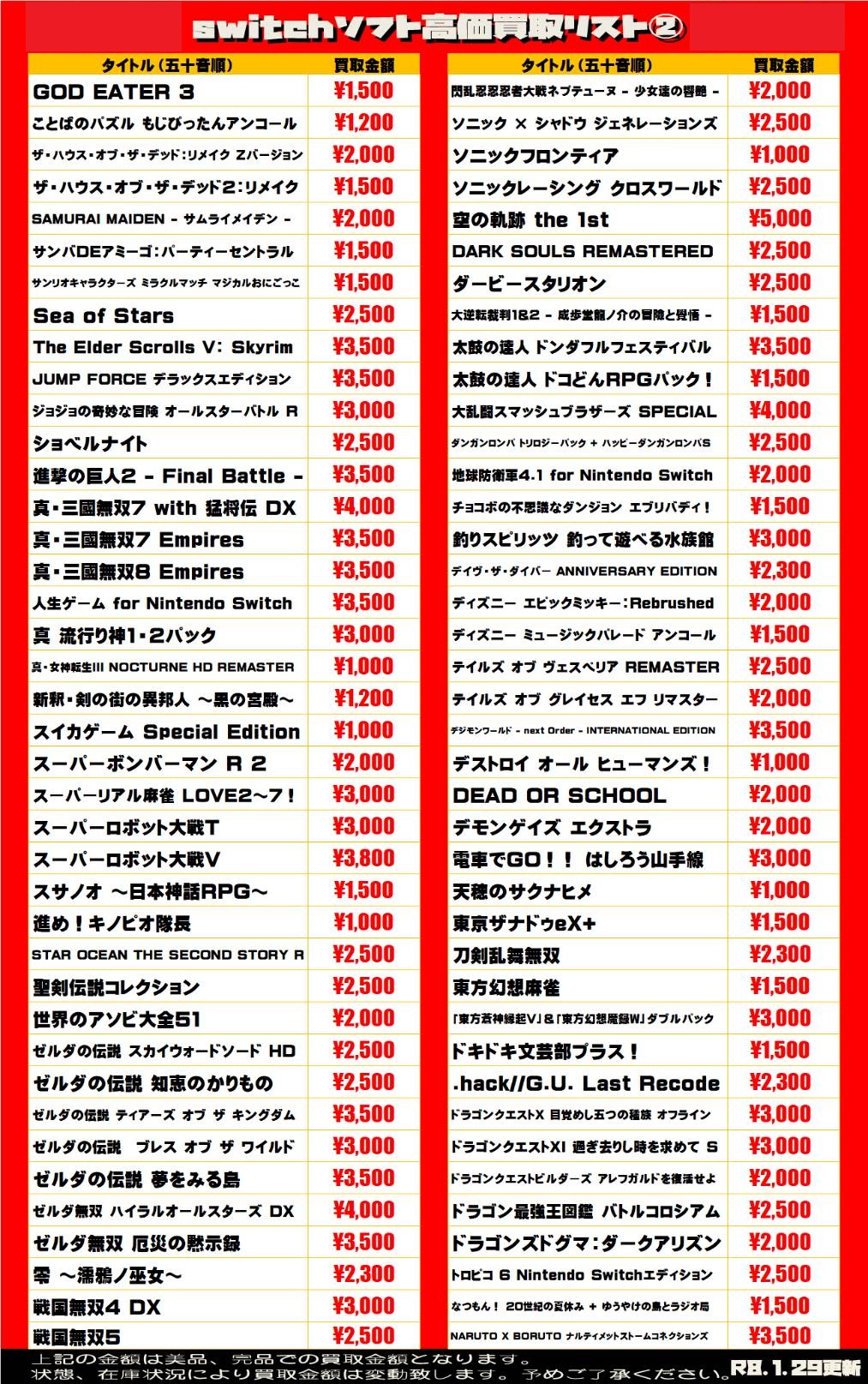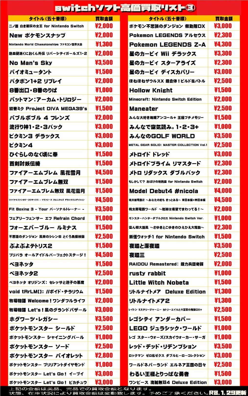 2026.01.29 買取情報 takalab_5 【Switch系ソフト】WEBチラシ更新しました!【WEBチラシ】 【Switch系ソフト】WEBチラシ更新しました!【WEBチラシ】 ※2026/1/29現在の価格となります。 在庫状況・状態によってお値段が変動いたします。予めご了承ください。 **************** こちら↓もぜひチェックしてみてくださいね♪(*´▽`*) ・最新のイベント情報はこちら ・最新の買取情報はこちら コメントを残す コメントをキャンセルメールアドレスが公開されることはありません。 ※ が付いている欄は必須項目ですコメント ※ 名前 ※ メール ※ サイト 新しいコメントをメールで通知 新しい投稿をメールで受け取る Δ