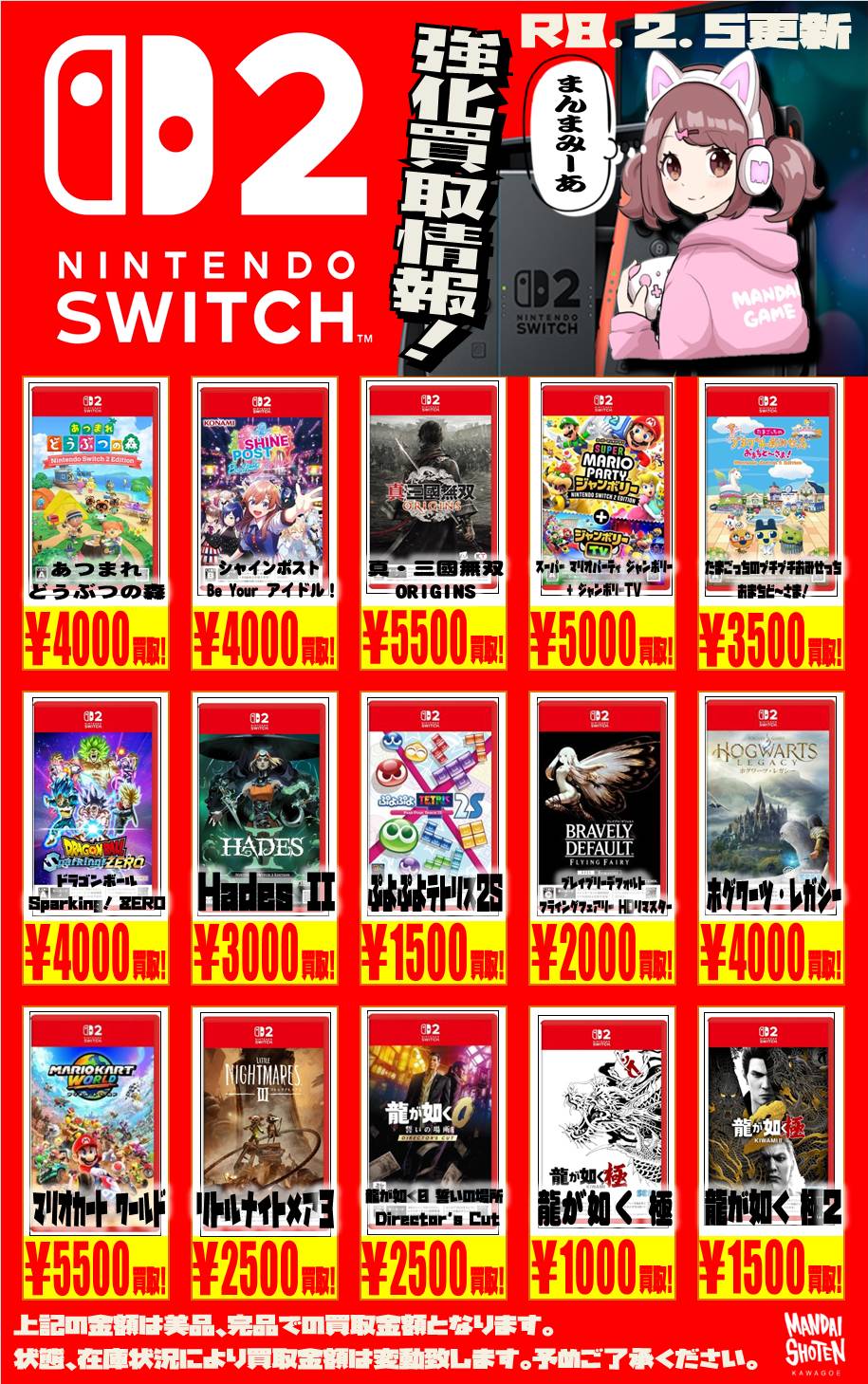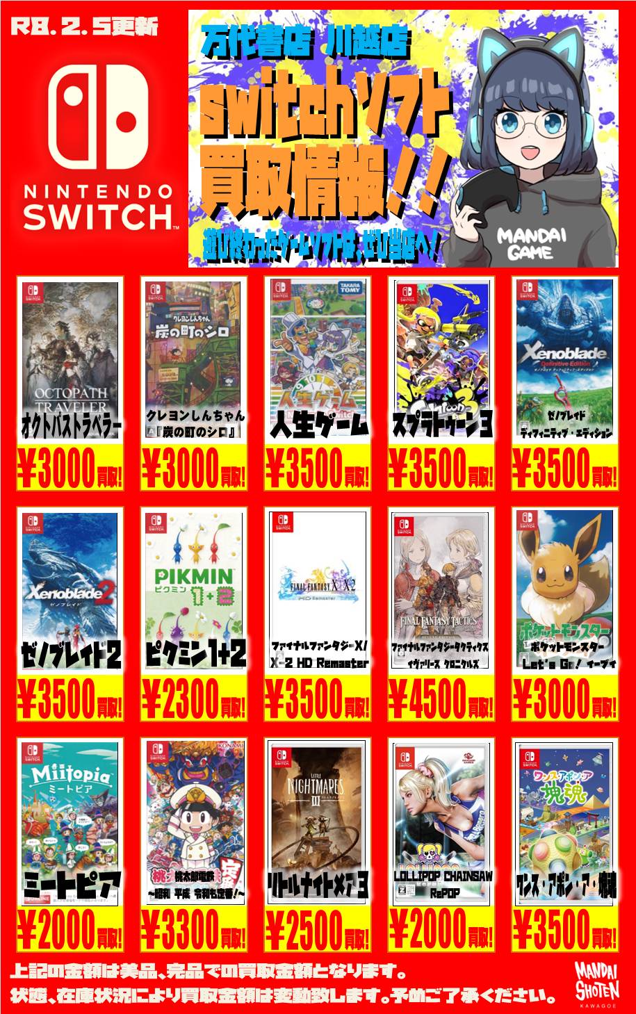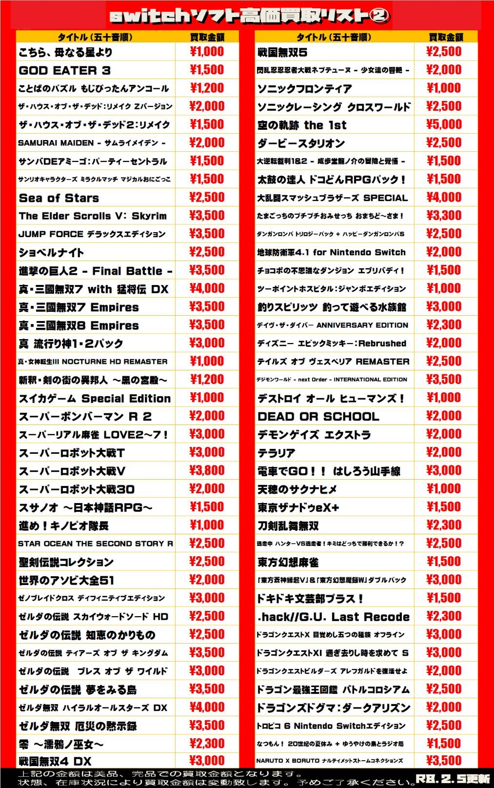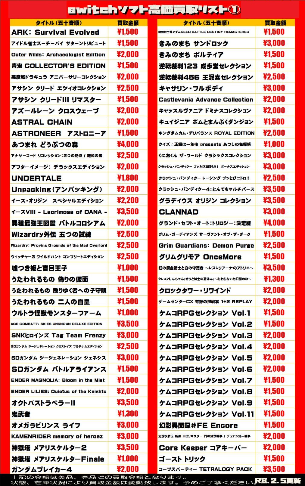 2026.02.05 買取情報 takalab_5 【Switch系ソフト】WEBチラシ更新しました!【WEBチラシ】 【Switch系ソフト】WEBチラシ更新しました!【WEBチラシ】 ※2026/2/5現在の価格となります。 在庫状況・状態によってお値段が変動いたします。予めご了承ください。 **************** こちら↓もぜひチェックしてみてくださいね♪(*´▽`*) ・最新のイベント情報はこちら ・最新の買取情報はこちら コメントを残す コメントをキャンセルメールアドレスが公開されることはありません。 ※ が付いている欄は必須項目ですコメント ※ 名前 ※ メール ※ サイト 新しいコメントをメールで通知 新しい投稿をメールで受け取る Δ