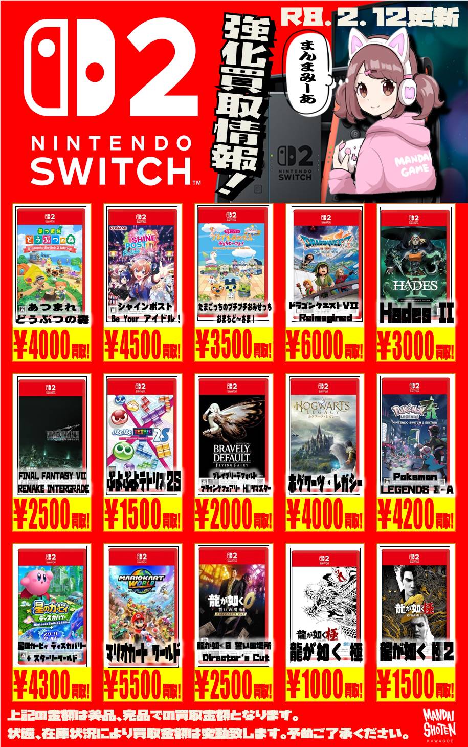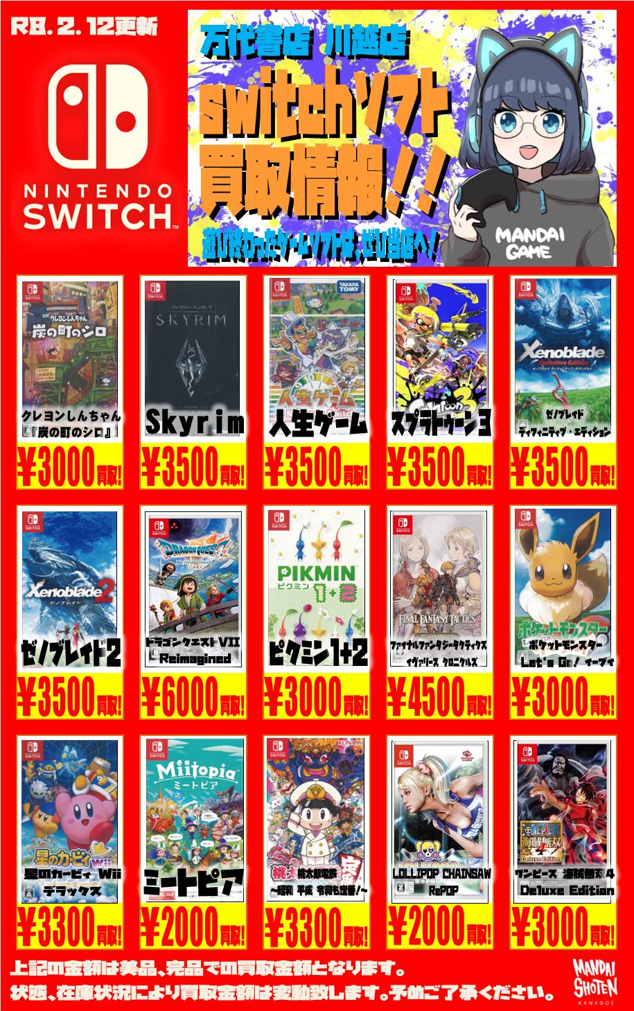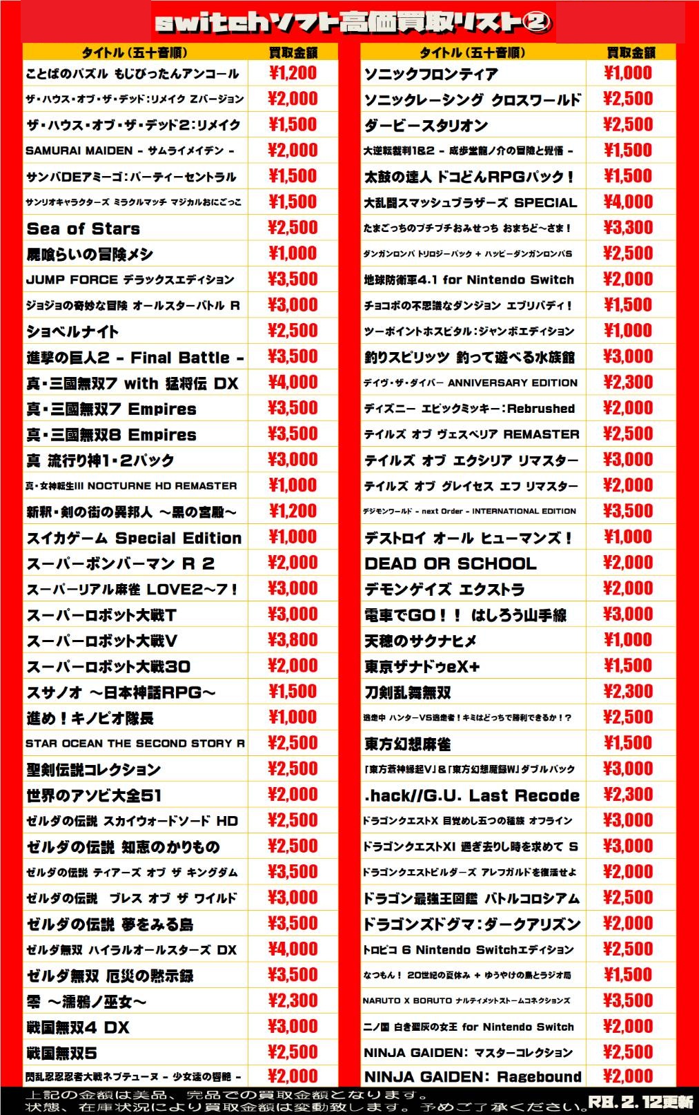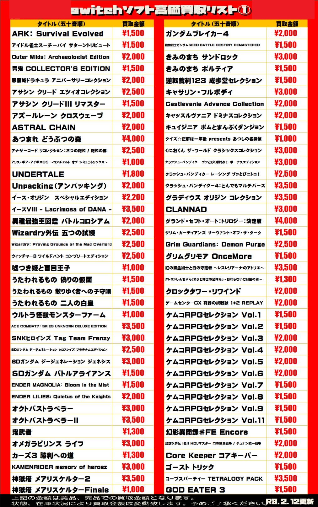 2026.02.12 買取情報 takalab_5 【Switch系ソフト】WEBチラシ更新しました!【WEBチラシ】 【Switch系ソフト】WEBチラシ更新しました!【WEBチラシ】 ※2026/2/12現在の価格となります。 在庫状況・状態によってお値段が変動いたします。予めご了承ください。 **************** こちら↓もぜひチェックしてみてくださいね♪(*´▽`*) ・最新のイベント情報はこちら ・最新の買取情報はこちら コメントを残す コメントをキャンセルメールアドレスが公開されることはありません。 ※ が付いている欄は必須項目ですコメント ※ 名前 ※ メール ※ サイト 新しいコメントをメールで通知 新しい投稿をメールで受け取る Δ