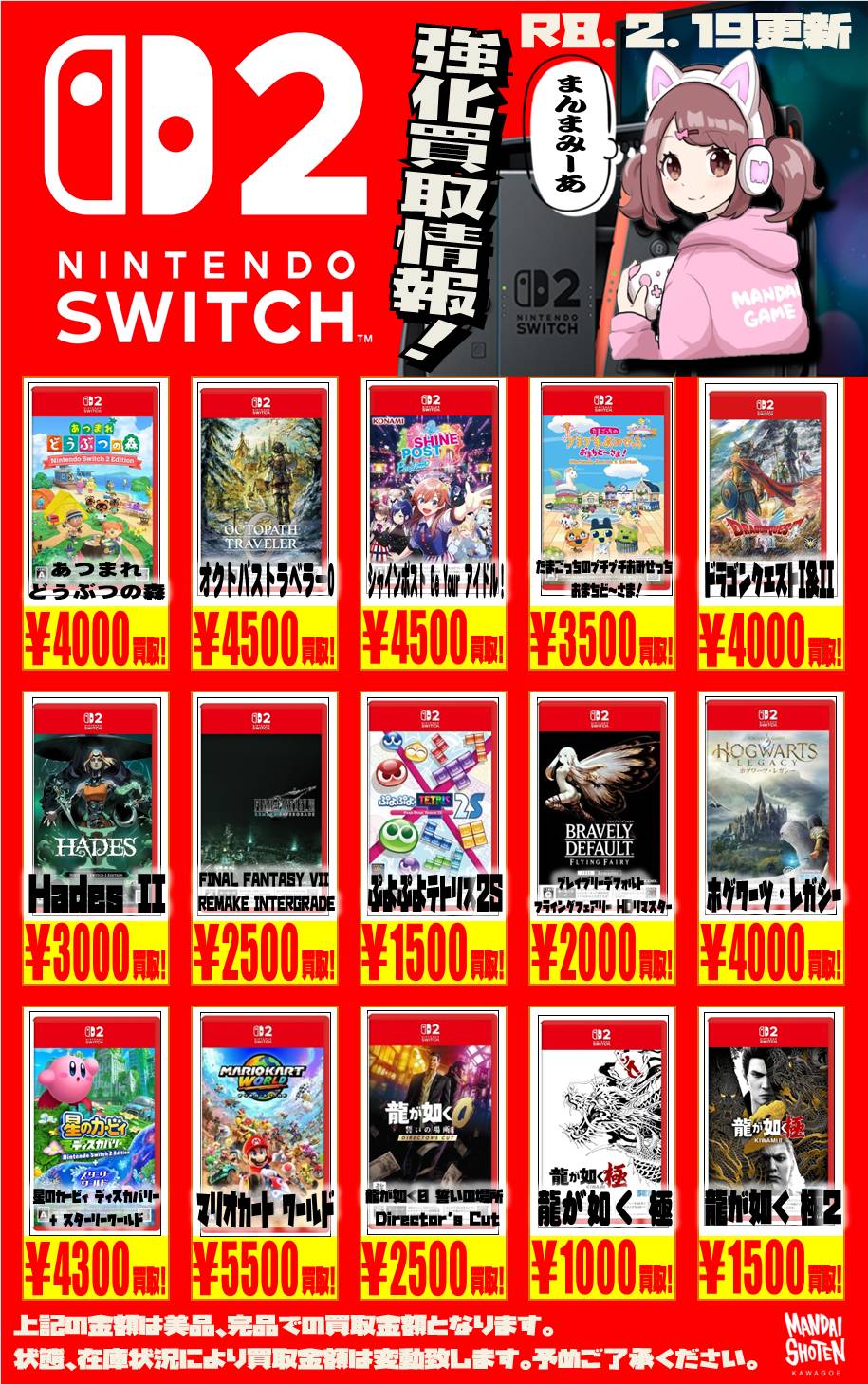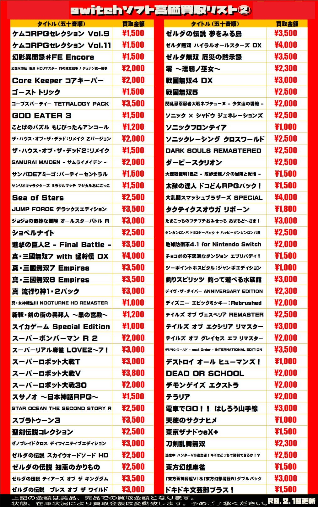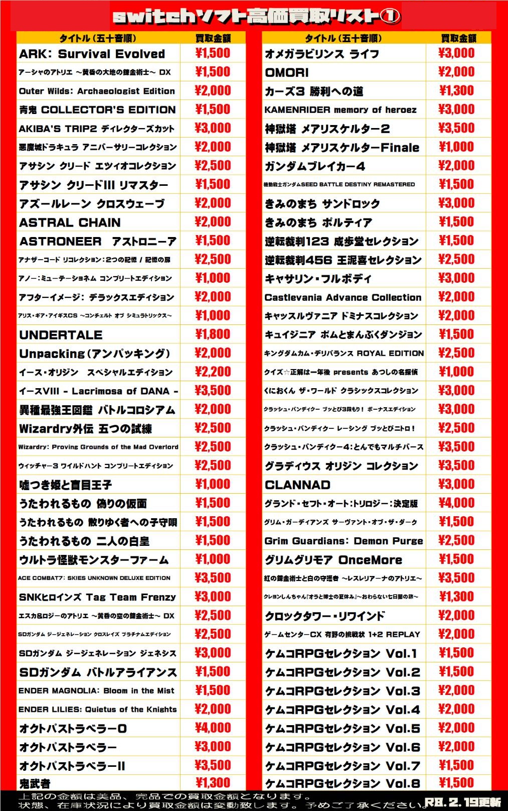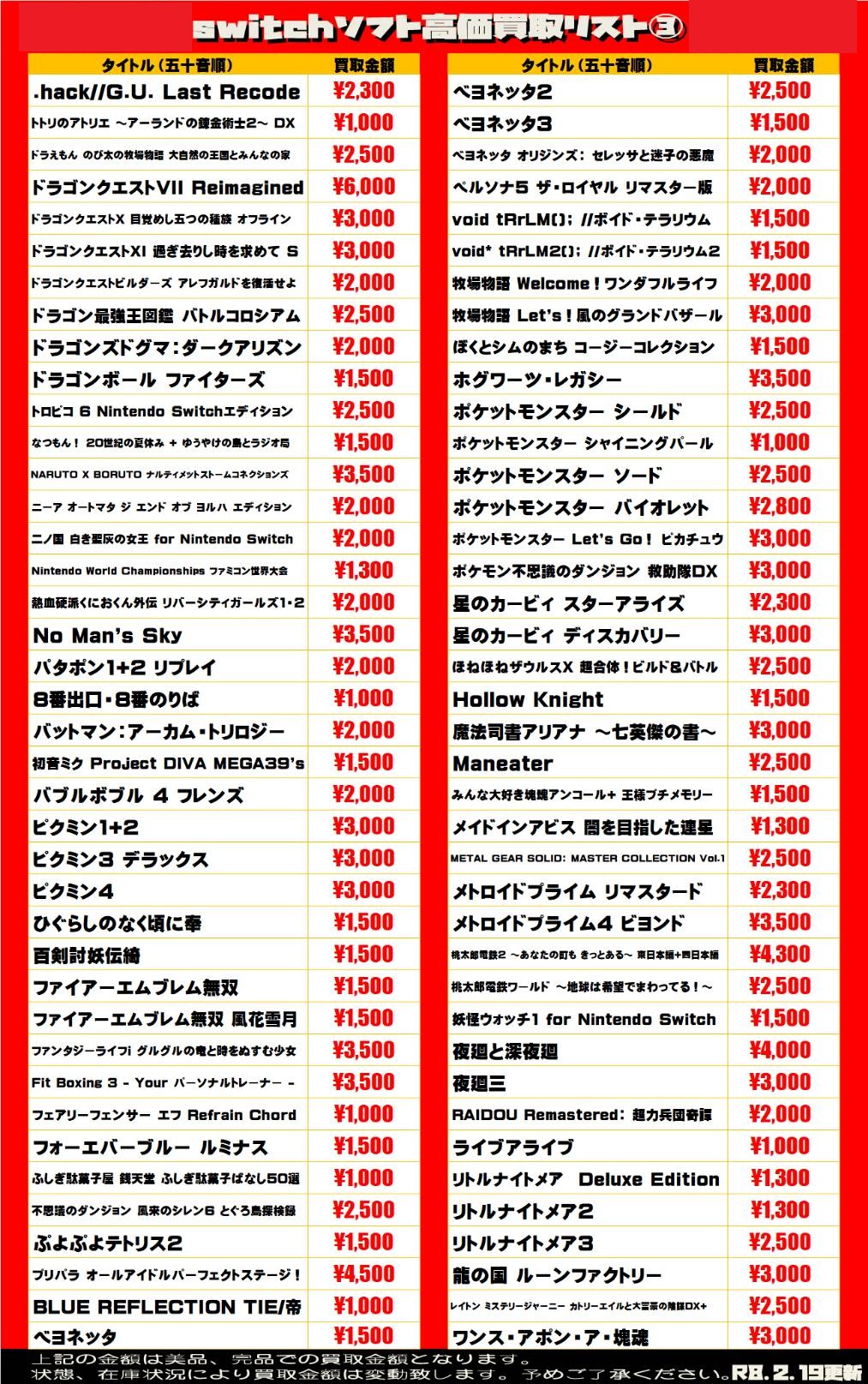 2026.02.19 買取情報 takalab_5 【Switch系ソフト】WEBチラシ更新しました!【WEBチラシ】 【Switch系ソフト】WEBチラシ更新しました!【WEBチラシ】 ※2026/2/19現在の価格となります。 在庫状況・状態によってお値段が変動いたします。予めご了承ください。 **************** こちら↓もぜひチェックしてみてくださいね♪(*´▽`*) ・最新のイベント情報はこちら ・最新の買取情報はこちら コメントを残す コメントをキャンセルメールアドレスが公開されることはありません。 ※ が付いている欄は必須項目ですコメント ※ 名前 ※ メール ※ サイト 新しいコメントをメールで通知 新しい投稿をメールで受け取る Δ