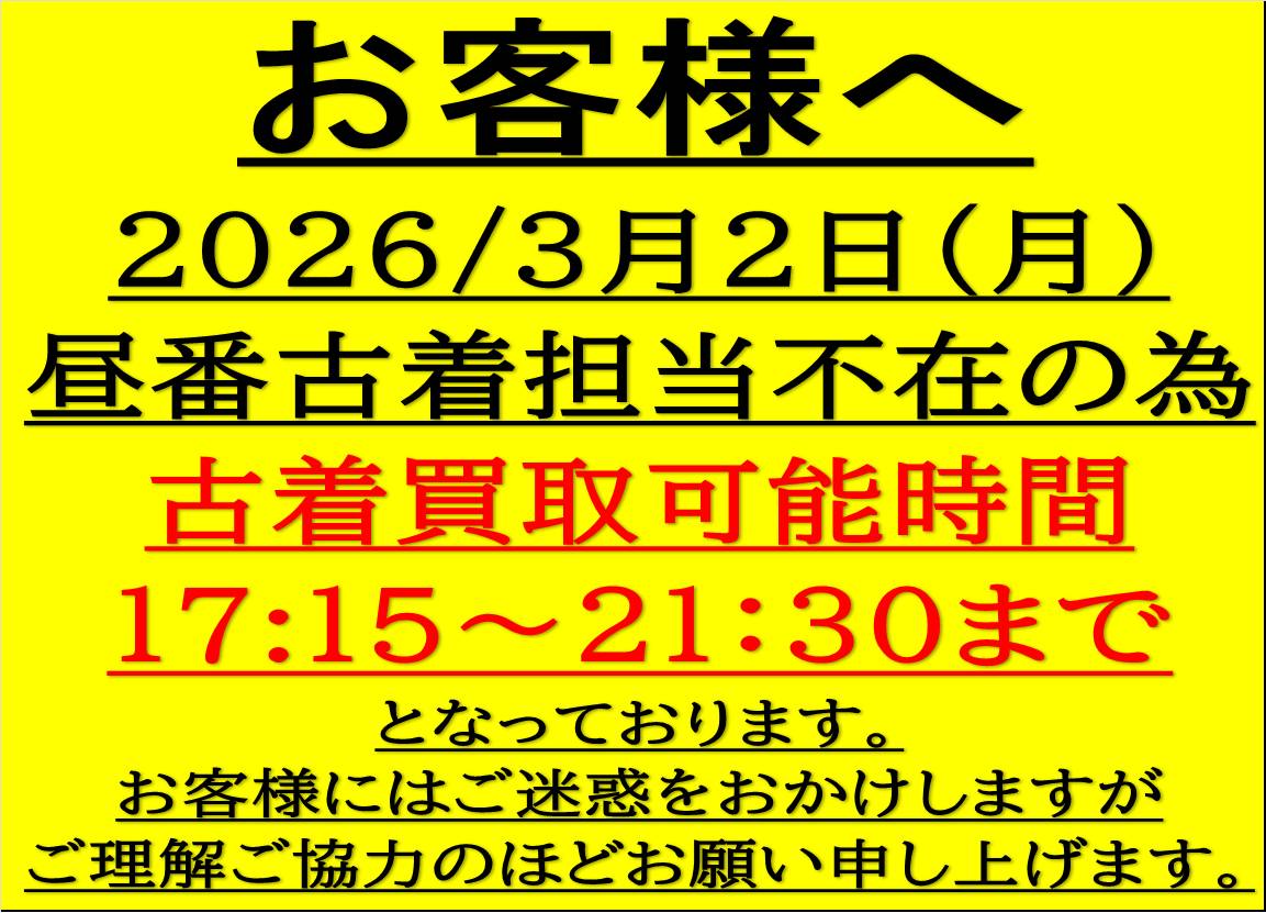 2026.02.28 お知らせ・ご案内 takalab_1 ■3/2 古着部門担当不在の為買取時間変更があります■ 古着部門担当不在の為買取時間変更があります コメントを残す コメントをキャンセルメールアドレスが公開されることはありません。 ※ が付いている欄は必須項目ですコメント ※ 名前 ※ メール ※ サイト 新しいコメントをメールで通知 新しい投稿をメールで受け取る Δ