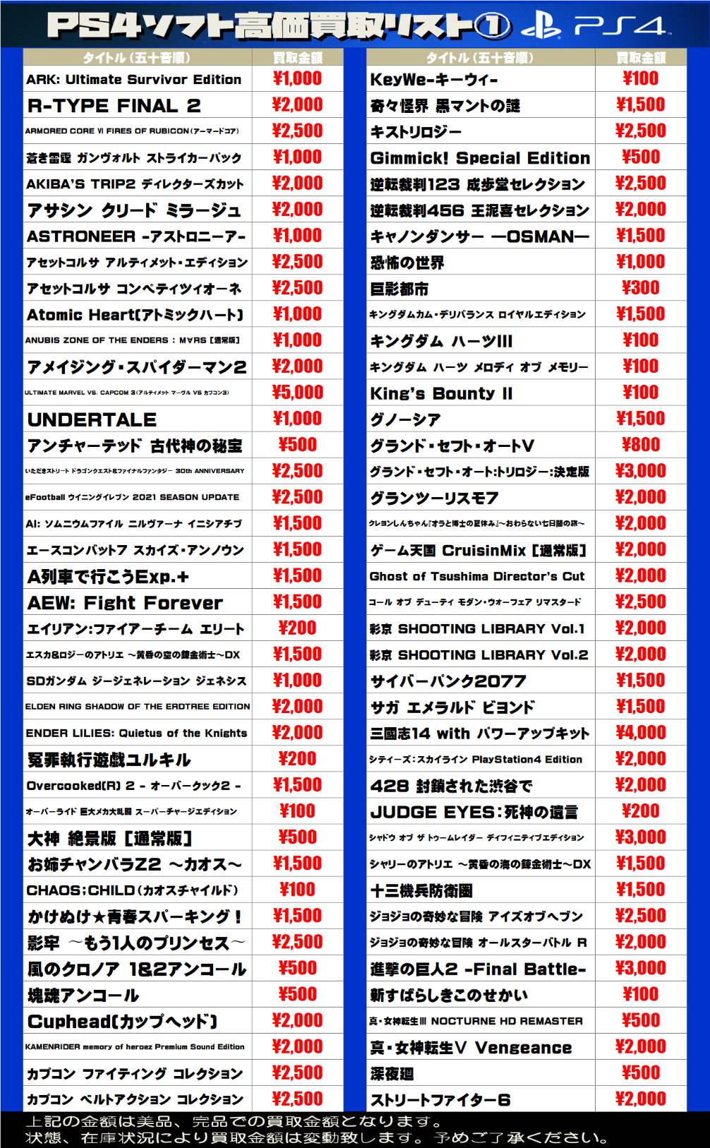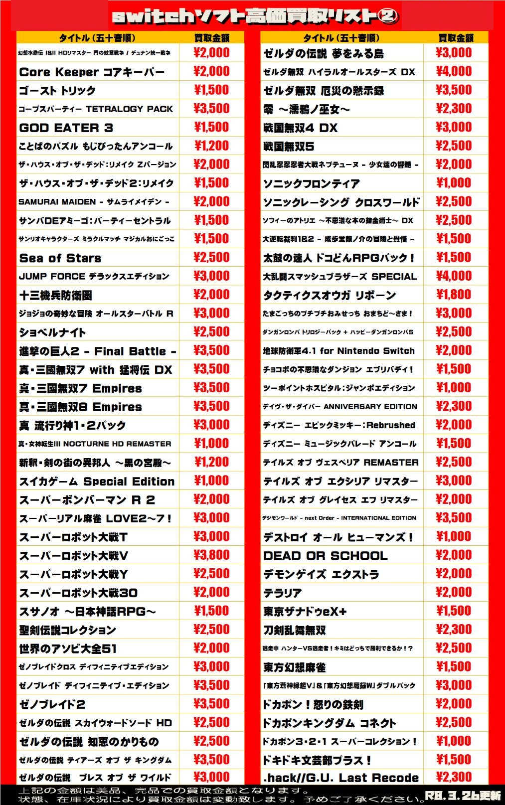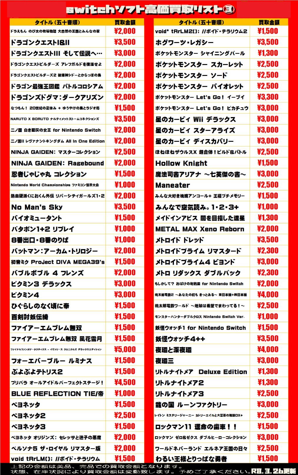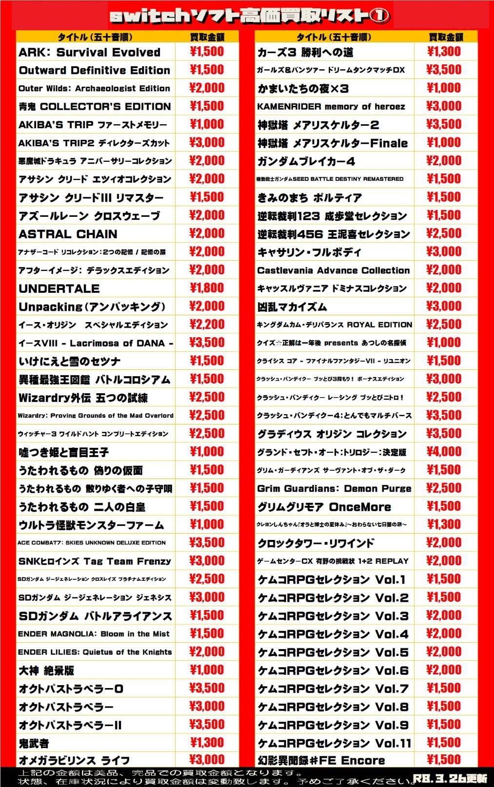 2026.03.26 買取情報 takalab_5 【SONY系ソフト】WEBチラシ更新しました!【Switch系ソフト】WEBチラシ更新しました!【WEBチラシ】 【SONY系ソフト】WEBチラシ更新しました!【WEBチラシ】 【Switch系ソフト】WEBチラシ更新しました!【WEBチラシ】 ※2026/3/26現在の価格となります。 在庫状況・状態によってお値段が変動いたします。予めご了承ください。 **************** こちら↓もぜひチェックしてみてくださいね♪(*´▽`*) ・最新のイベント情報はこちら ・最新の買取情報はこちら コメントを残す コメントをキャンセルメールアドレスが公開されることはありません。 ※ が付いている欄は必須項目ですコメント ※ 名前 ※ メール ※ サイト 新しいコメントをメールで通知 新しい投稿をメールで受け取る Δ
