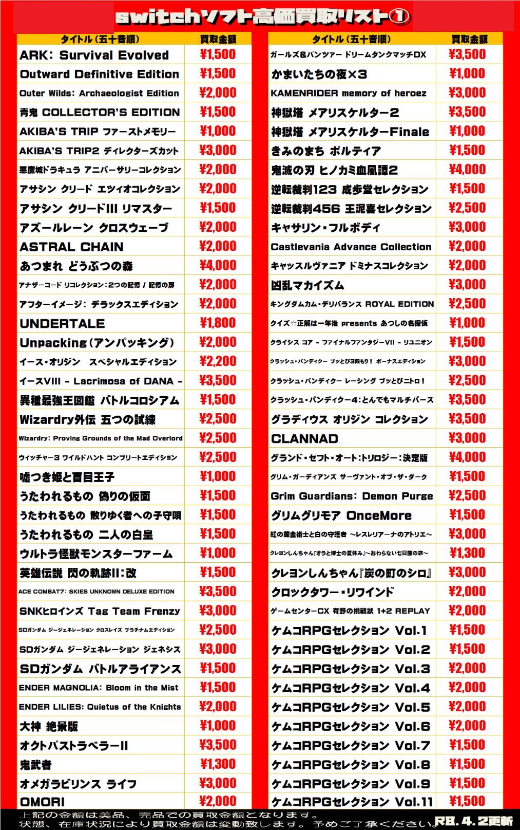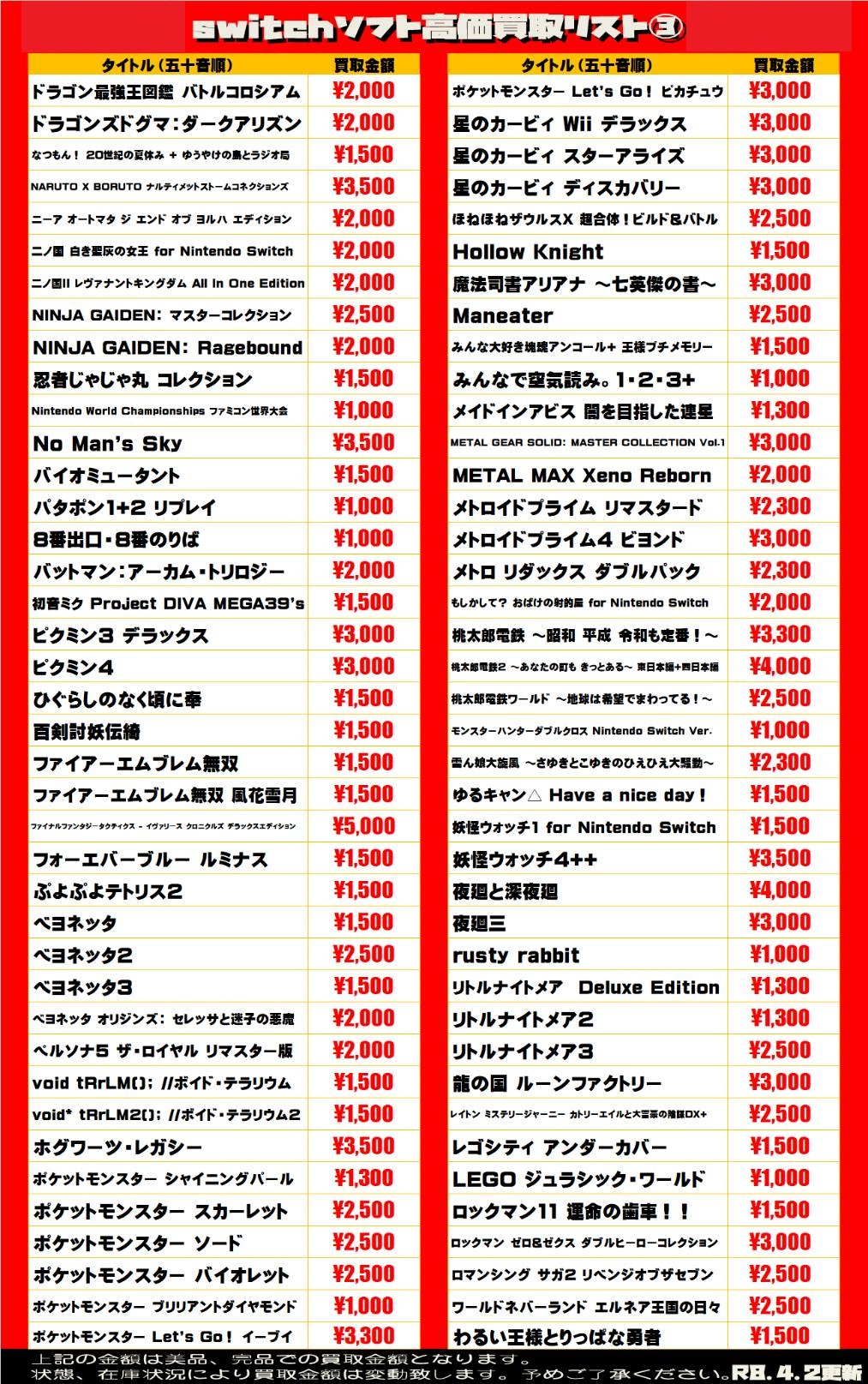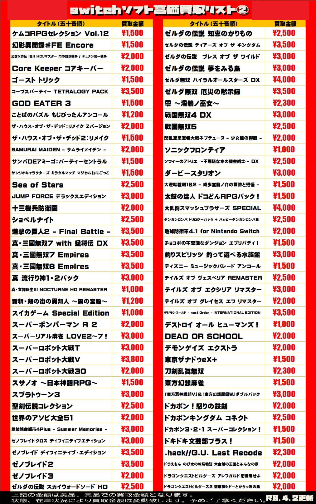 2026.04.02 買取情報 takalab_5 【Switch系ソフト】WEBチラシ更新しました!【ゲームハード】WEBチラシ更新しました!【WEBチラシ】 【Switch系ソフト】WEBチラシ更新しました!【WEBチラシ】 【ゲームハード】WEBチラシ更新しました! ※2026/4/2現在の価格となります。 在庫状況・状態によってお値段が変動いたします。予めご了承ください。 **************** こちら↓もぜひチェックしてみてくださいね♪(*´▽`*) ・最新のイベント情報はこちら ・最新の買取情報はこちら コメントを残す コメントをキャンセルメールアドレスが公開されることはありません。 ※ が付いている欄は必須項目ですコメント ※ 名前 ※ メール ※ サイト 新しいコメントをメールで通知 新しい投稿をメールで受け取る Δ