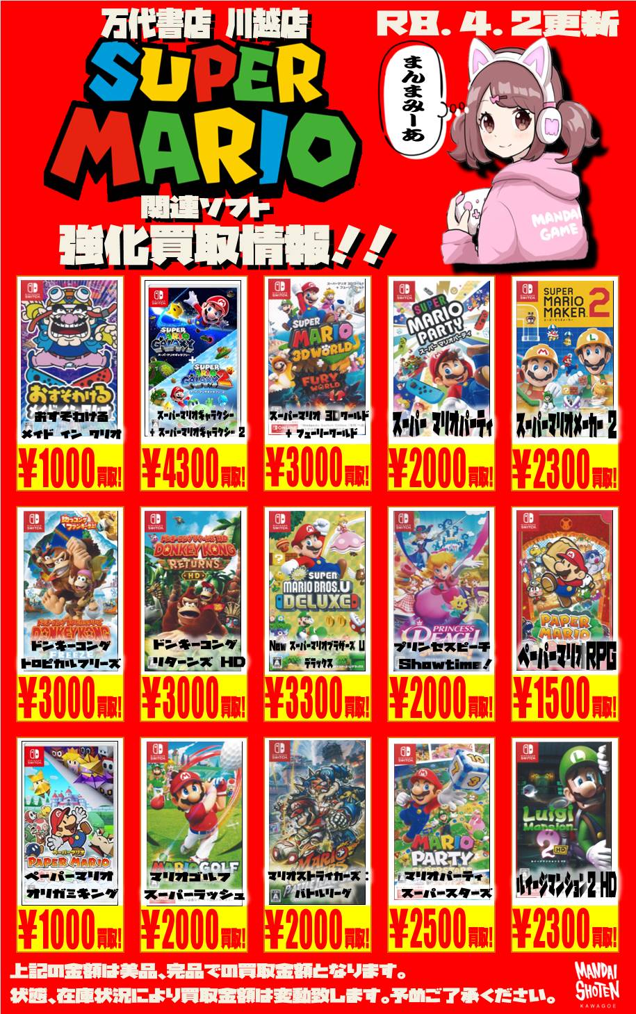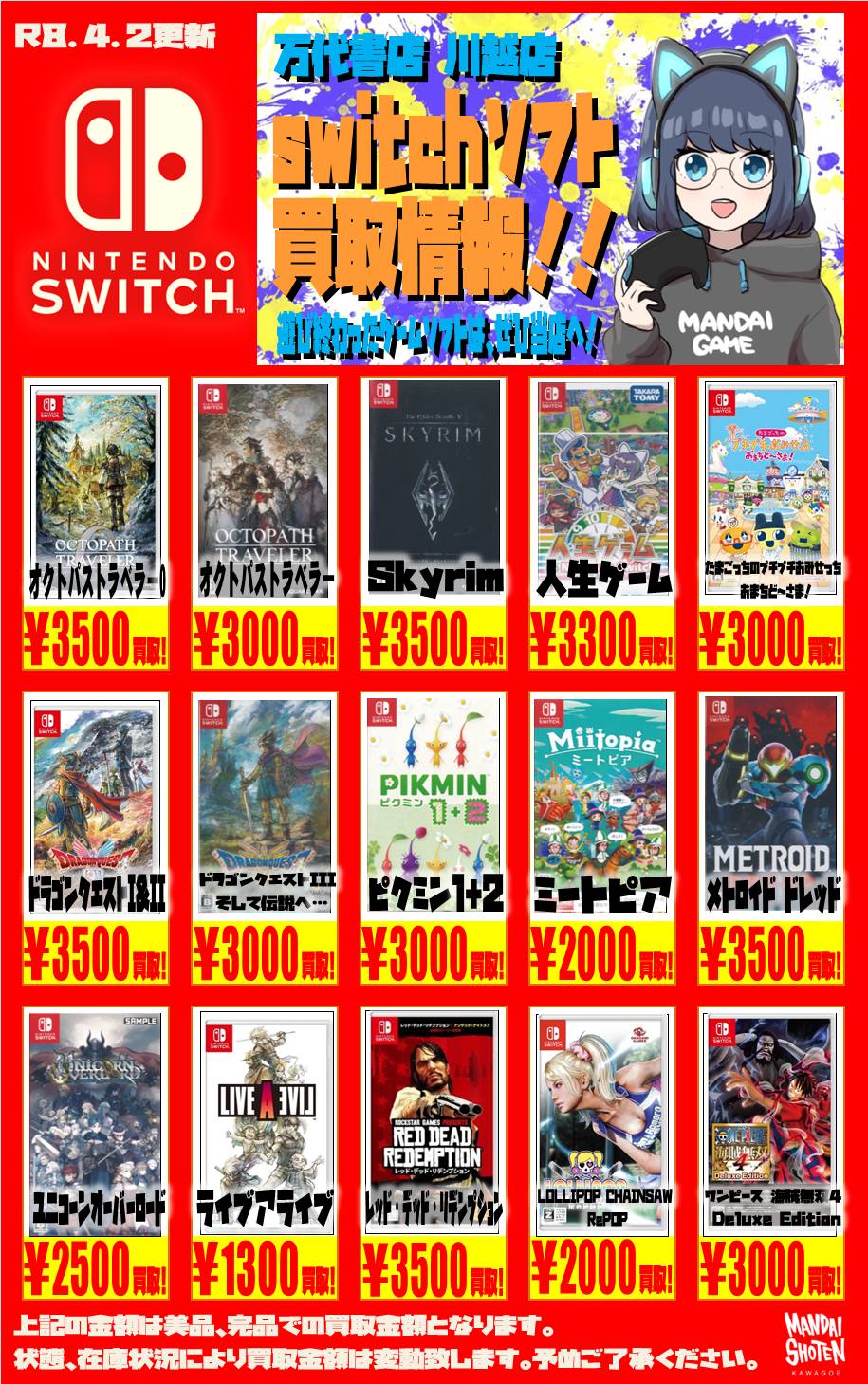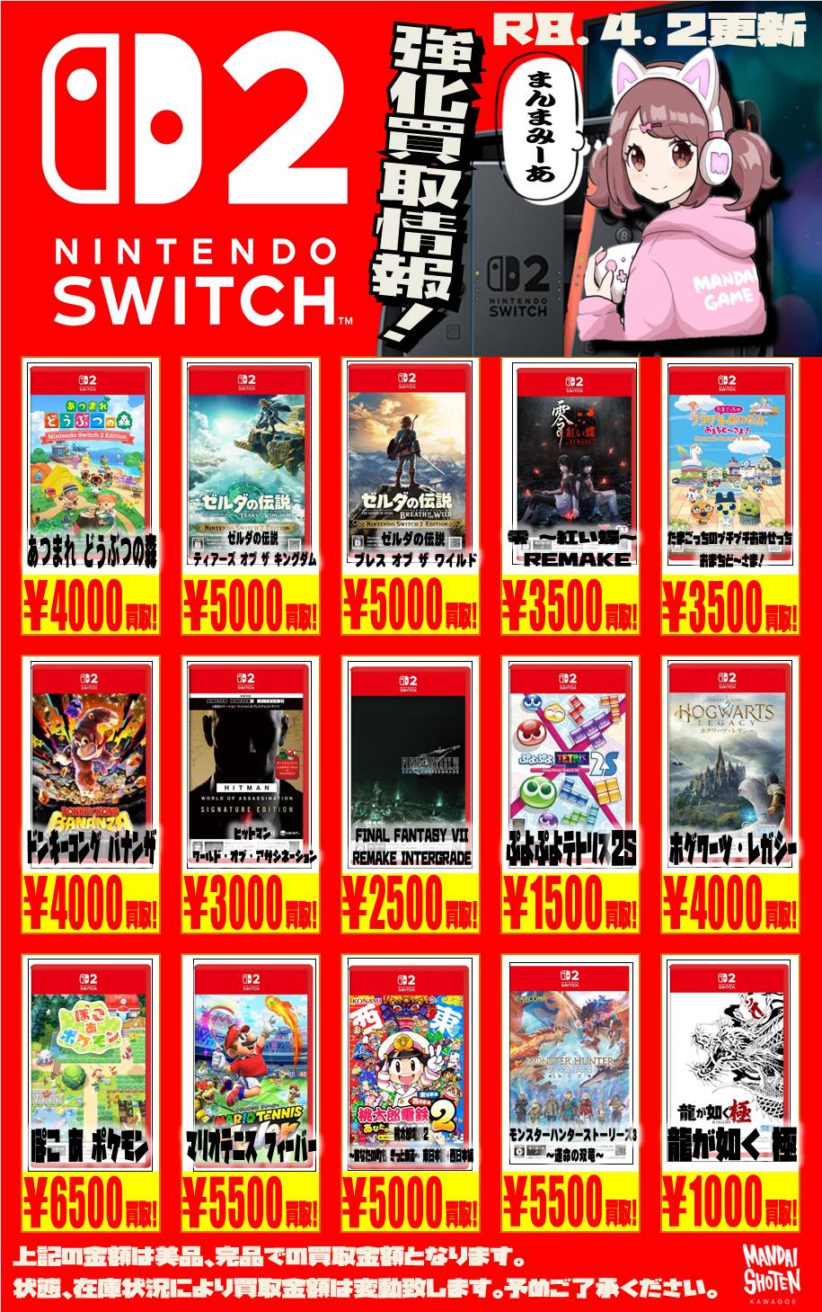 2026.04.02 買取情報 takalab_5 【Switch系ソフト】WEBチラシ更新しました!【ゲームハード】WEBチラシ更新しました!【WEBチラシ】 【Switch系ソフト】WEBチラシ更新しました!【WEBチラシ】 【ゲームハード】WEBチラシ更新しました! ※2026/4/2現在の価格となります。 在庫状況・状態によってお値段が変動いたします。予めご了承ください。 **************** こちら↓もぜひチェックしてみてくださいね♪(*´▽`*) ・最新のイベント情報はこちら ・最新の買取情報はこちら コメントを残す コメントをキャンセルメールアドレスが公開されることはありません。 ※ が付いている欄は必須項目ですコメント ※ 名前 ※ メール ※ サイト 新しいコメントをメールで通知 新しい投稿をメールで受け取る Δ