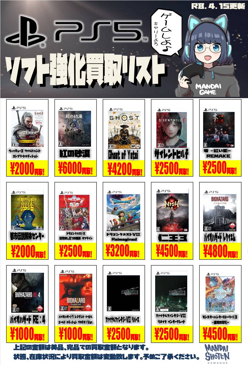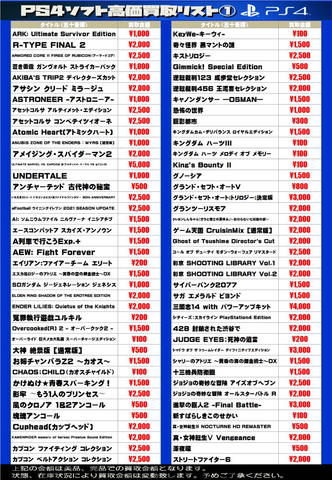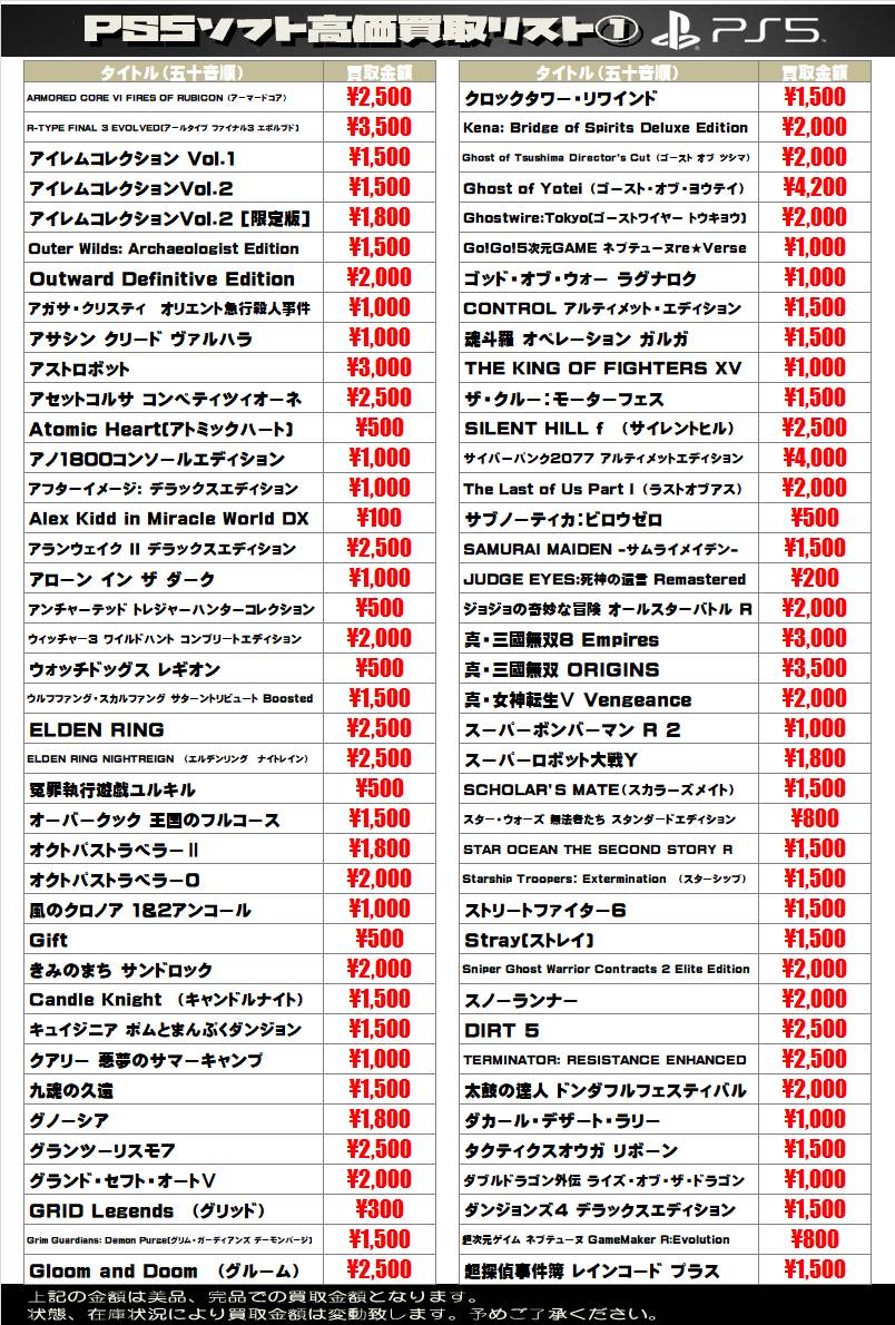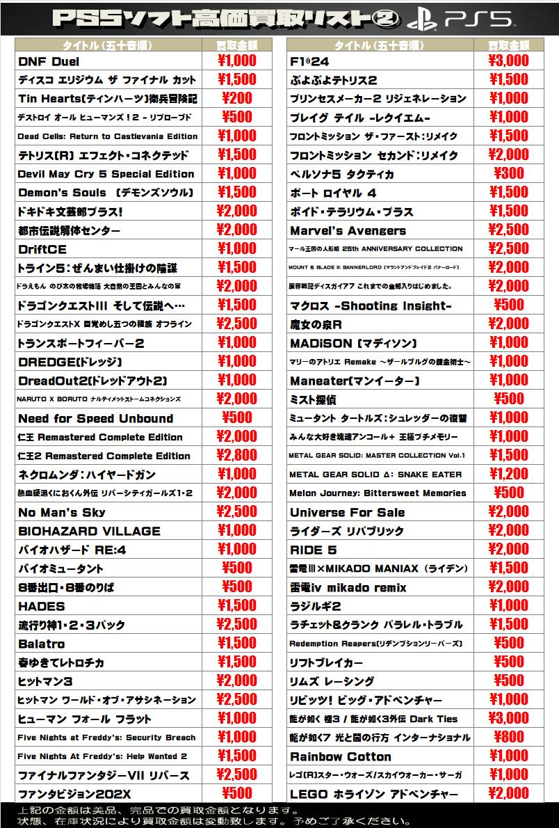 2026.04.16 買取情報 takalab_3 【SONY系ソフト】WEBチラシ更新しました!【WEBチラシ】 【SONY系ソフト】WEBチラシ更新しました!【WEBチラシ】 ※2026/4/16現在の価格となります。 在庫状況・状態によってお値段が変動いたします。予めご了承ください。 **************** こちら↓もぜひチェックしてみてくださいね♪(*´▽`*) ・最新のイベント情報はこちら ・最新の買取情報はこちら コメントを残す コメントをキャンセルメールアドレスが公開されることはありません。 ※ が付いている欄は必須項目ですコメント ※ 名前 ※ メール ※ サイト 新しいコメントをメールで通知 新しい投稿をメールで受け取る Δ